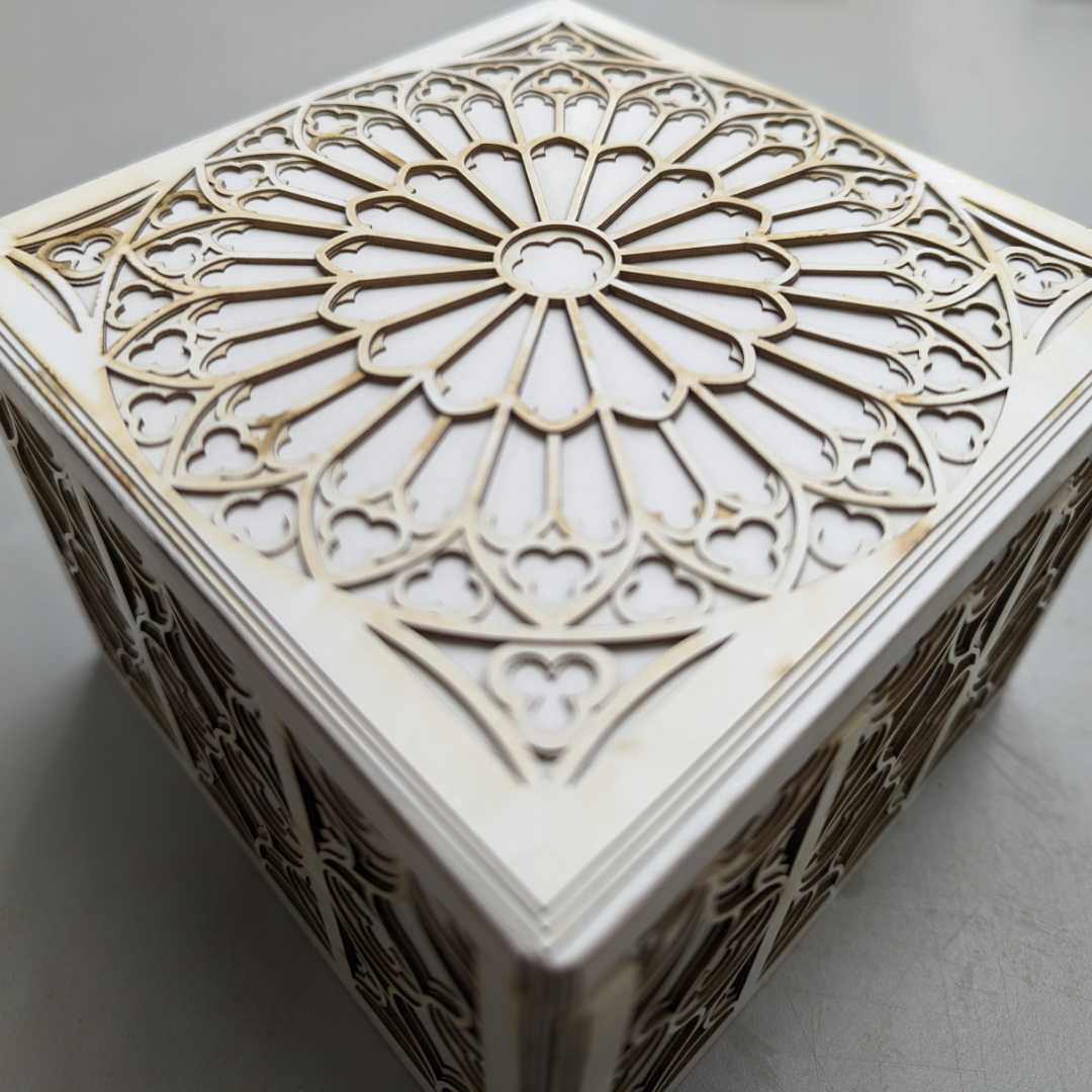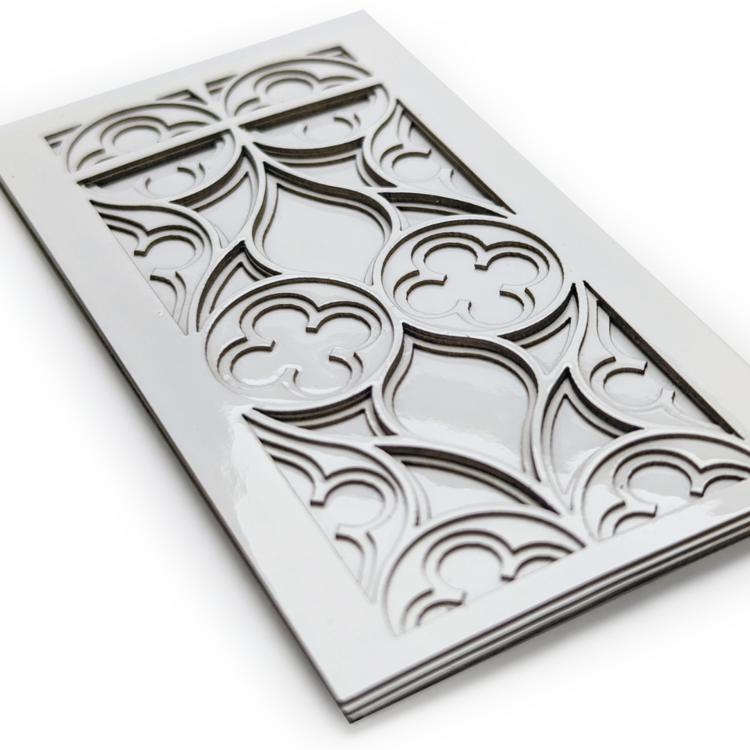 True beauty often lies in the mastery of complexity—the intersection of technical rigour, material wisdom, and creative intuition. Inspired by the soaring intricate geometries of Gothic architecture, this series was born from a desire to achieve the impossible at a miniature scale. When traditional woodgrain proved too volatile for such delicate filigree, I turned to a high-density cellulose composite. This compliant yet resilient medium allows for the execution of lace-like detail that timber simply cannot sustain, bridging the gap between ecological integrity and structural defiance.