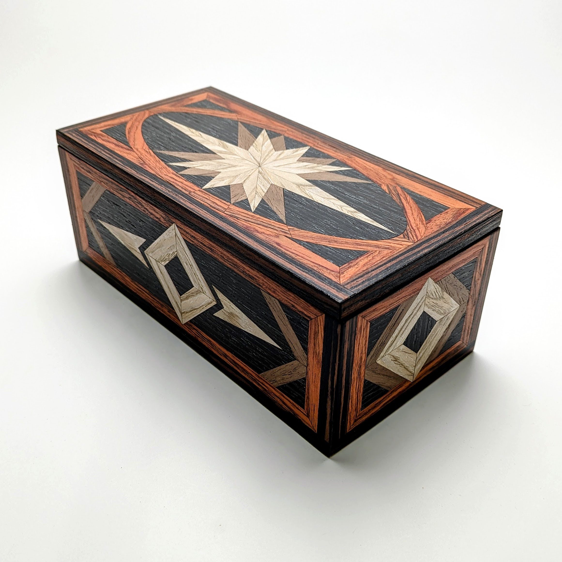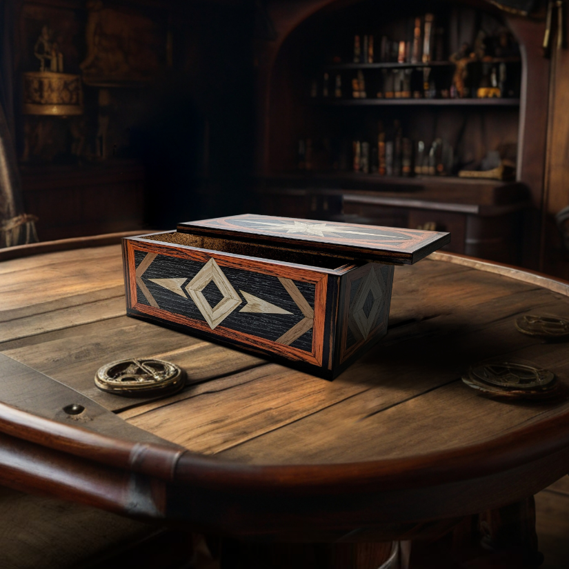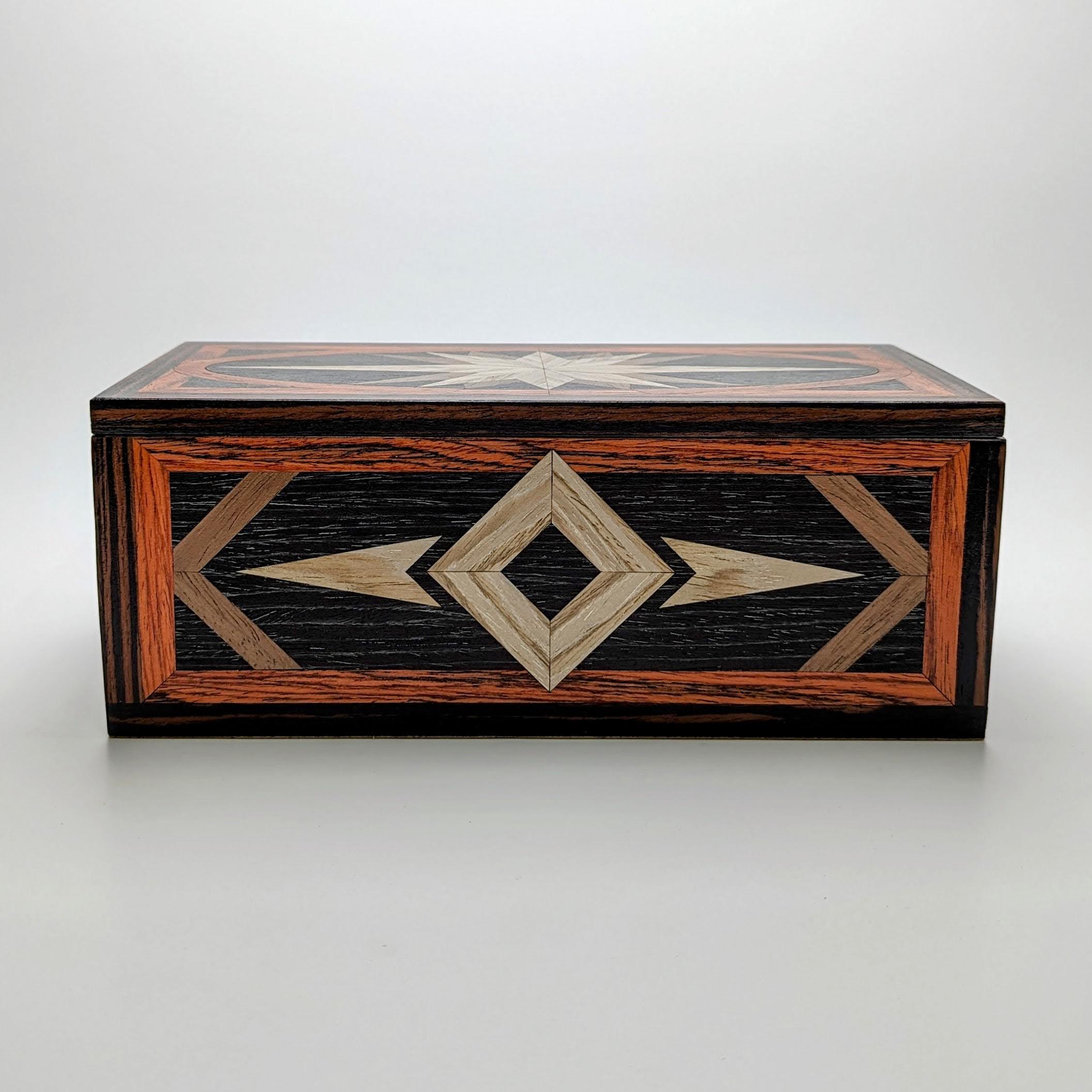 This rectangular marquetry box is designed for those who appreciate the finer details. The lift off lid features a hand-inlaid, elongated starburst set within an elegant vaulted frame, suggesting the expansive horizon of a grand adventure. The geometric diamond and chevron motifs continue across the side panels, creating a cohesive piece of functional art.