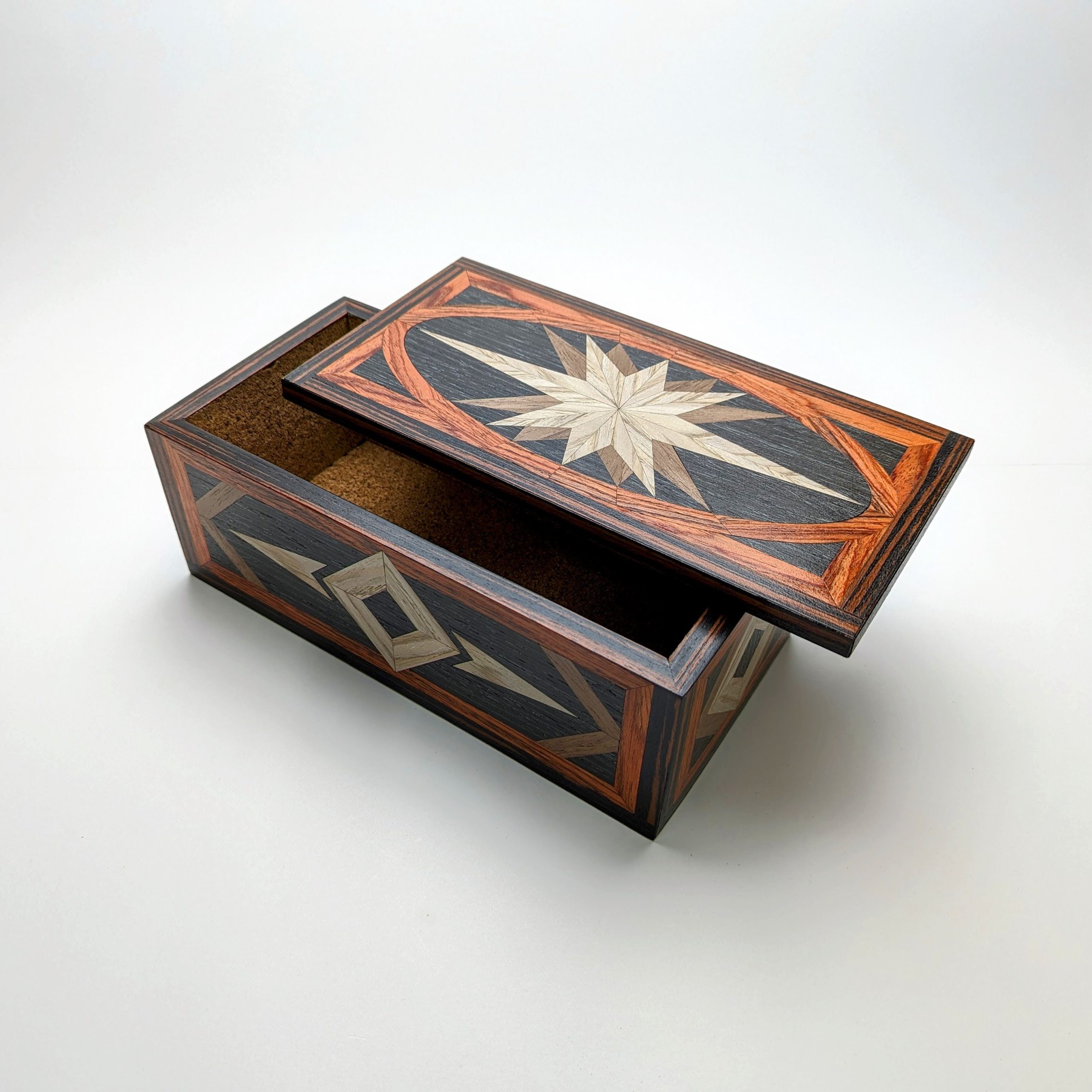 Artistry meets utility in this stunning handmade wood inlay box. Featuring a dramatic elongated starburst and architectural framing, this piece celebrates the natural beauty of contrasting grain patterns. With a protective cork-lined interior and a striking geometric exterior, it serves as a bold statement piece for the modern home.