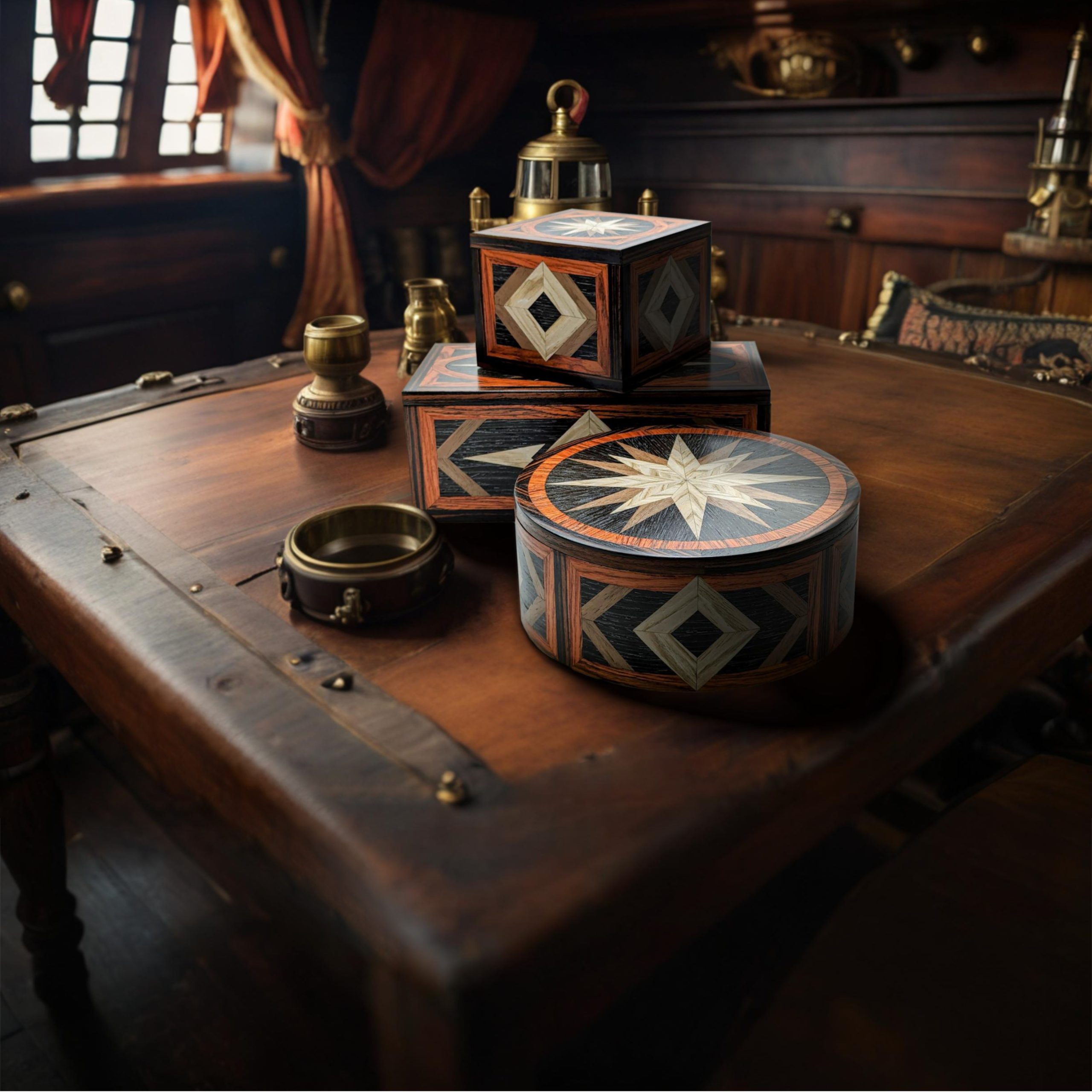 The lift off lid is fully removable and features a marquetry compass design, while the sides are inspired by nautical carpentry demonstrating skilled craftsmanship.