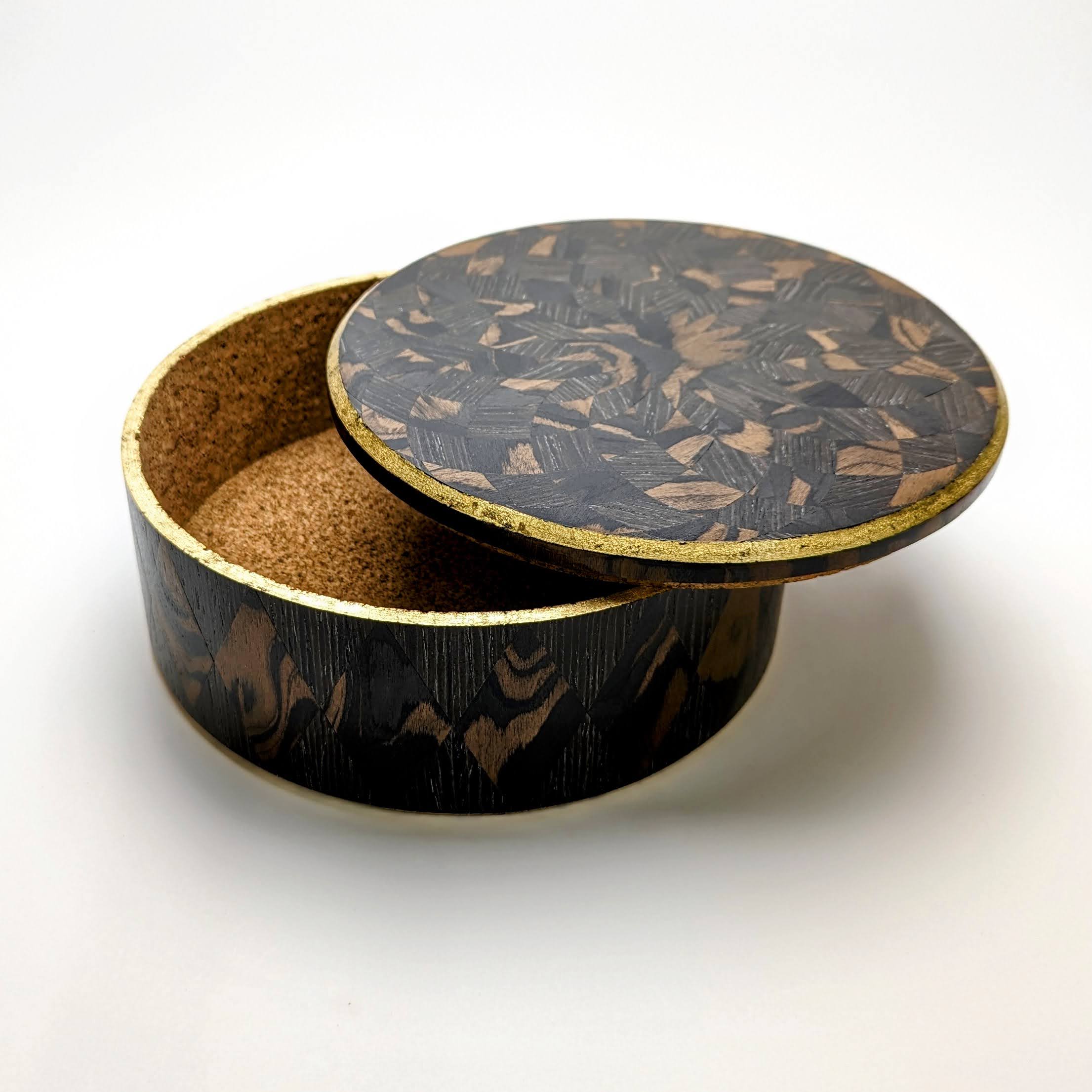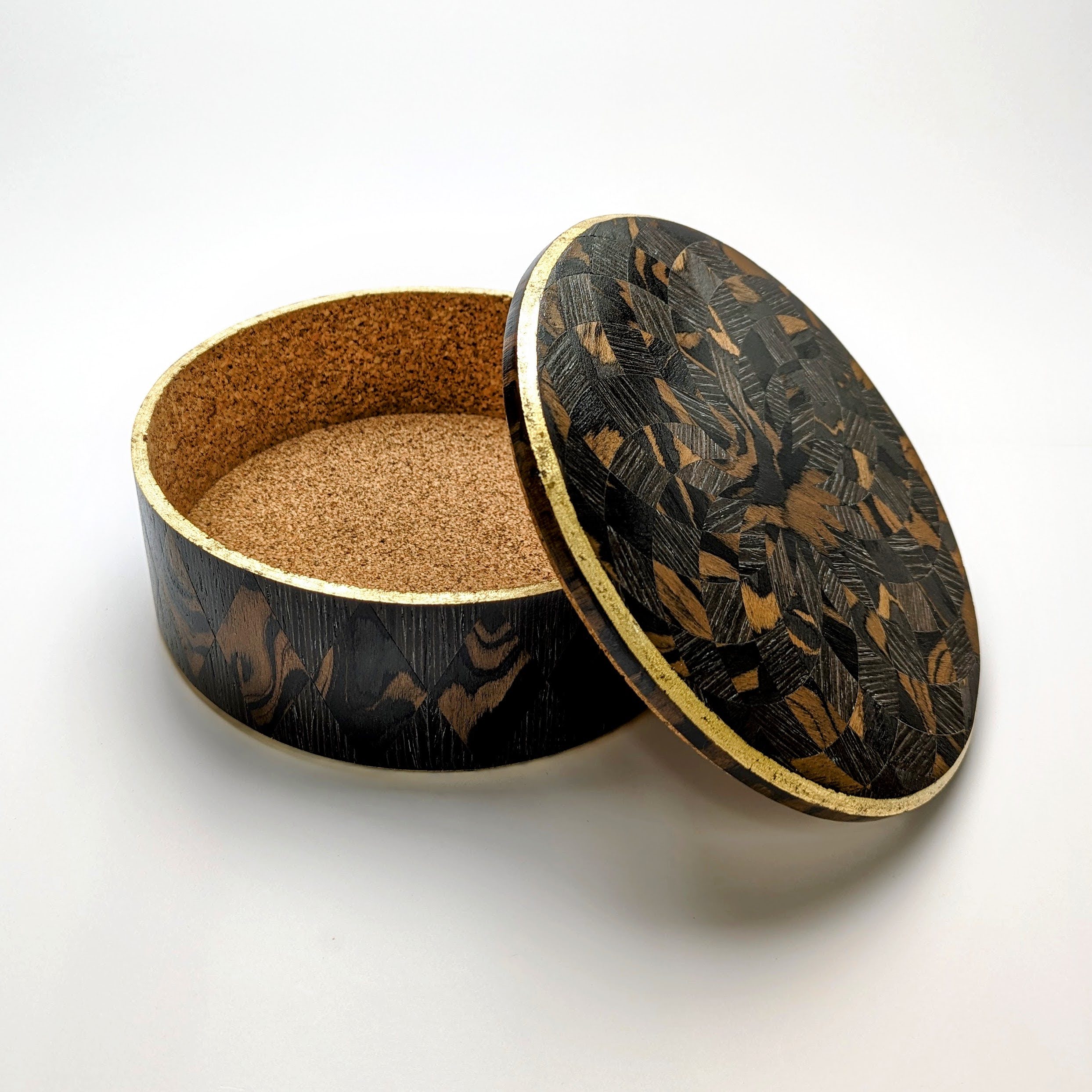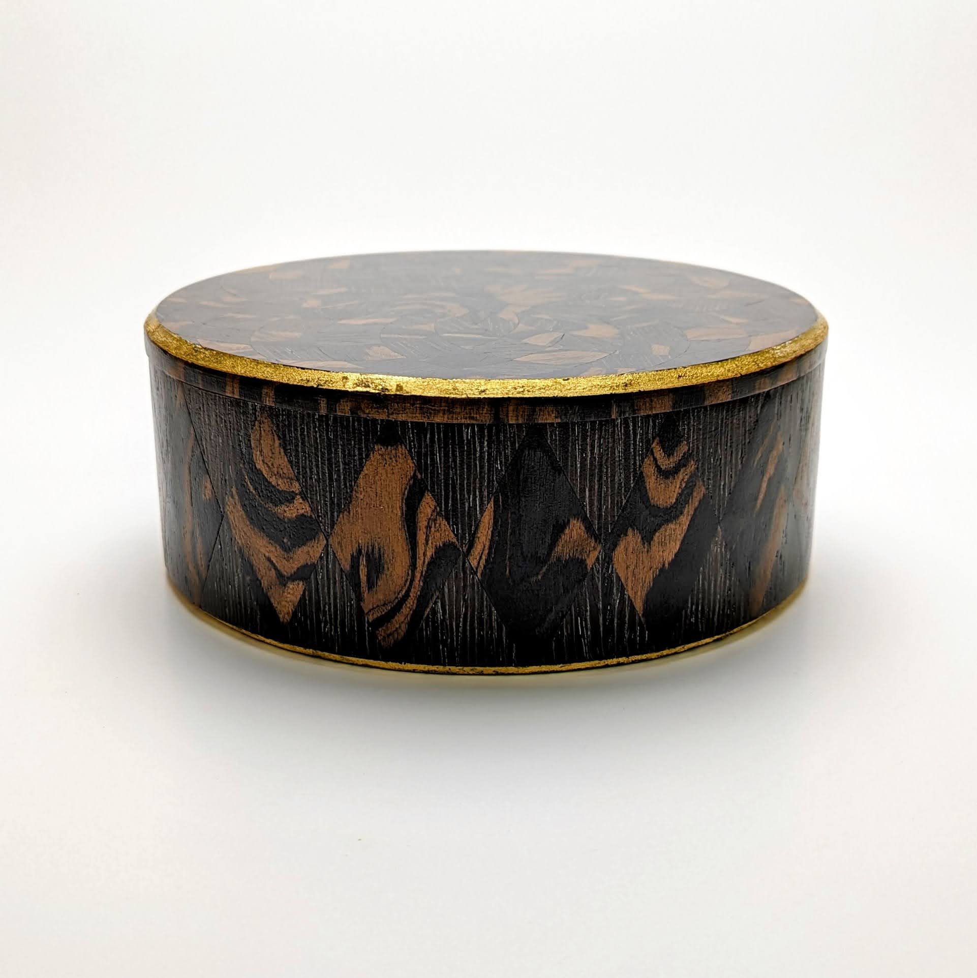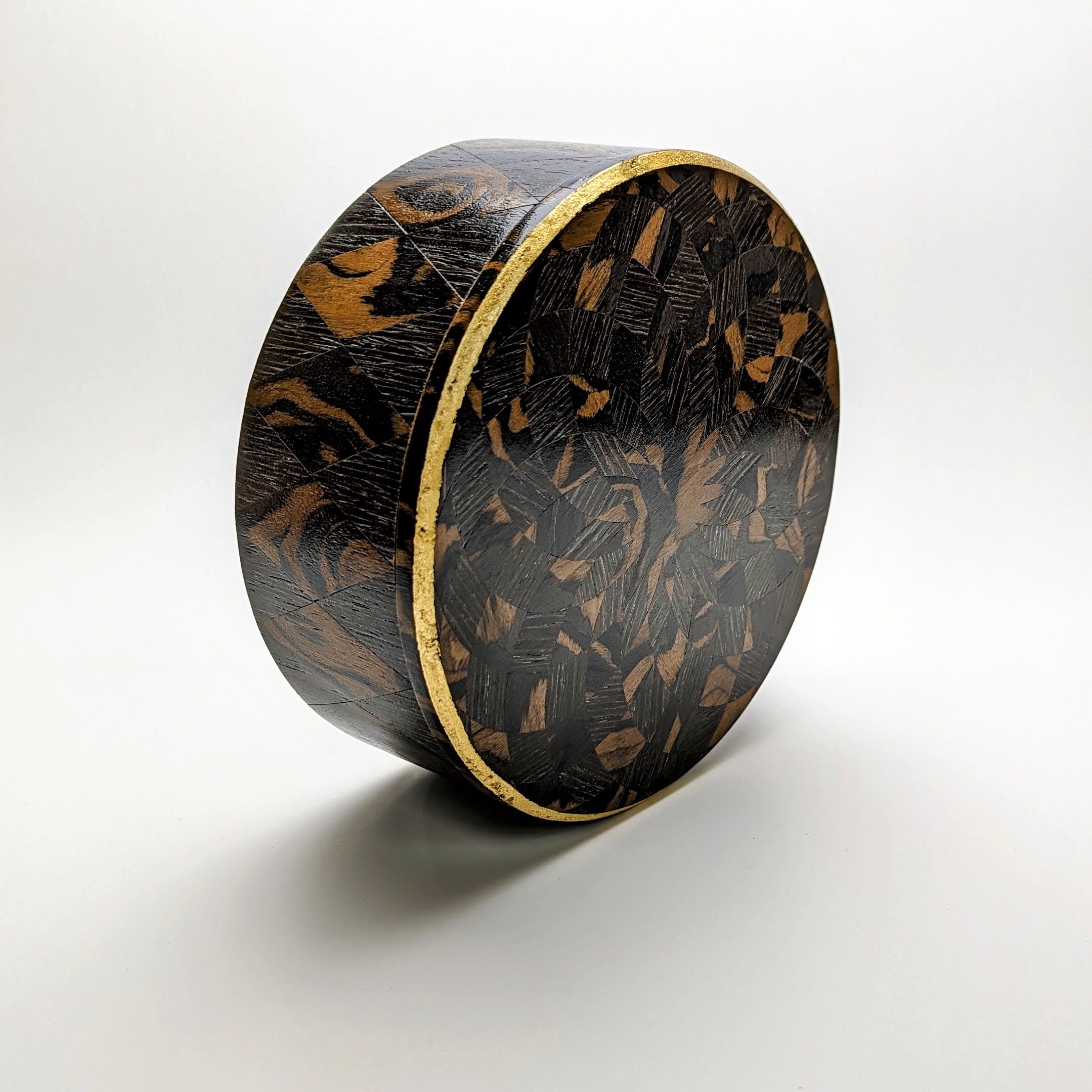A seamless marriage of organic movement and geometric precision, the Harlequin box is a jewel for your vanity or desk. The lift off lid showcases a mesmerizing sunflower spiral in Black Oak and Ebony Burl veneer, crowned with a hand-gilded halo that catches the light from every angle. Its circular body is wrapped in a meticulously inlaid diamond motif, alternating between deep obsidian tones and rich, marbled textures.