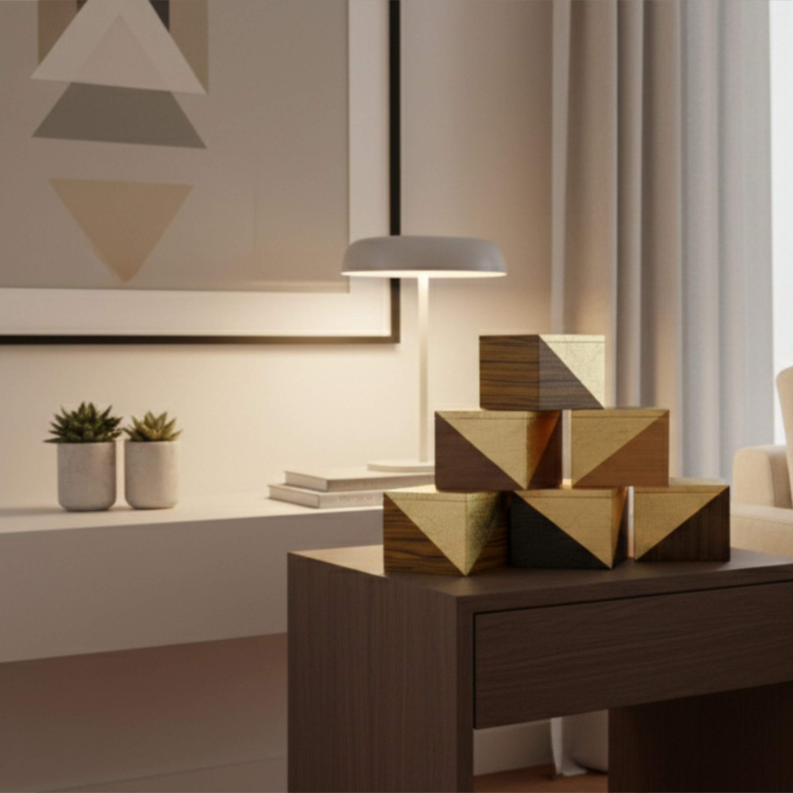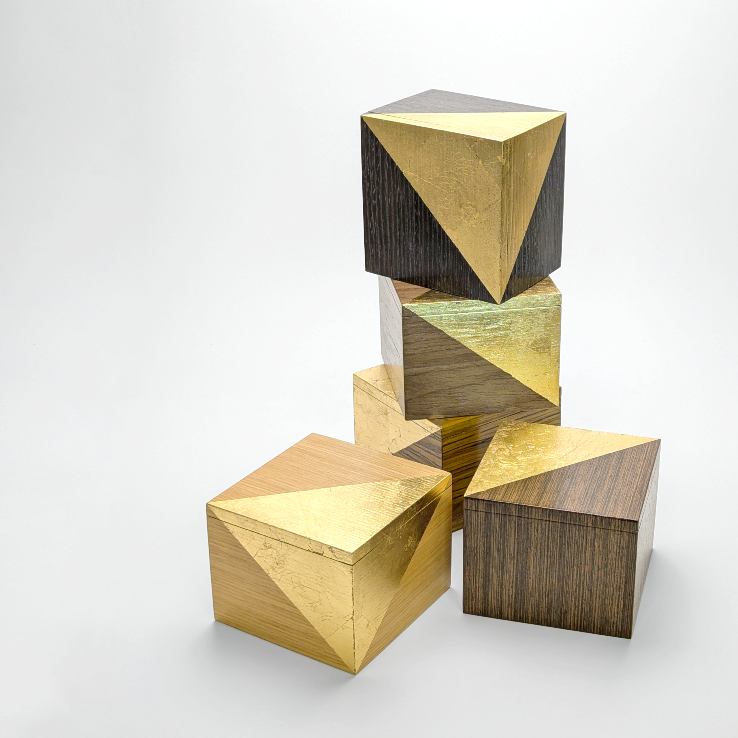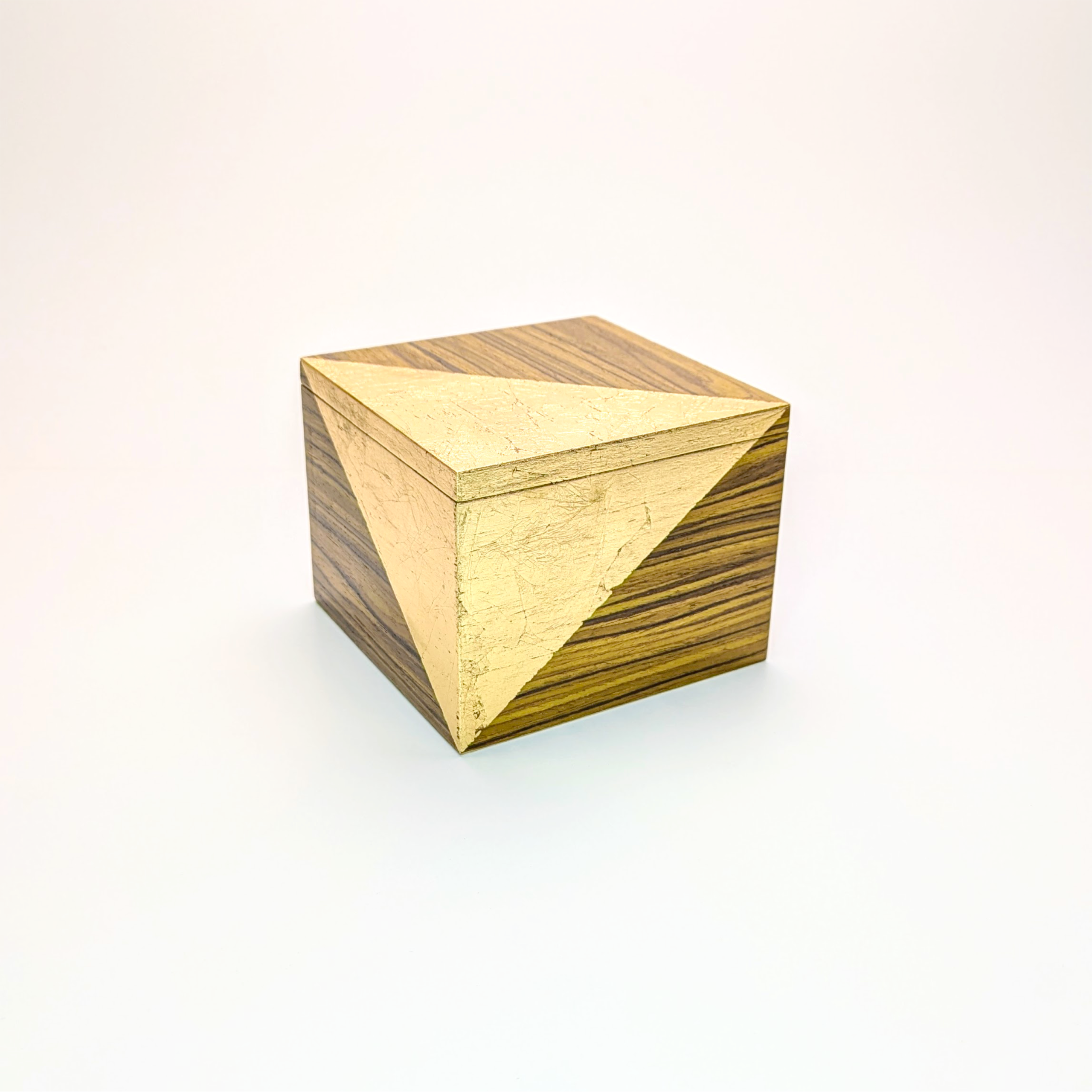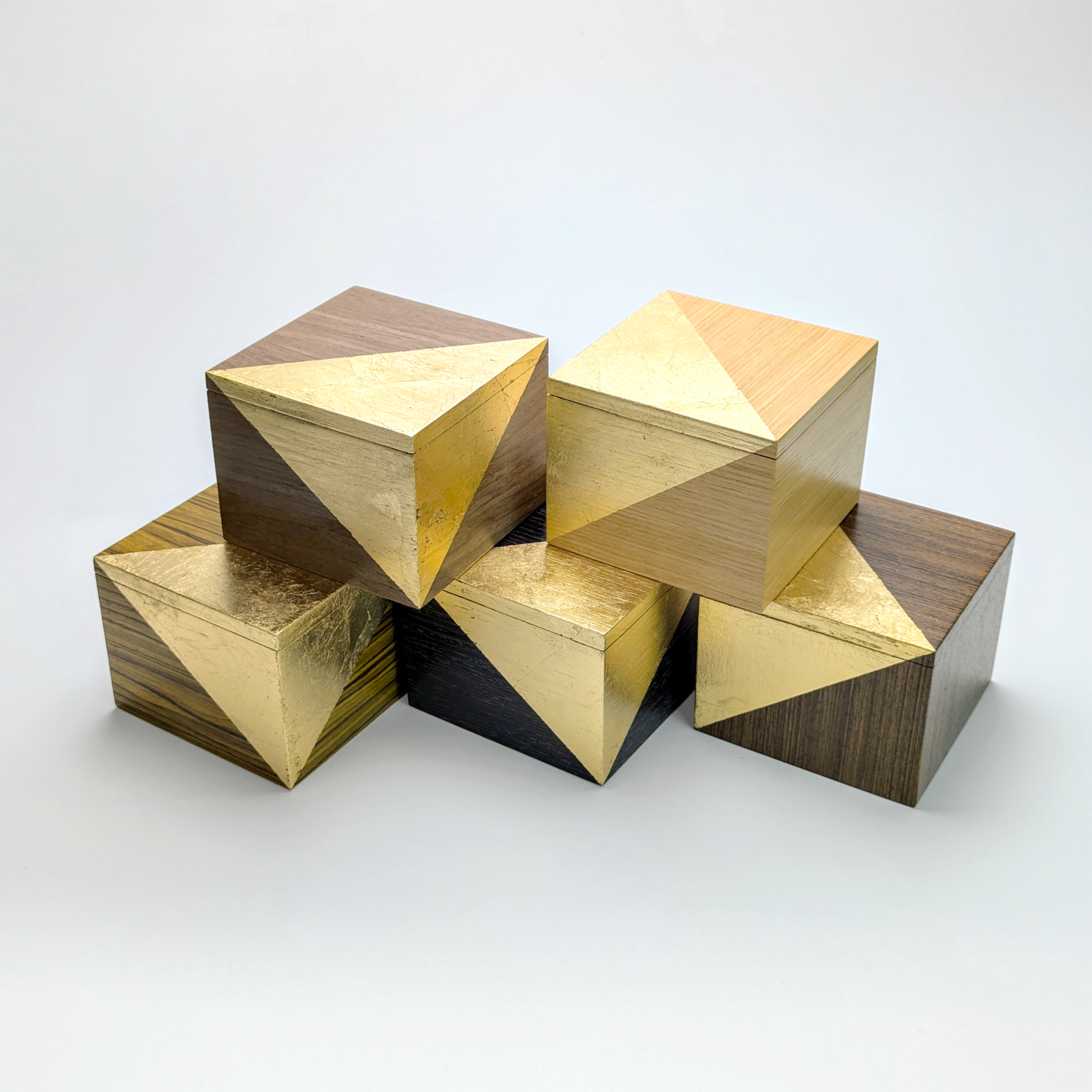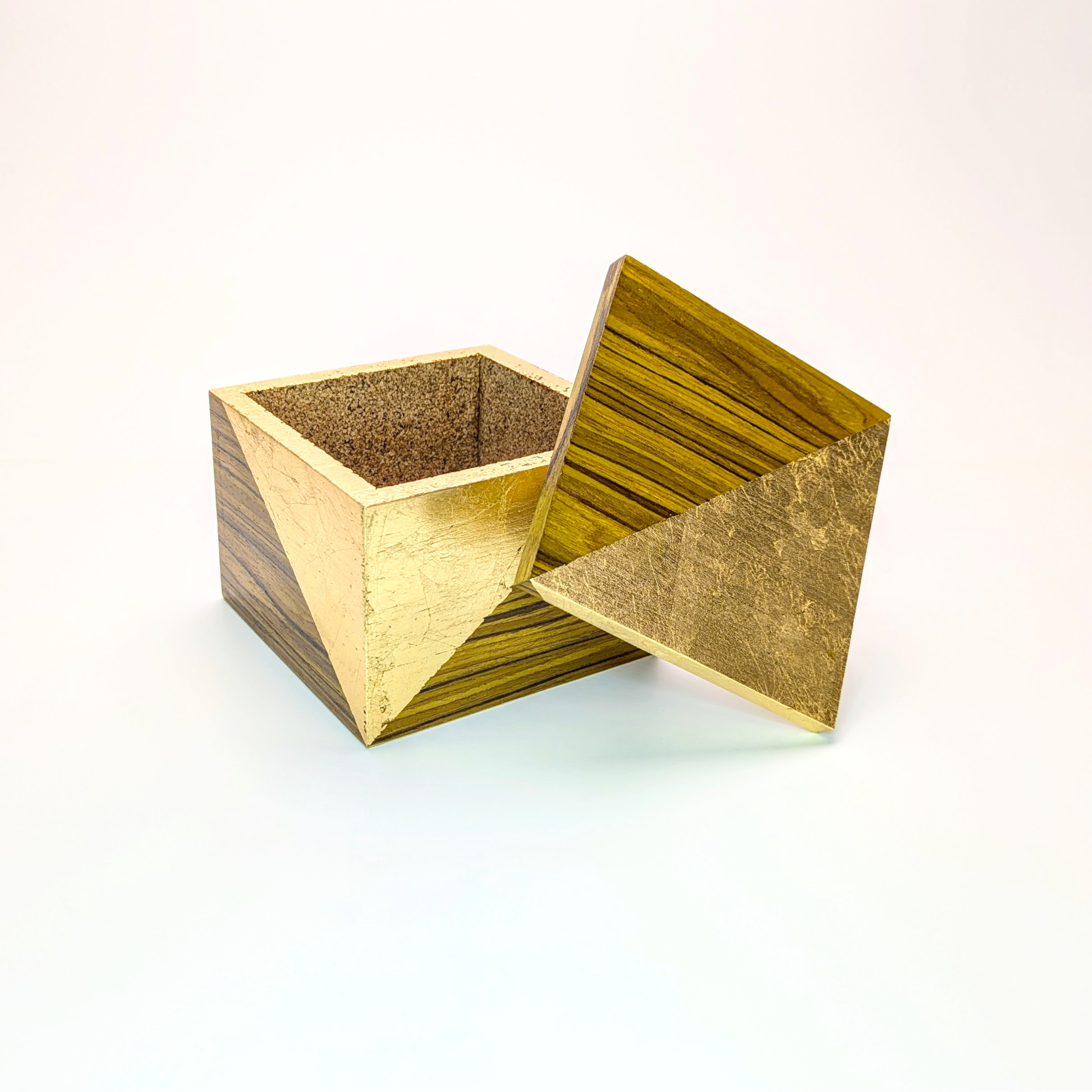 Elevate your space with a functional piece of sculpture. These hand-crafted marquetry boxes marry the organic warmth of premium hardwoods with the radiant precision of gold leaf. Each box features a striking gold corner that gives the impression it has been dipped in liquid metal. Designed for those who appreciate the simpler things in life, these boxes serve as a sophisticated sanctuary for your trinkets, niknaks and everyday essentials.