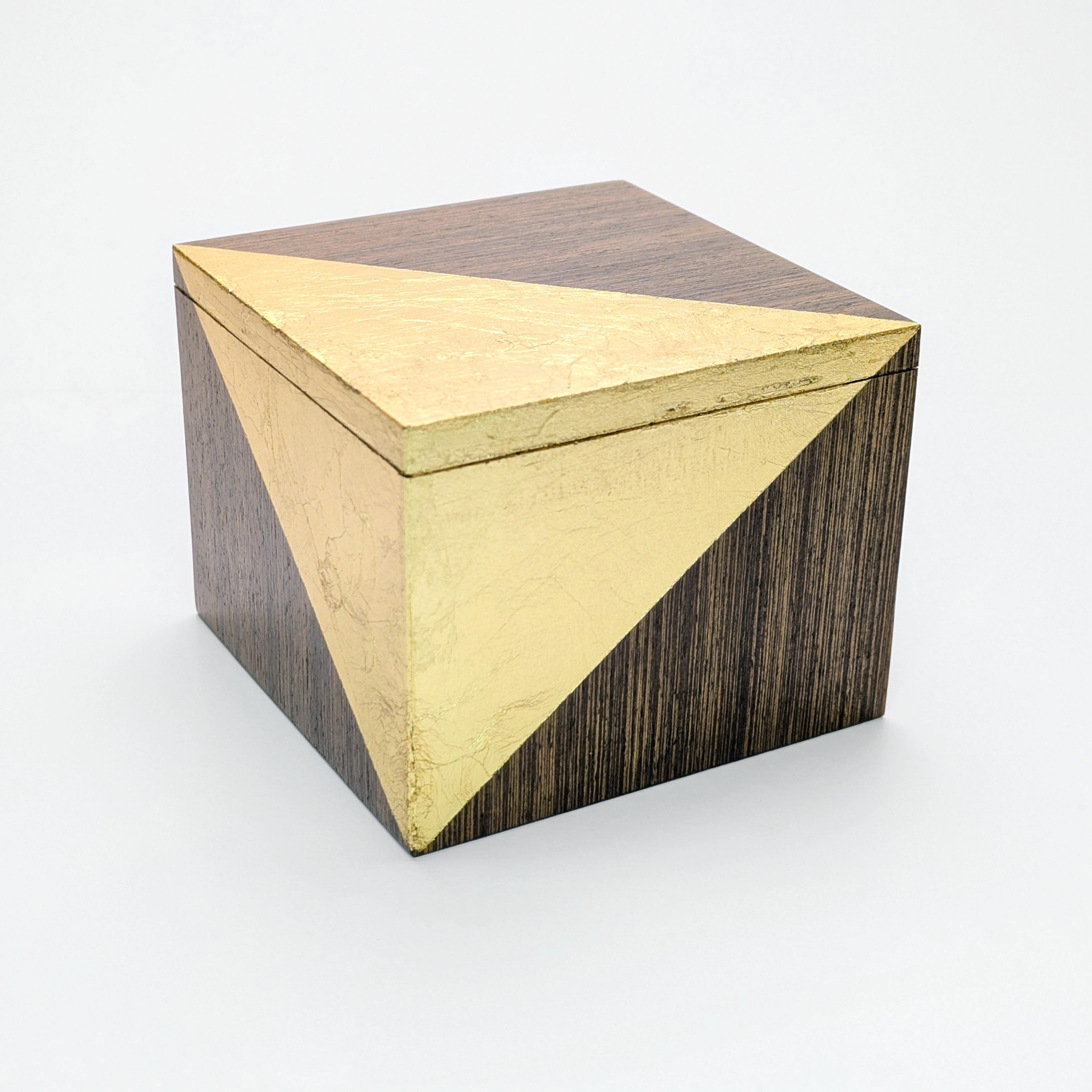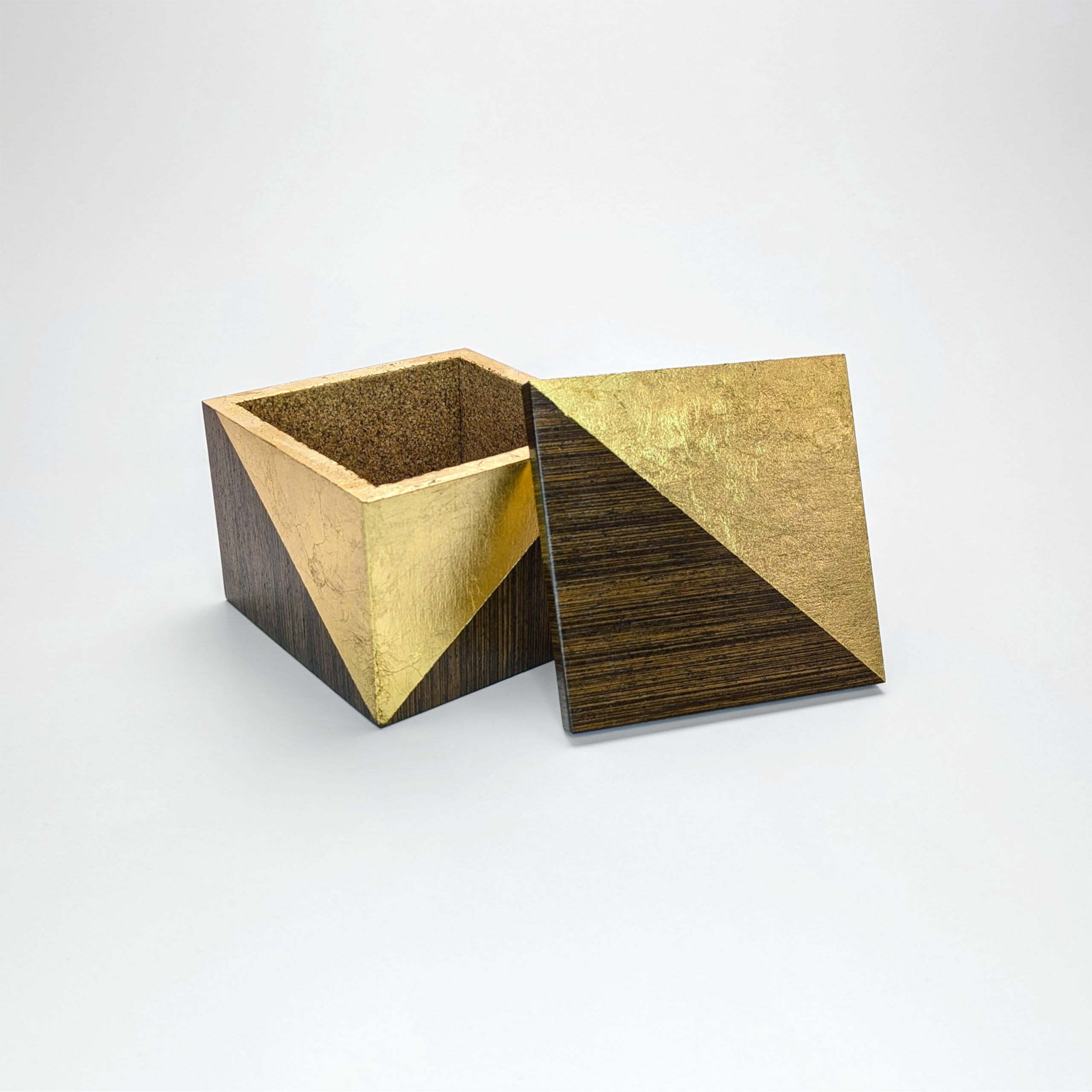 Elevate your space with a functional piece of sculpture. These hand-crafted marquetry boxes marry the organic warmth of premium hardwoods with the radiant precision of gold leaf. Each box features a striking gold corner that gives the impression it has been dipped in liquid metal. Designed for those who appreciate the simpler things in life, these boxes serve as a sophisticated sanctuary for your trinkets, niknaks and everyday essentials.