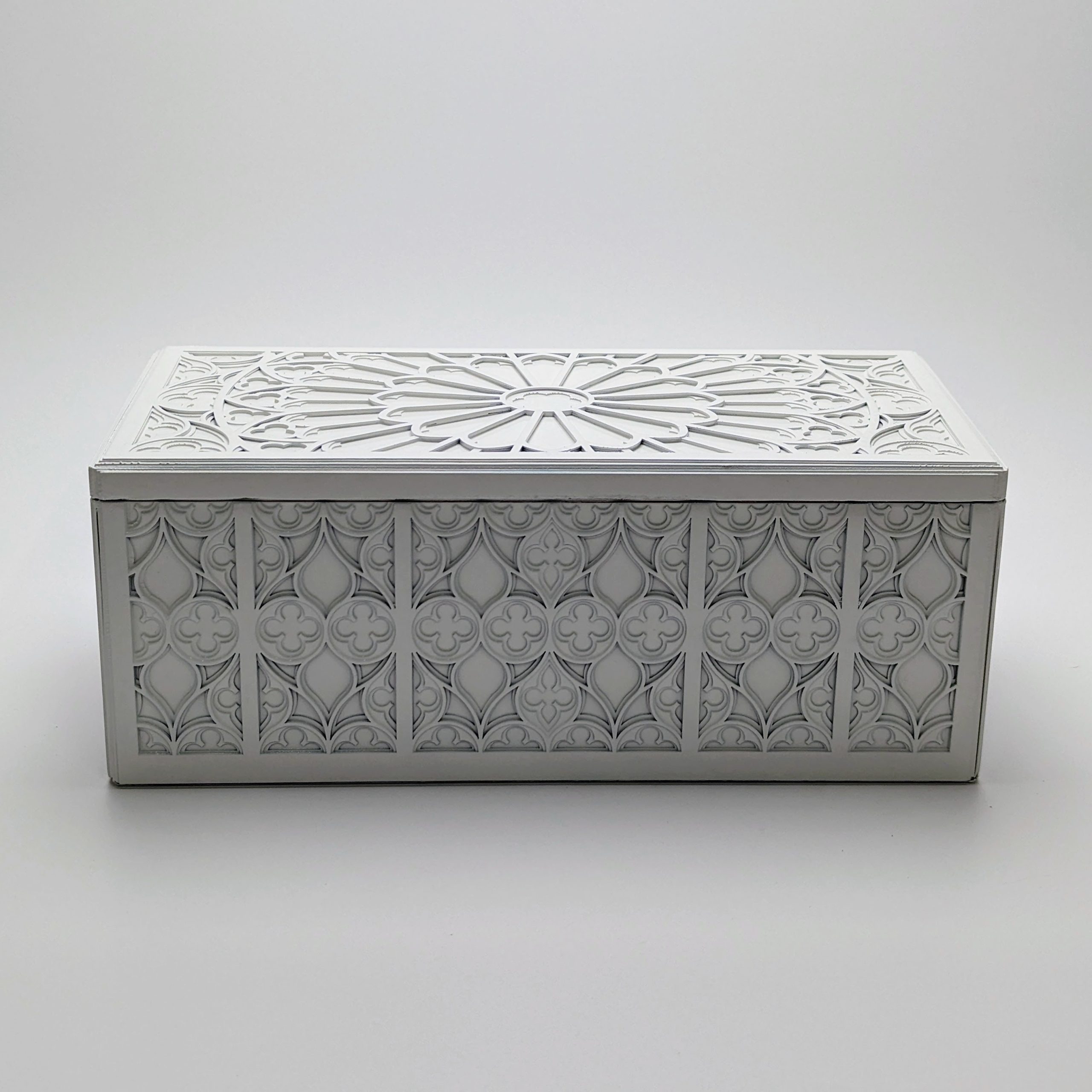 Elevate your space with a functional piece of art that bridges the gap between gothic architecture and modern minimalism. This handcrafted box features exquisite white-on-white marquetry, inspired by the soaring rose windows of the great Gothic cathedrals. Every curve and quatrefoil is meticulously rendered to create a play of light and shadow that evolves throughout the day.