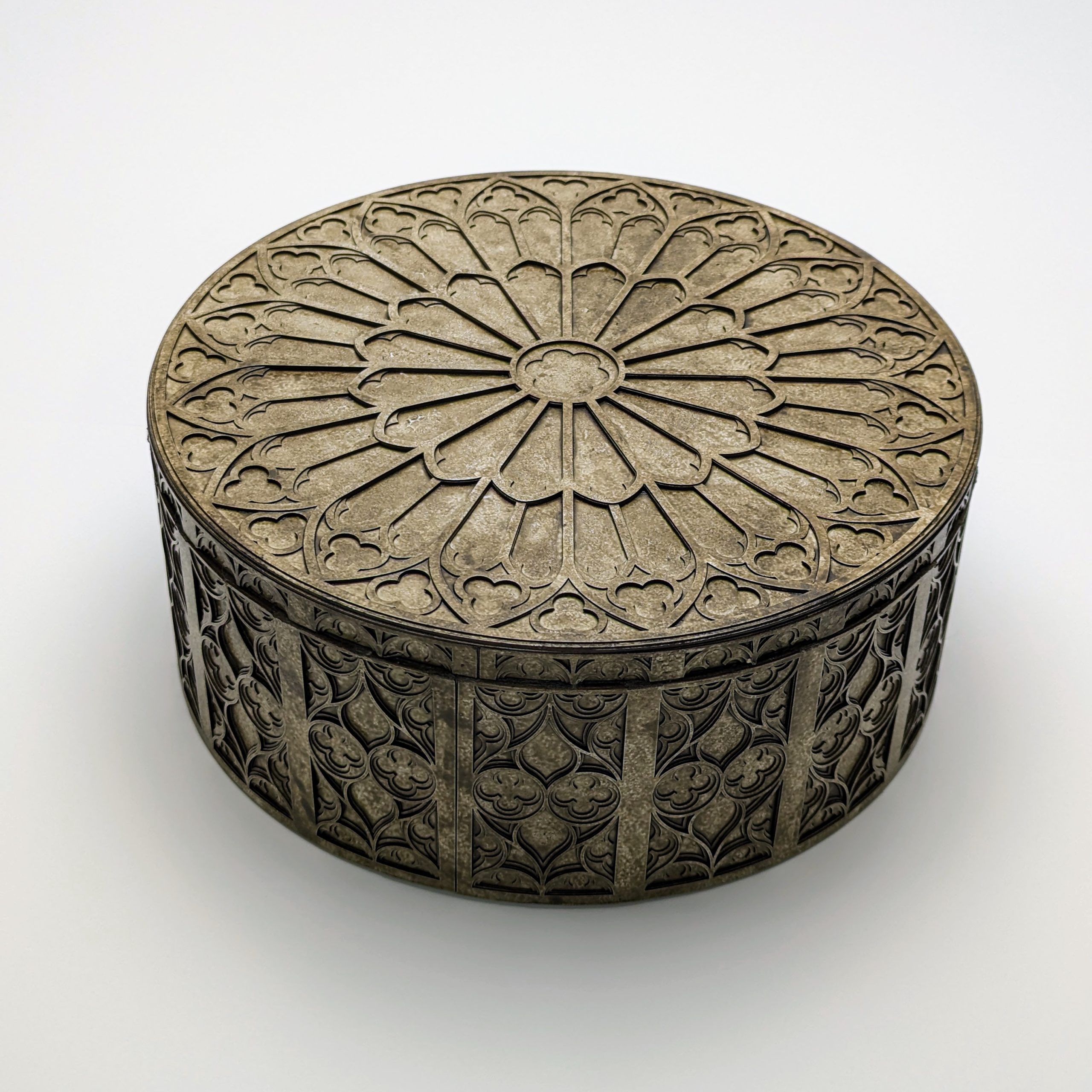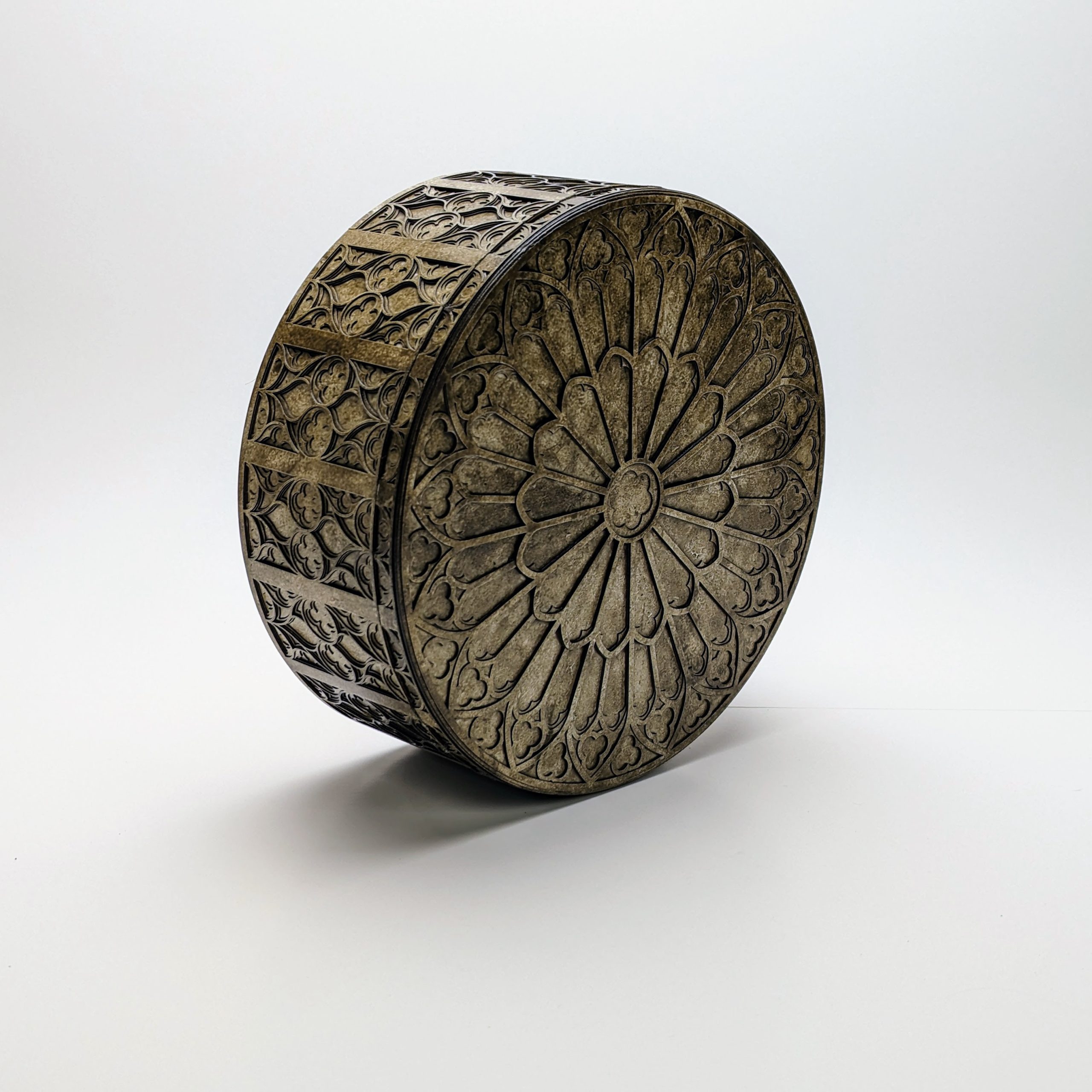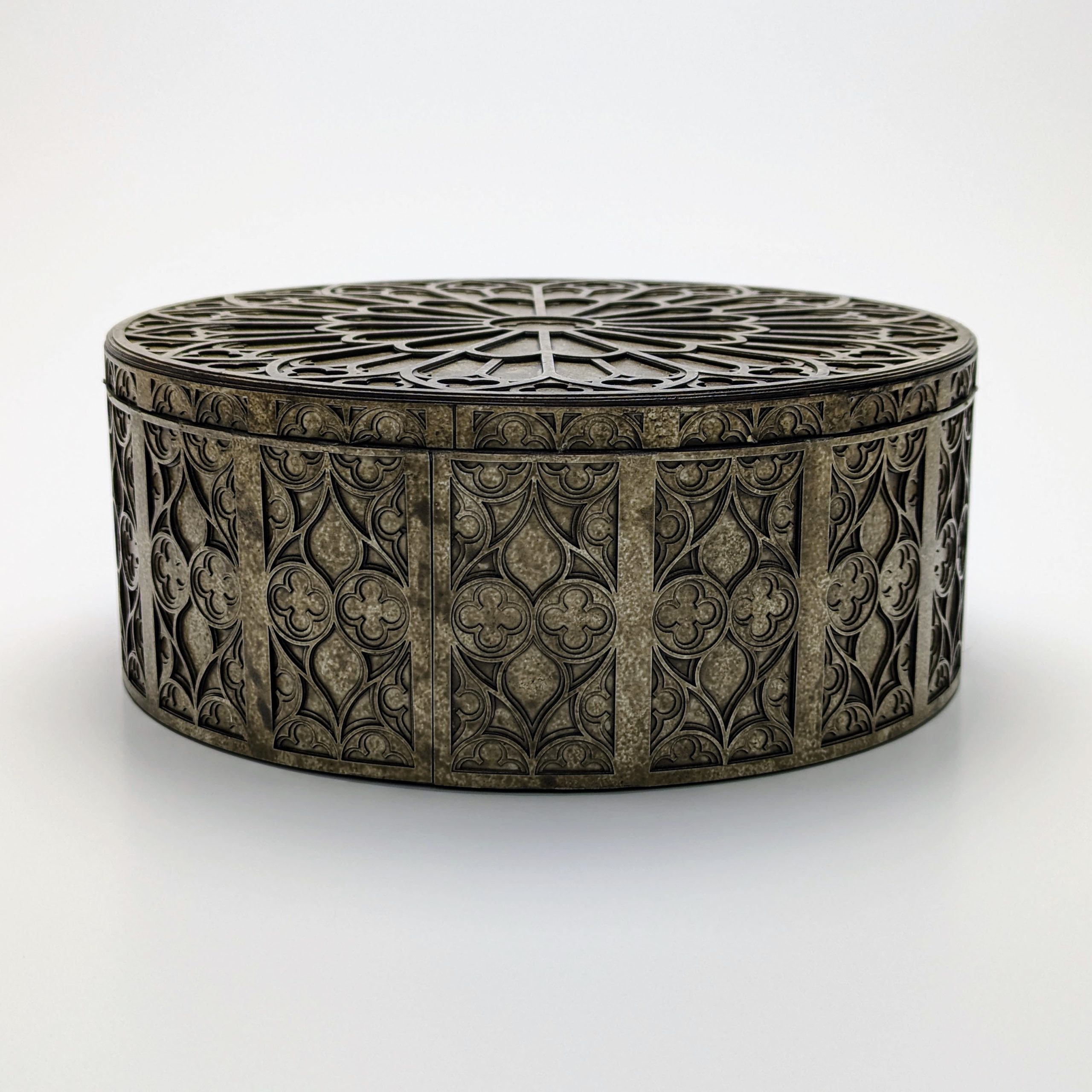 The grandmother of the Gothic collection, this round box perfectly suits the stunning rose window design featured on the lid. Designed for the lover of fine details, this box showcases the complexity of traditional Gothic motifs through a contemporary lens. Perfect for a desk, side table or decorative shelf.