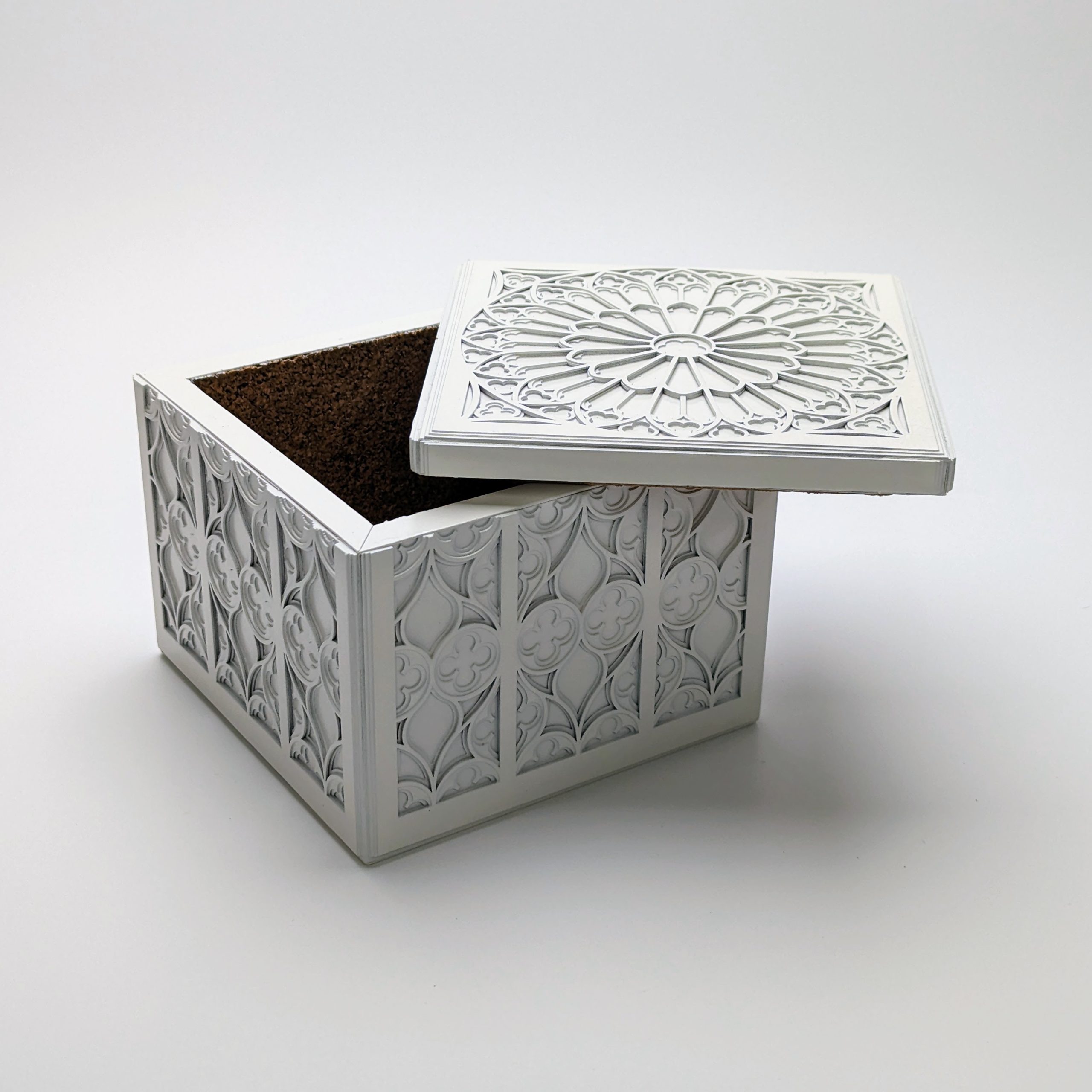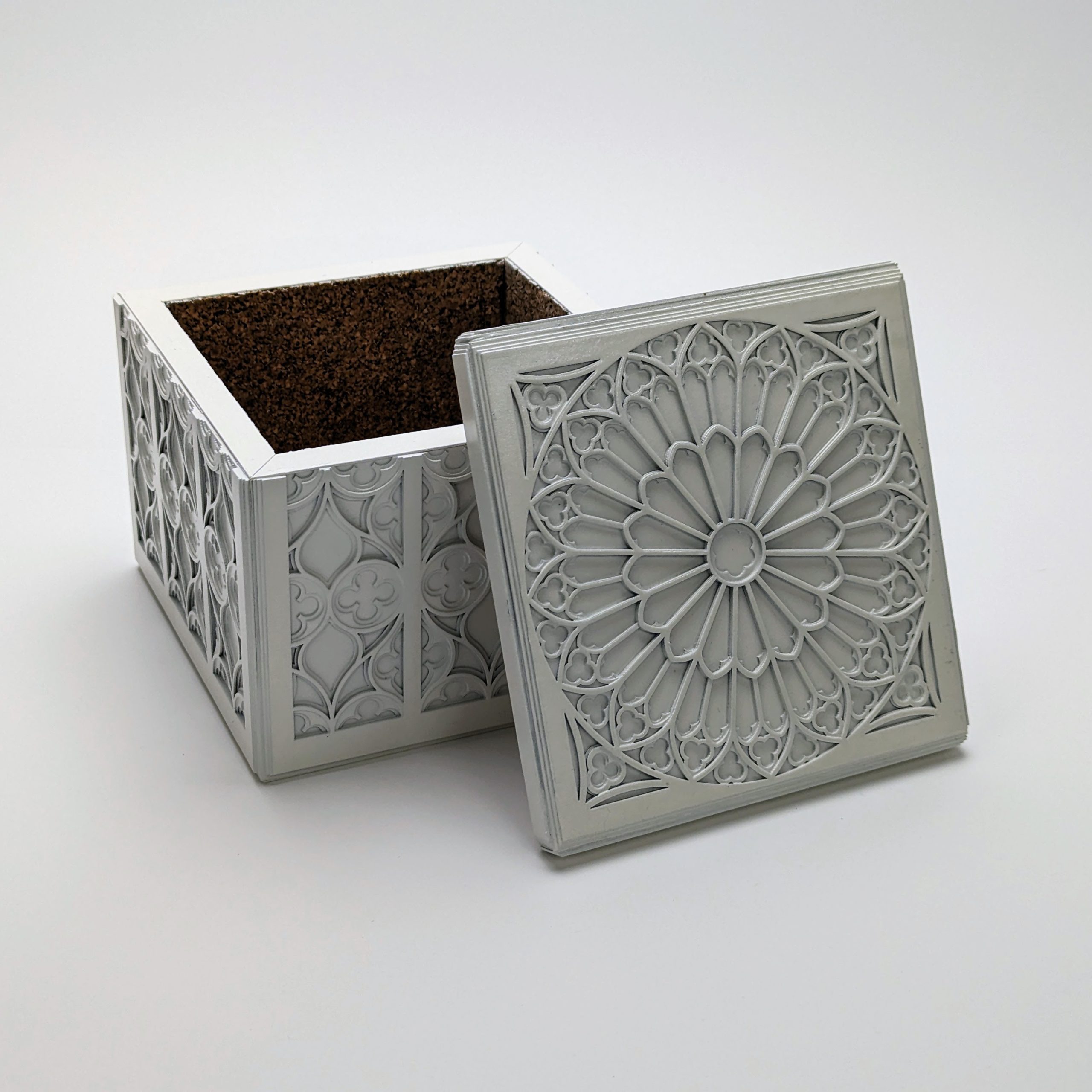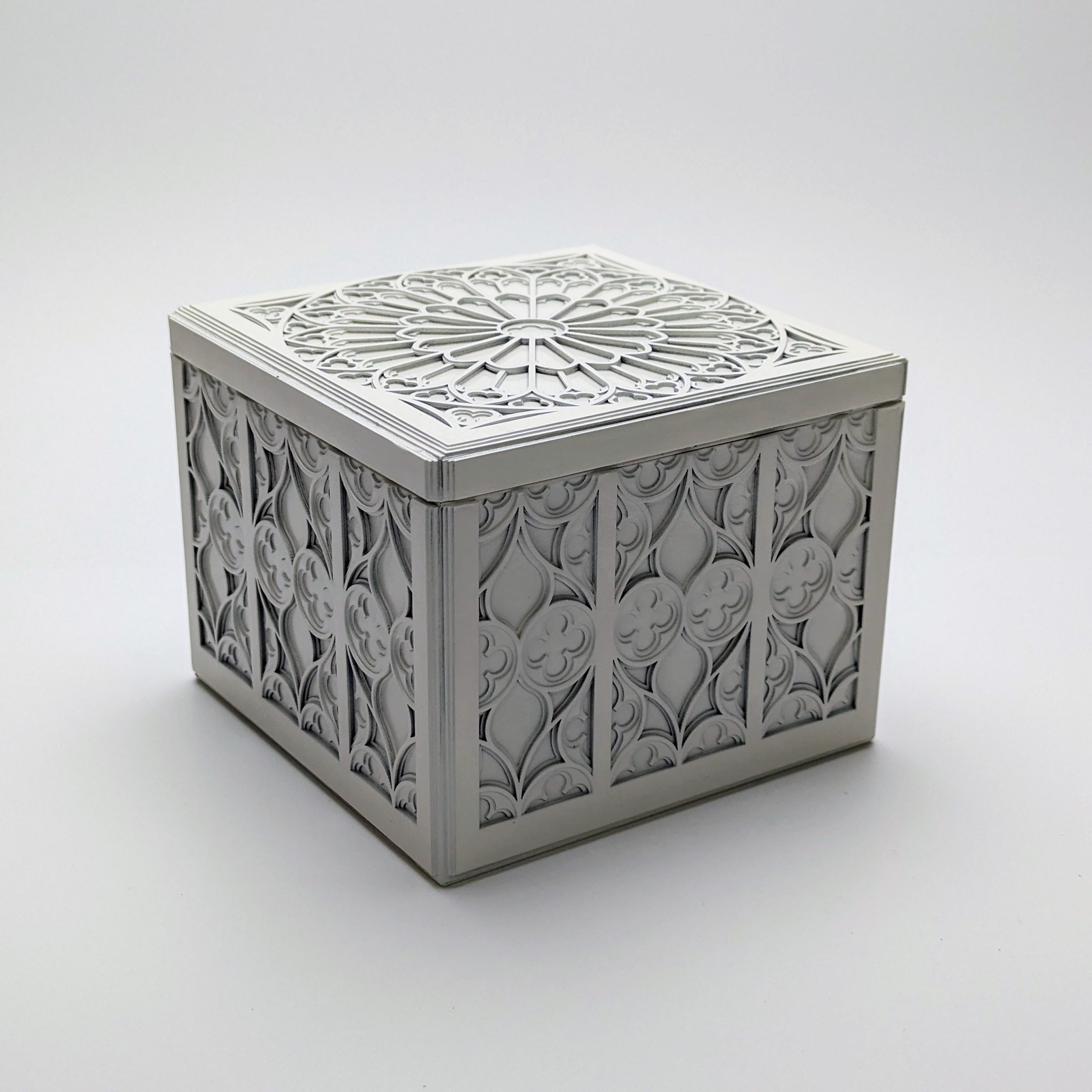 Elevate your space with a functional piece of art that bridges the gap between gothic architecture and modern minimalism. This handcrafted box features exquisite white-on-white marquetry, inspired by the soaring rose windows of the great Gothic cathedrals. Every curve and quatrefoil is meticulously rendered to create a play of light and shadow that evolves throughout the day.