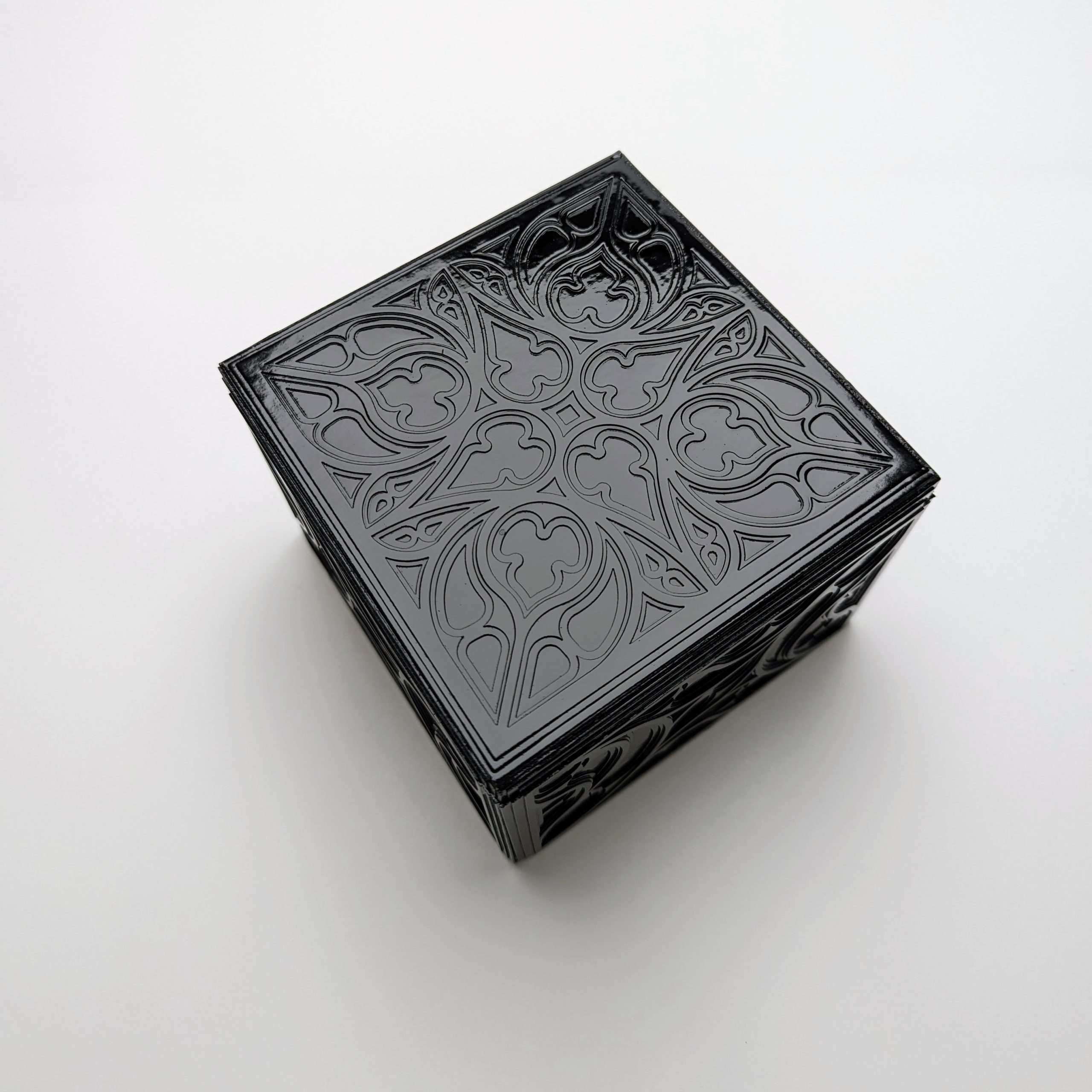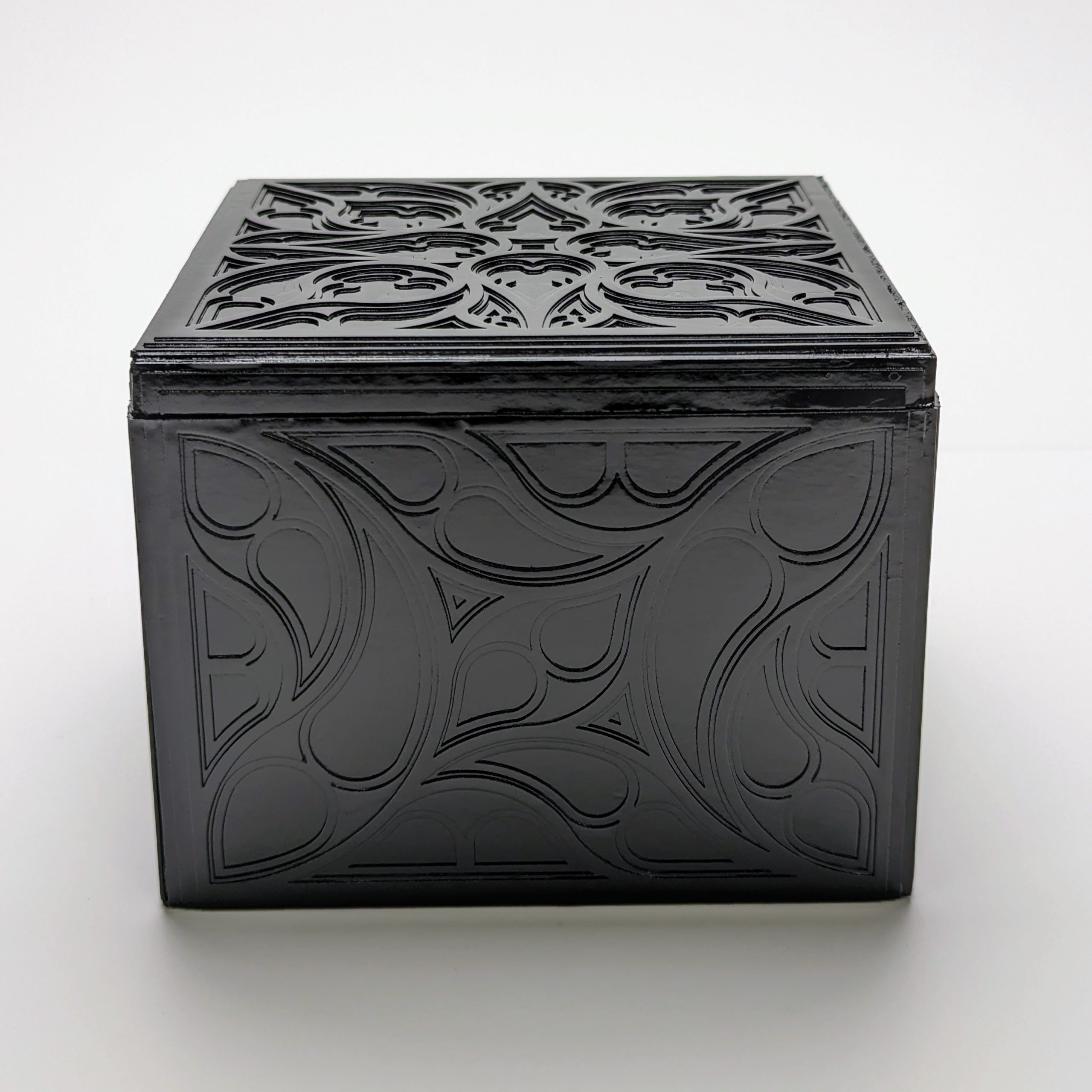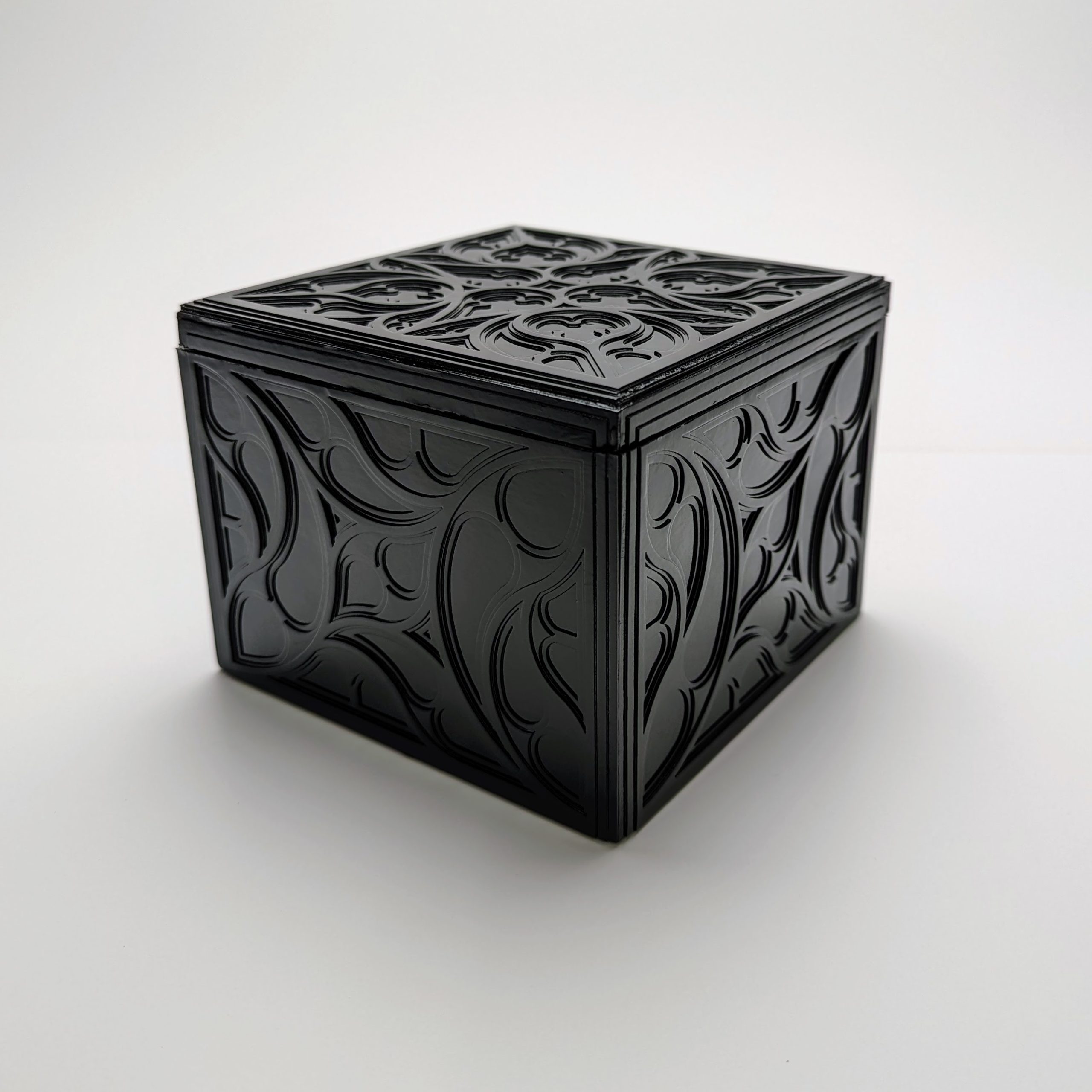 Embrace the darker side of architectural elegance. This handcrafted marquetry box is finished in a deep, gloss black, transforming classic Gothic motifs into a statement of modern mystery. The intricate layers across the lid and sides draw inspiration from flowing flamboyant tracery, creating a tactile experience that rewards the touch.