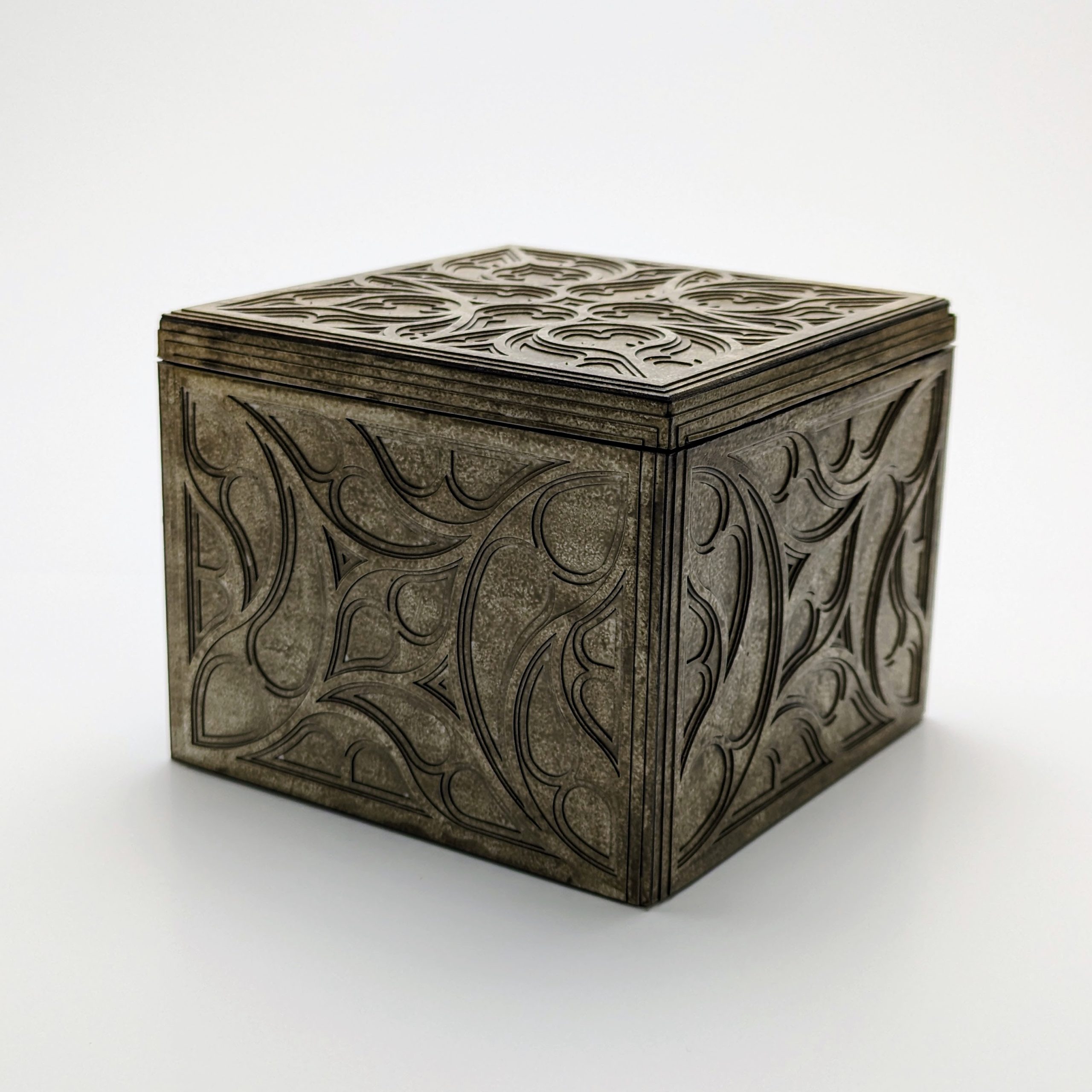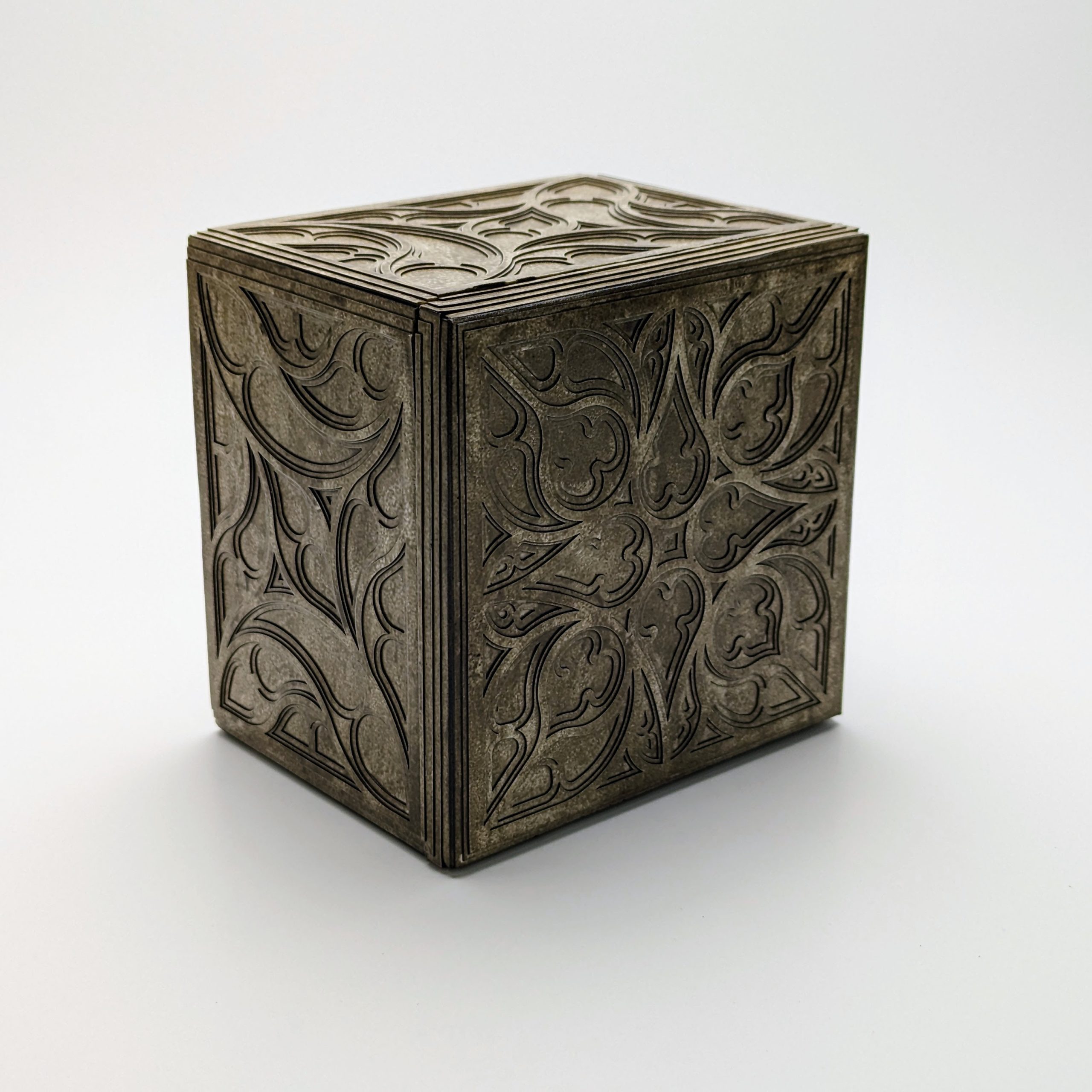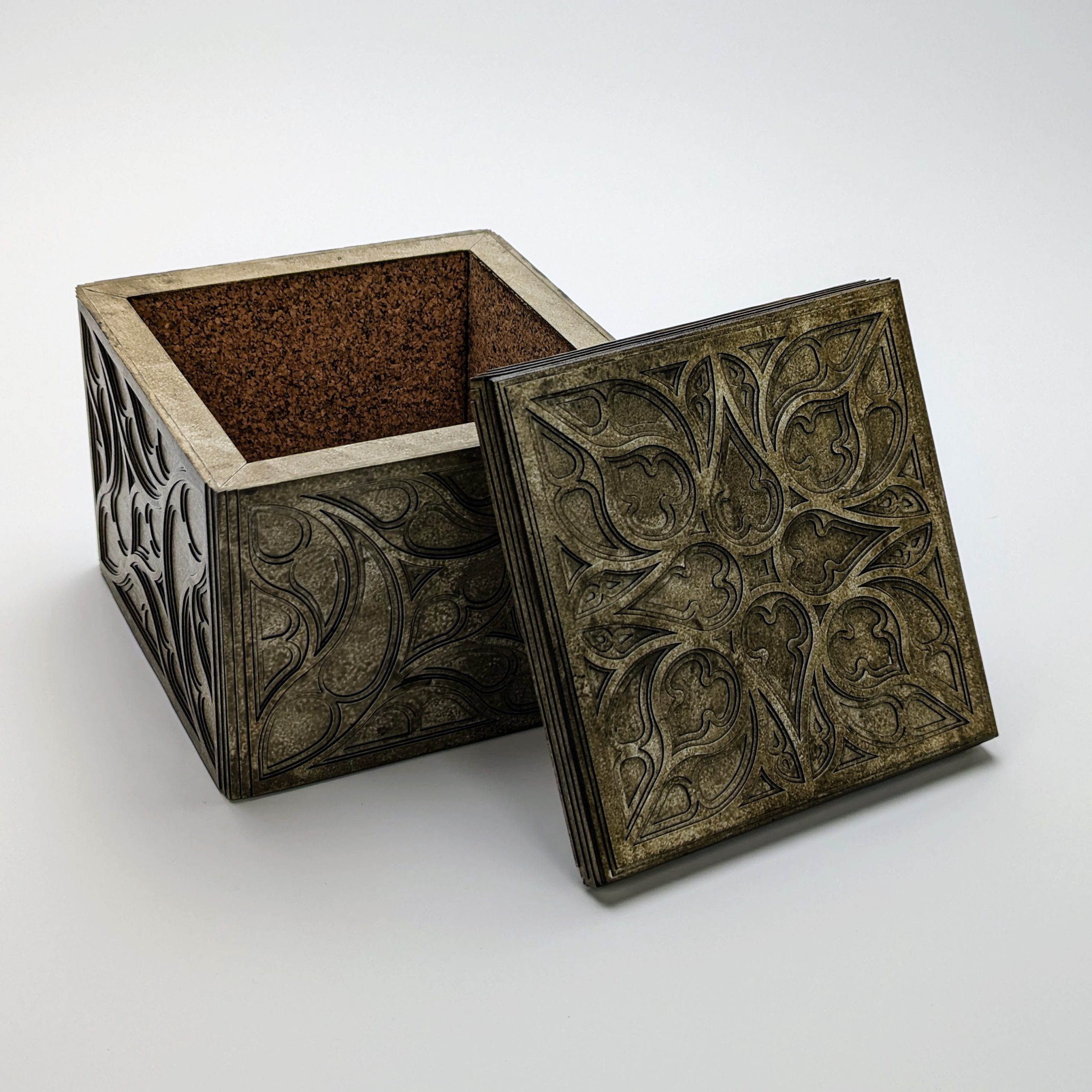 Evoke the quiet grandeur of ancient masonry with this handcrafted marquetry piece. Finished in a multi-toned, weathered brown patina, this box captures the look of age-worn stone or deep-stained oak found in historic cathedral choirs. The intricate Vamp tracery creates a stunning relief of mirrored arches, offering a tactile experience that feels like a rediscovered artifact. It is a soulful, sophisticated accent for a home rooted in history and timeless craft.