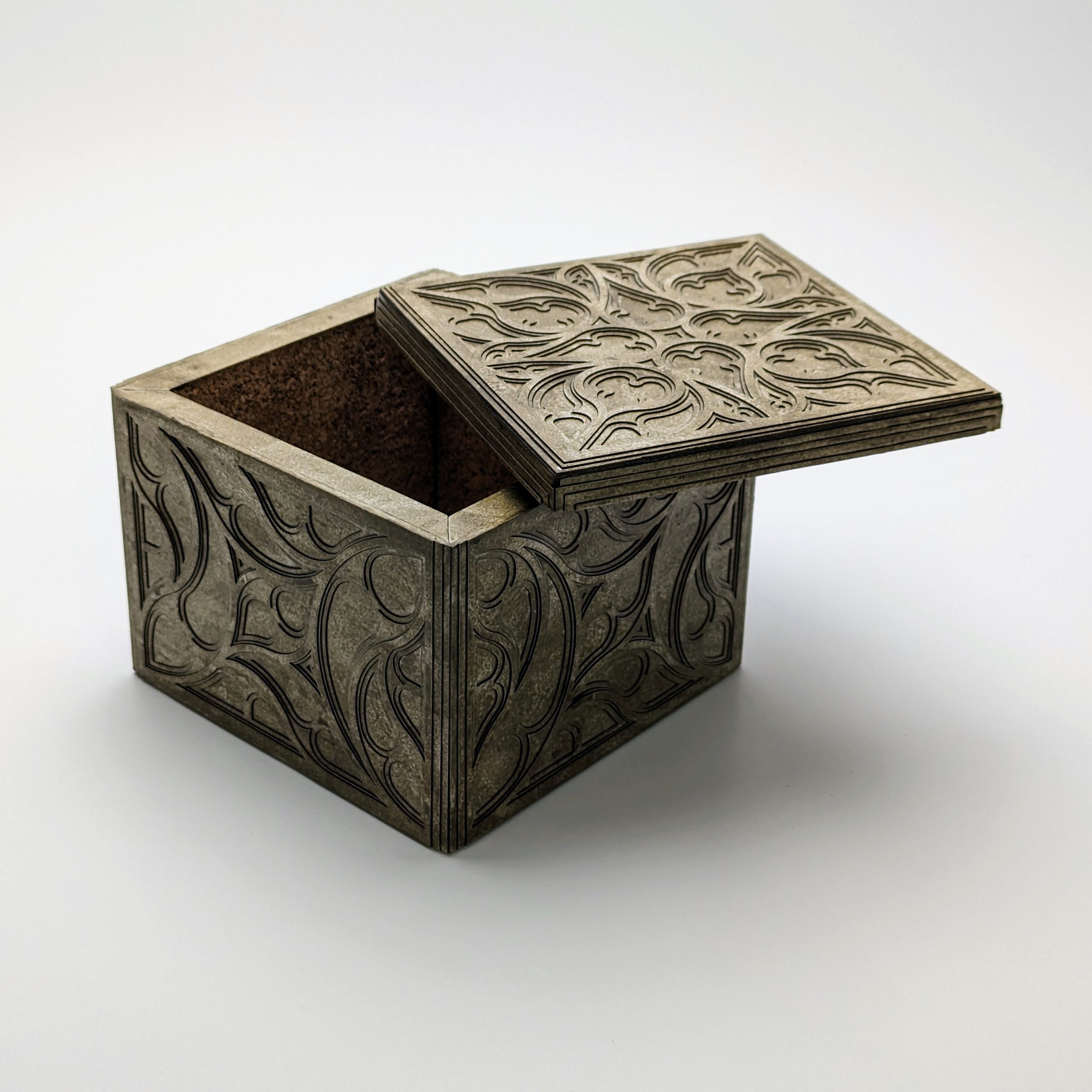 A piece of history for your tabletop. This handcrafted box features intricate flamboyant arches and a weathered brown patina for an authentic, aged look. Perfect for adding a touch of old-world mystery to your decor.