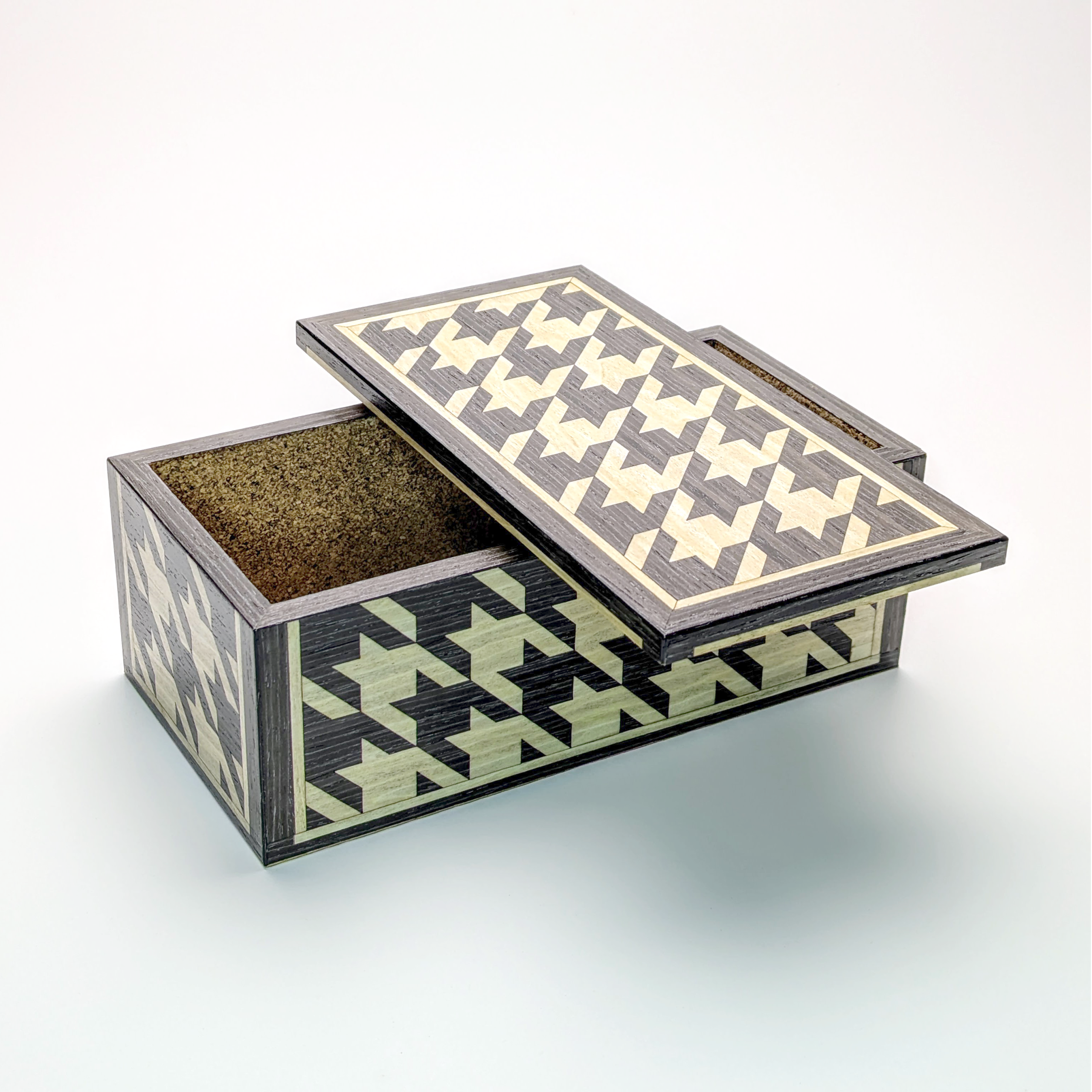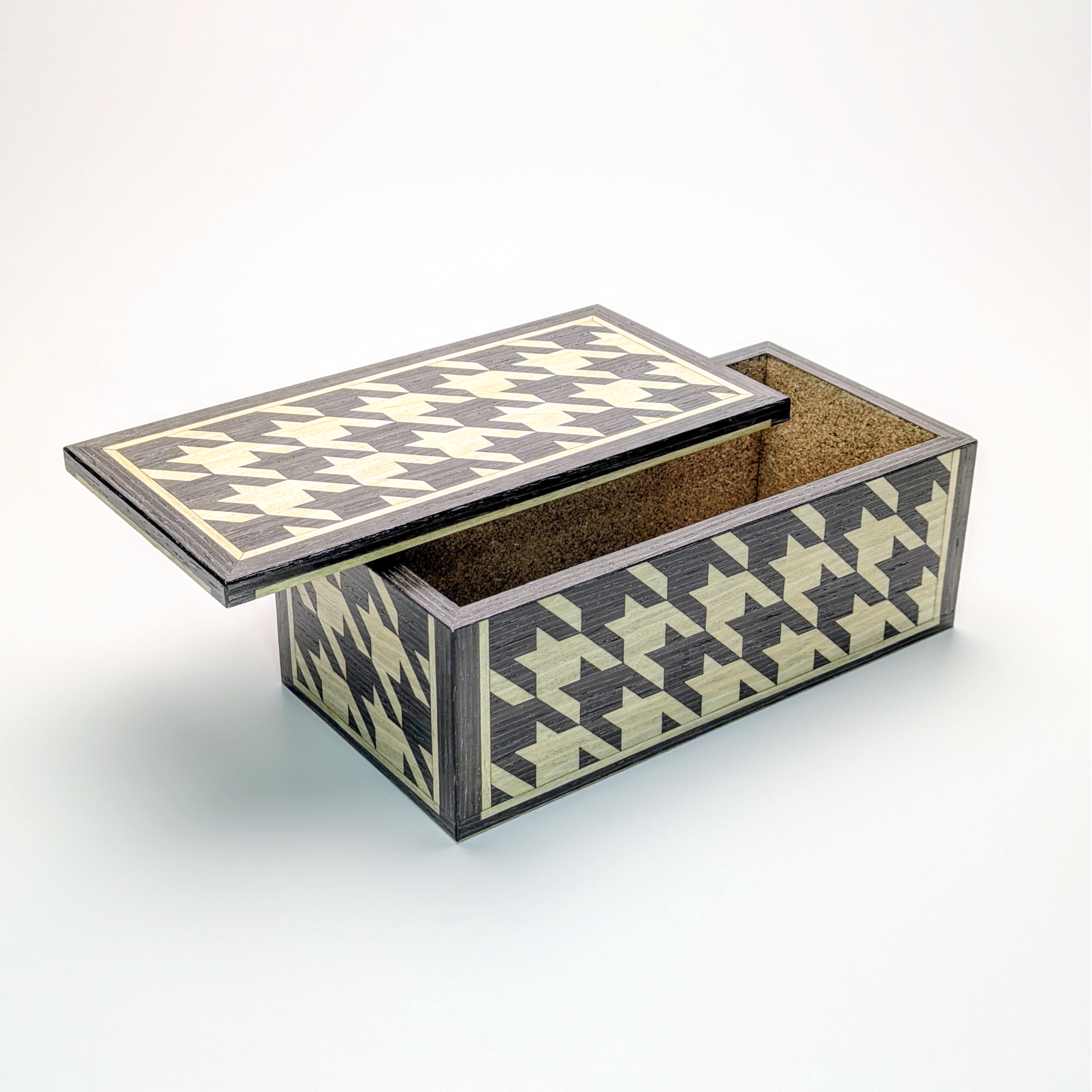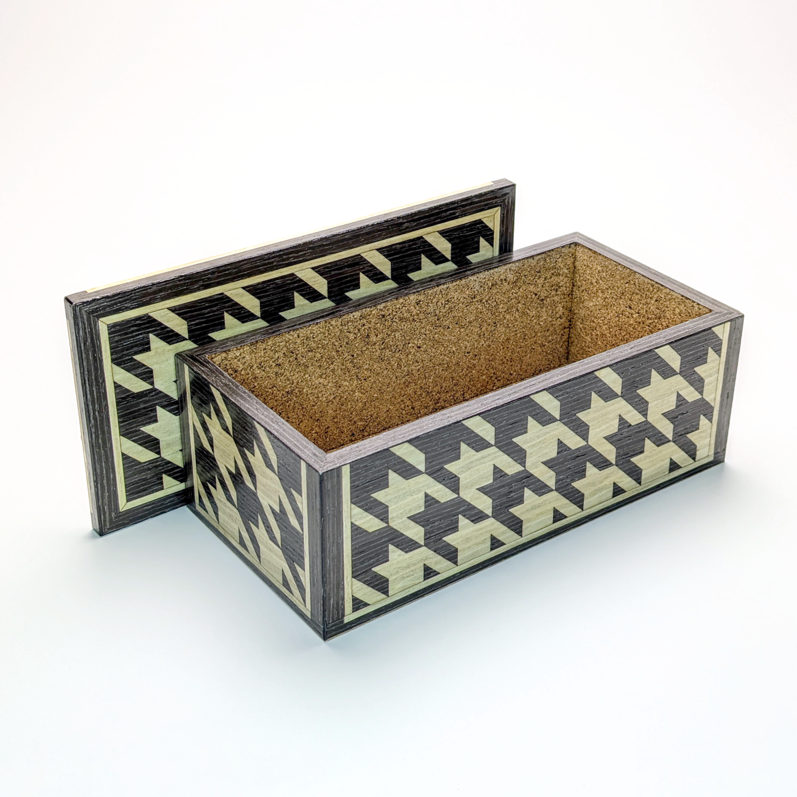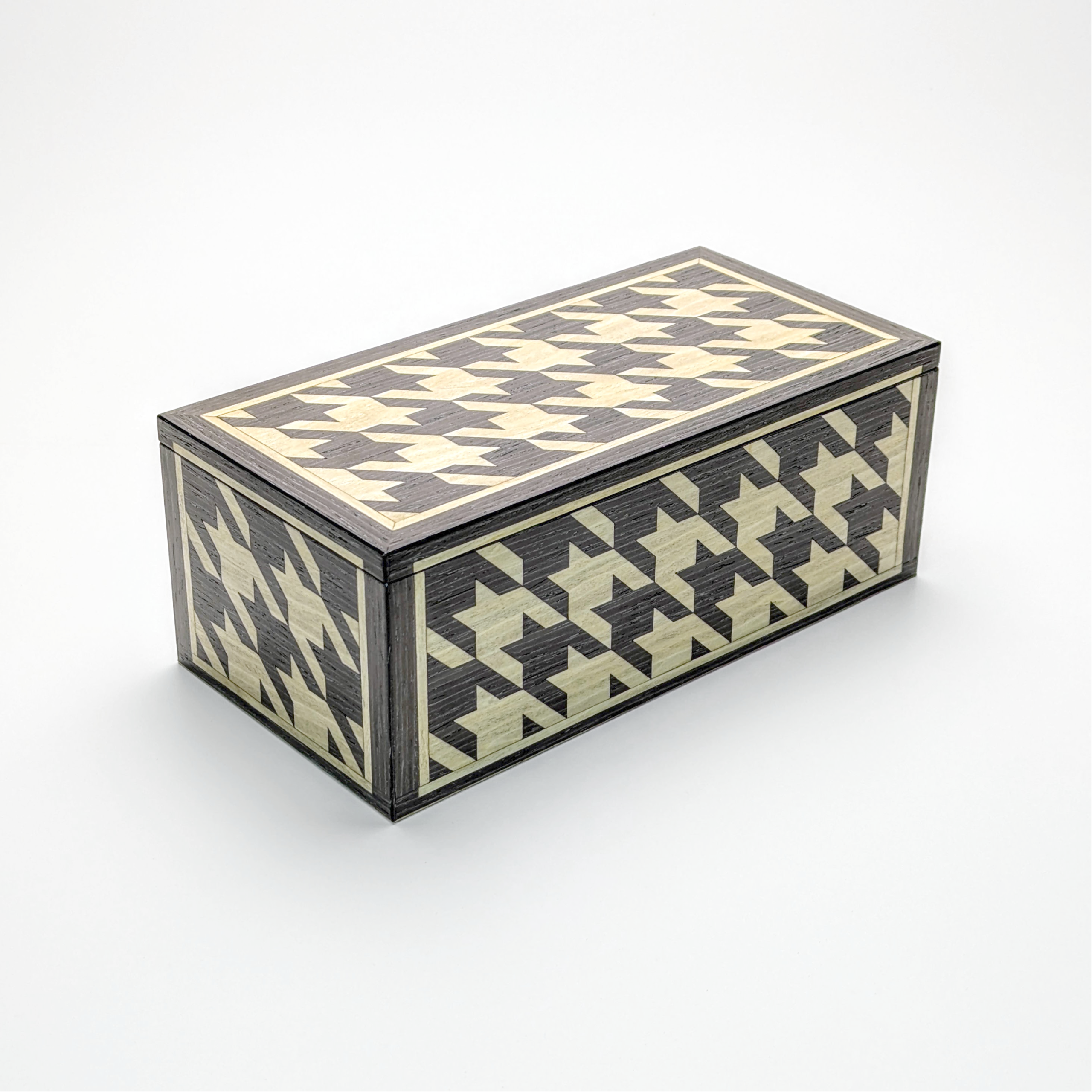 Crafted for those who appreciate the intricacies of fine woodworking, this box features a complex houndstooth motif achieved through traditional marquetry techniques. Using the French Boulle technique not only means there is very little waste, but that each box has an opposite with an inverted visual dialogue.