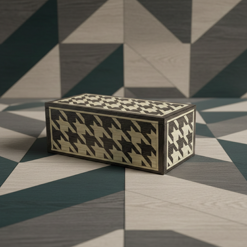 Elevate your space with a masterclass in geometric precision. This hand-crafted marquetry box reimagines the timeless houndstooth pattern through the organic warmth of fine wood veneers. Each piece is meticulously cut and inlaid to create a seamless, tactile surface that blurs the line between traditional craft and contemporary art.