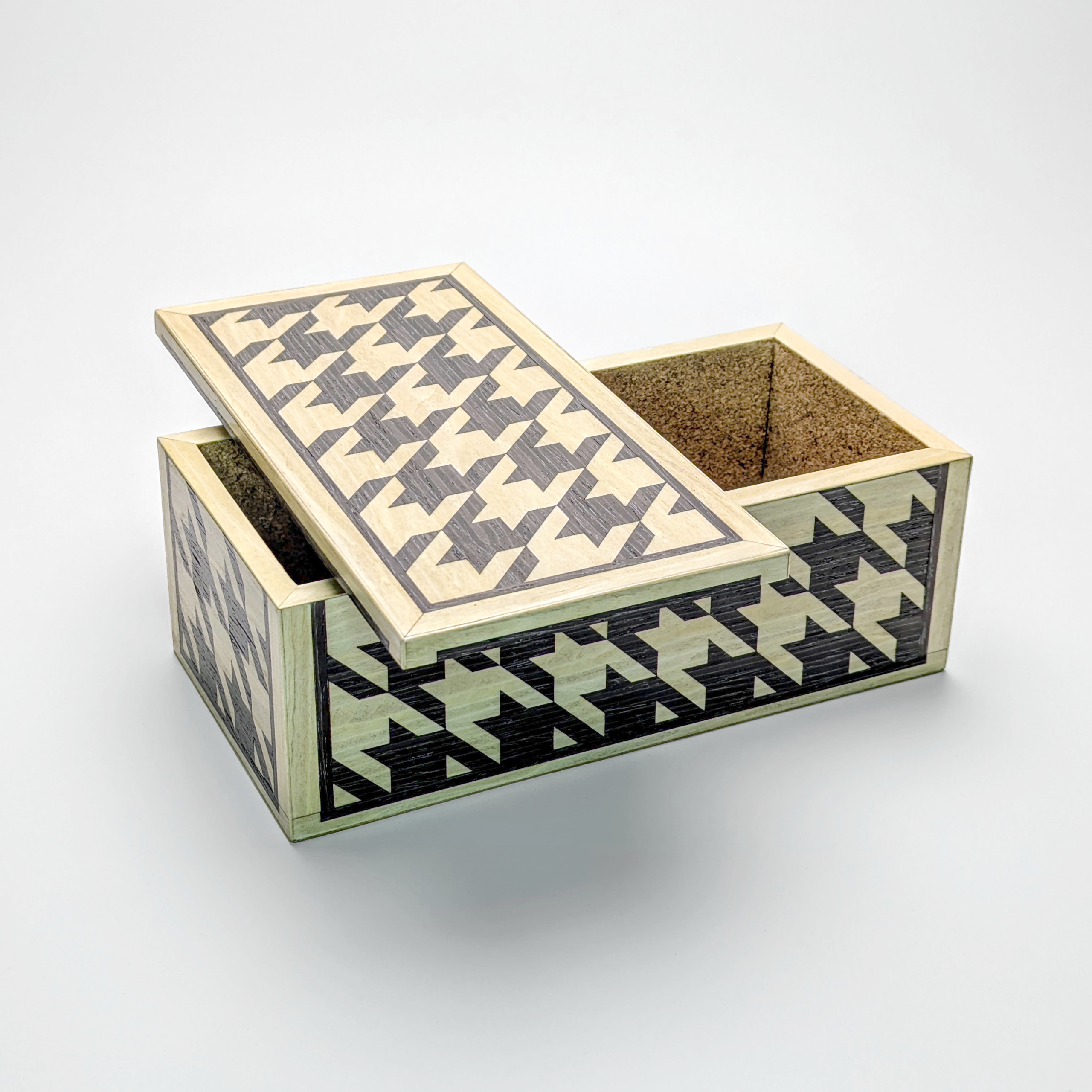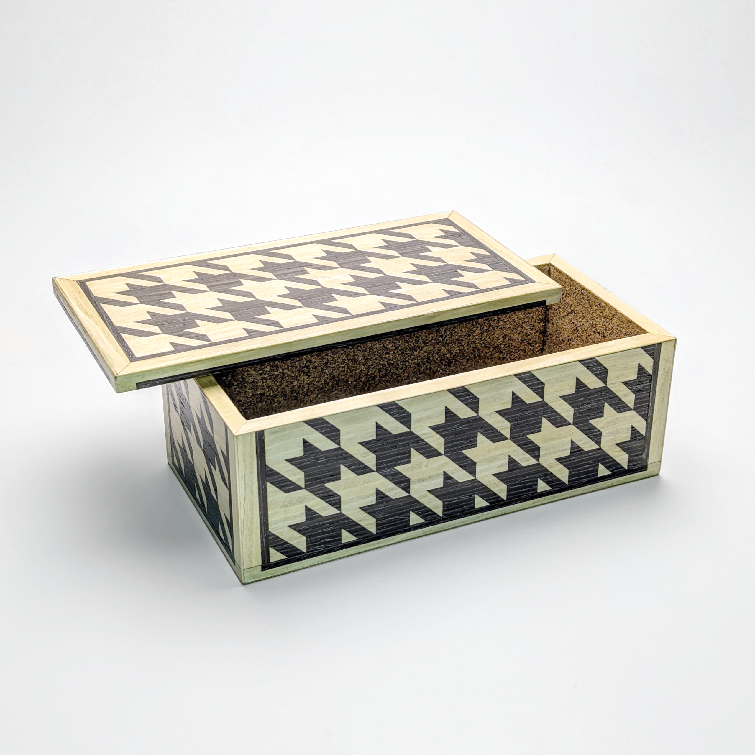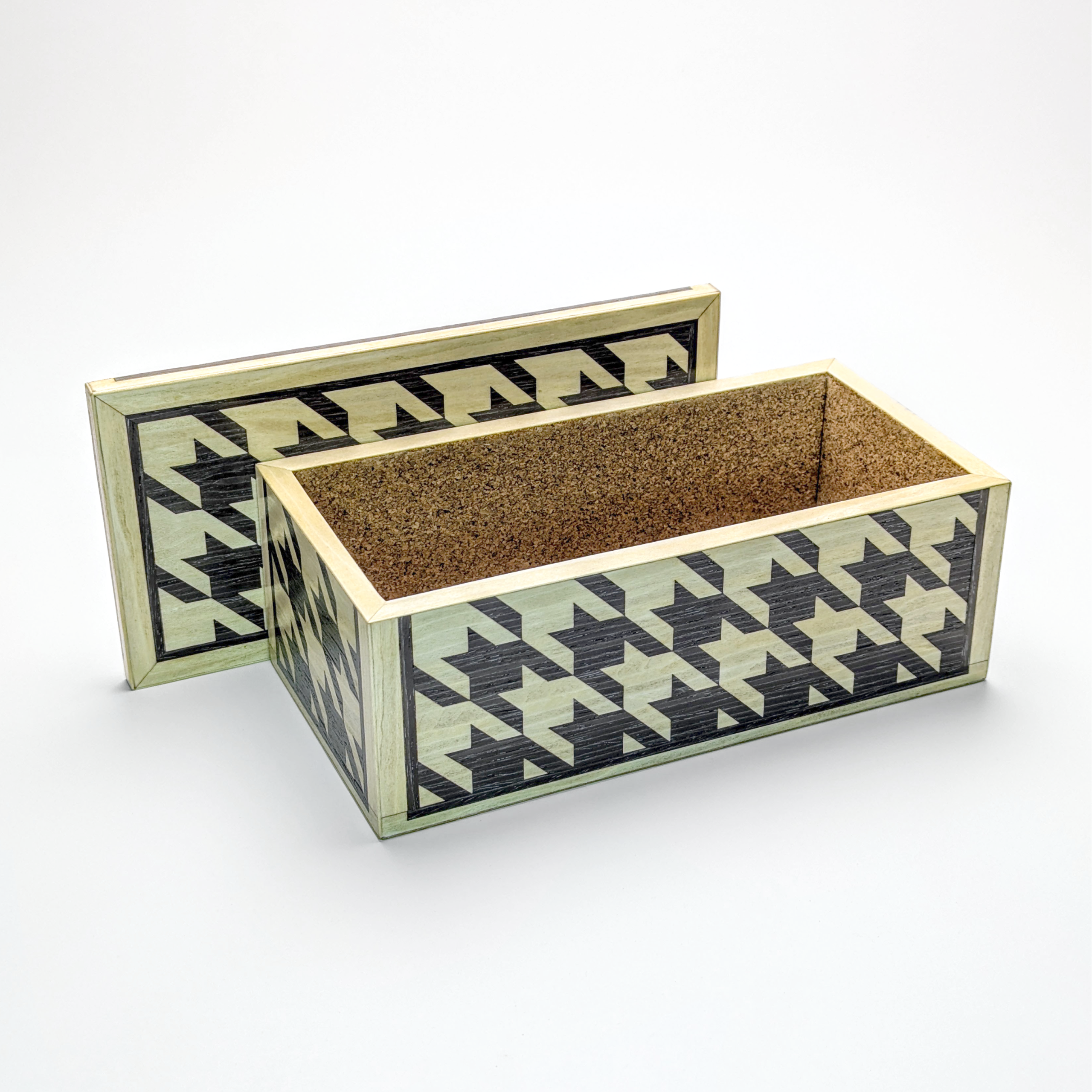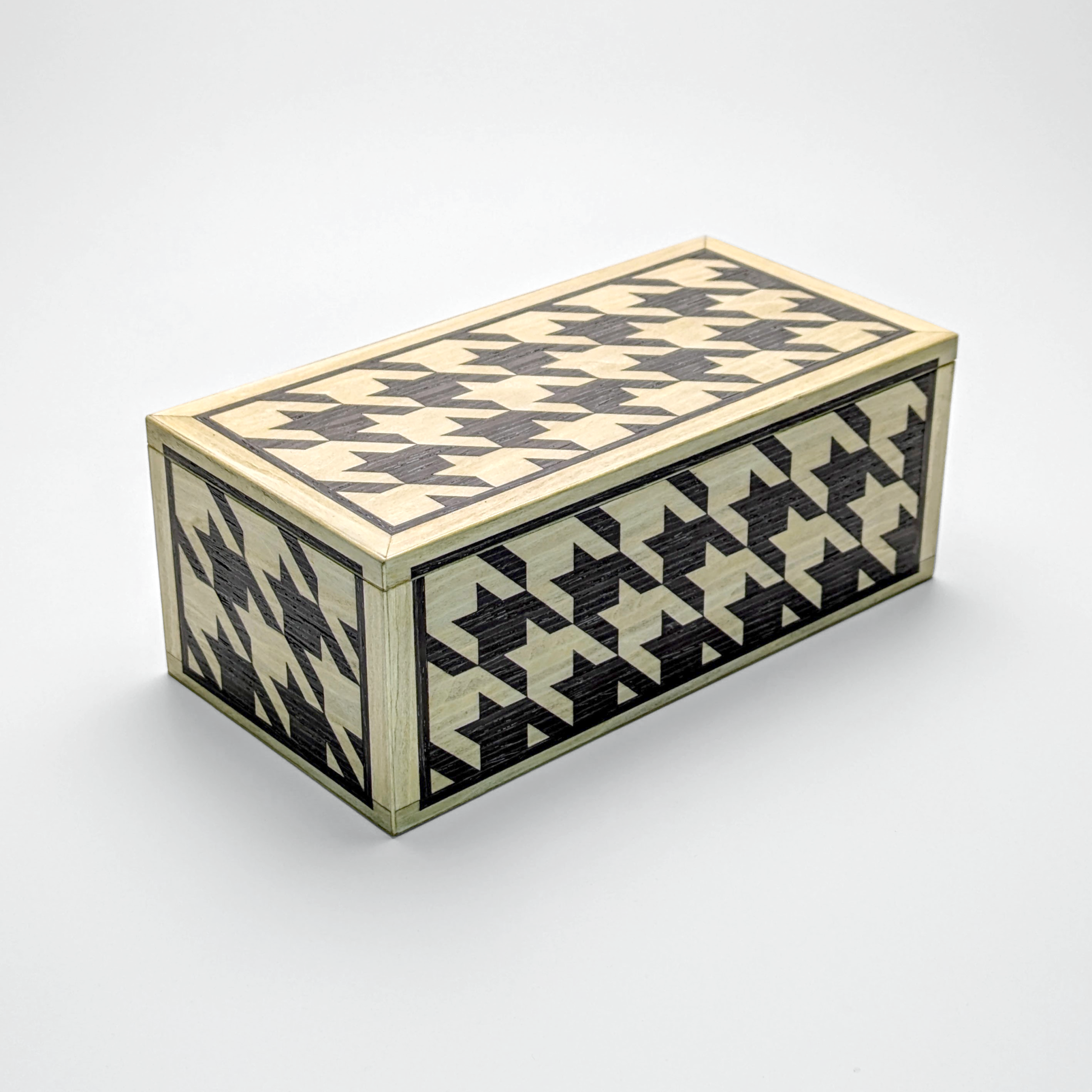 Crafted for those who appreciate the intricacies of fine woodworking, this box features a complex houndstooth motif achieved through traditional marquetry techniques. Using the French Boulle technique not only means there is very little waste, but that each box has an opposite with an inverted visual dialogue.
