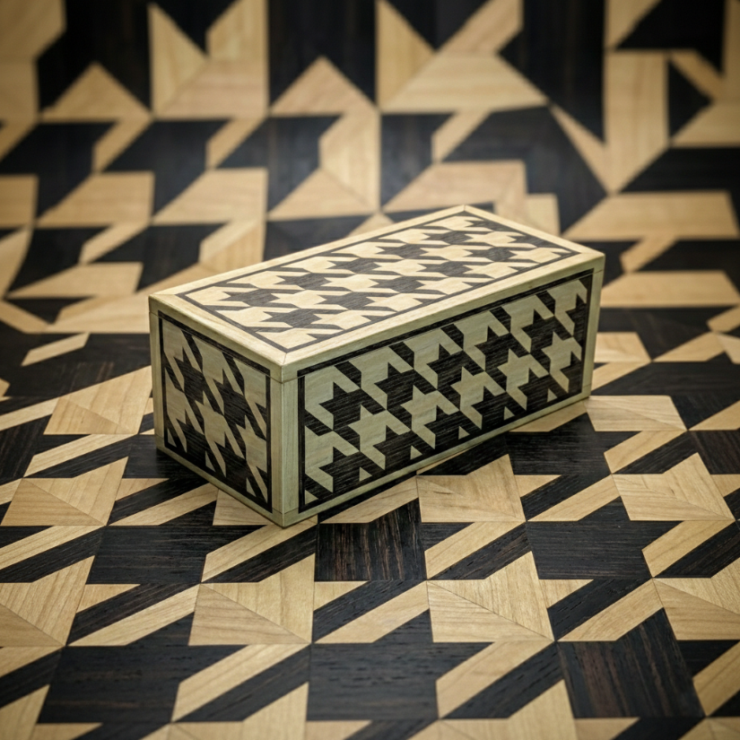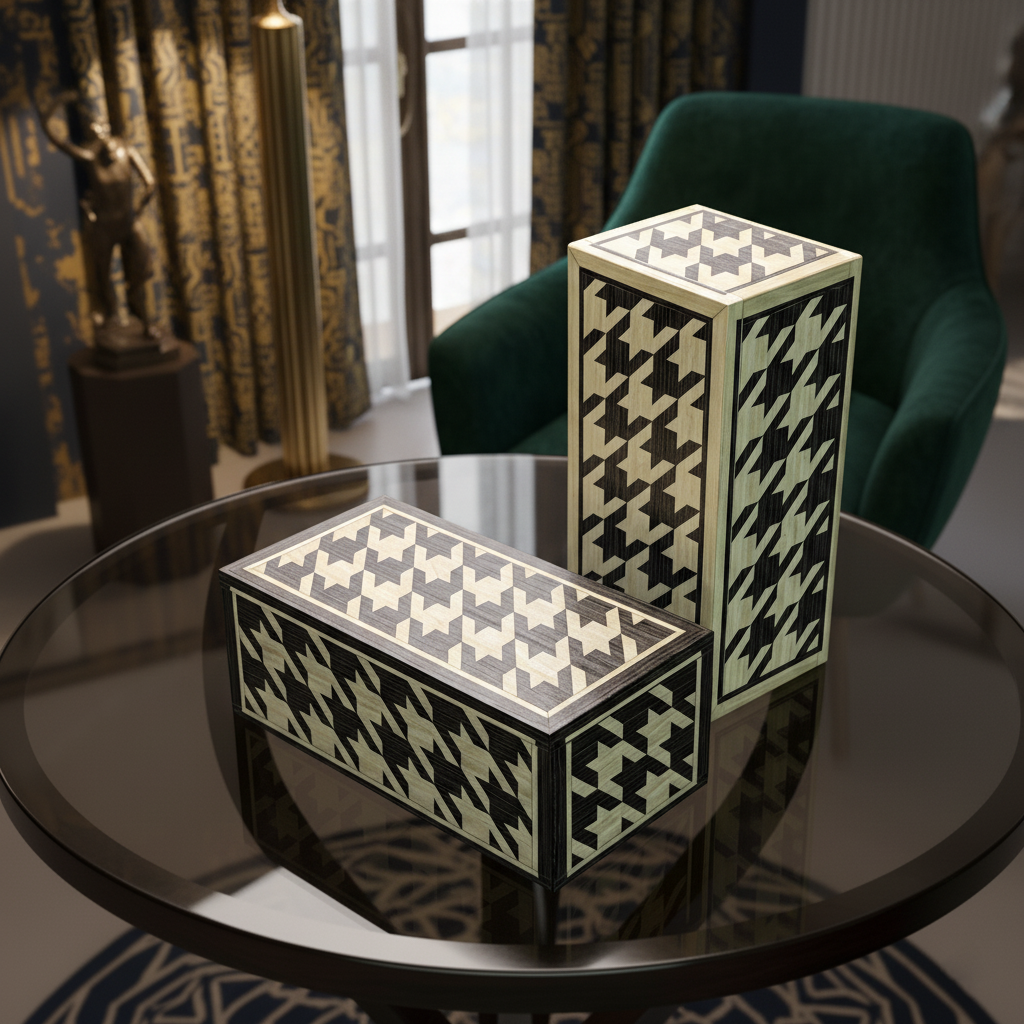 Elevate your space with a masterclass in geometric precision. This hand-crafted marquetry box reimagines the timeless houndstooth pattern through the organic warmth of fine wood veneers. Each piece is meticulously cut and inlaid to create a seamless, tactile surface that blurs the line between traditional craft and contemporary art.