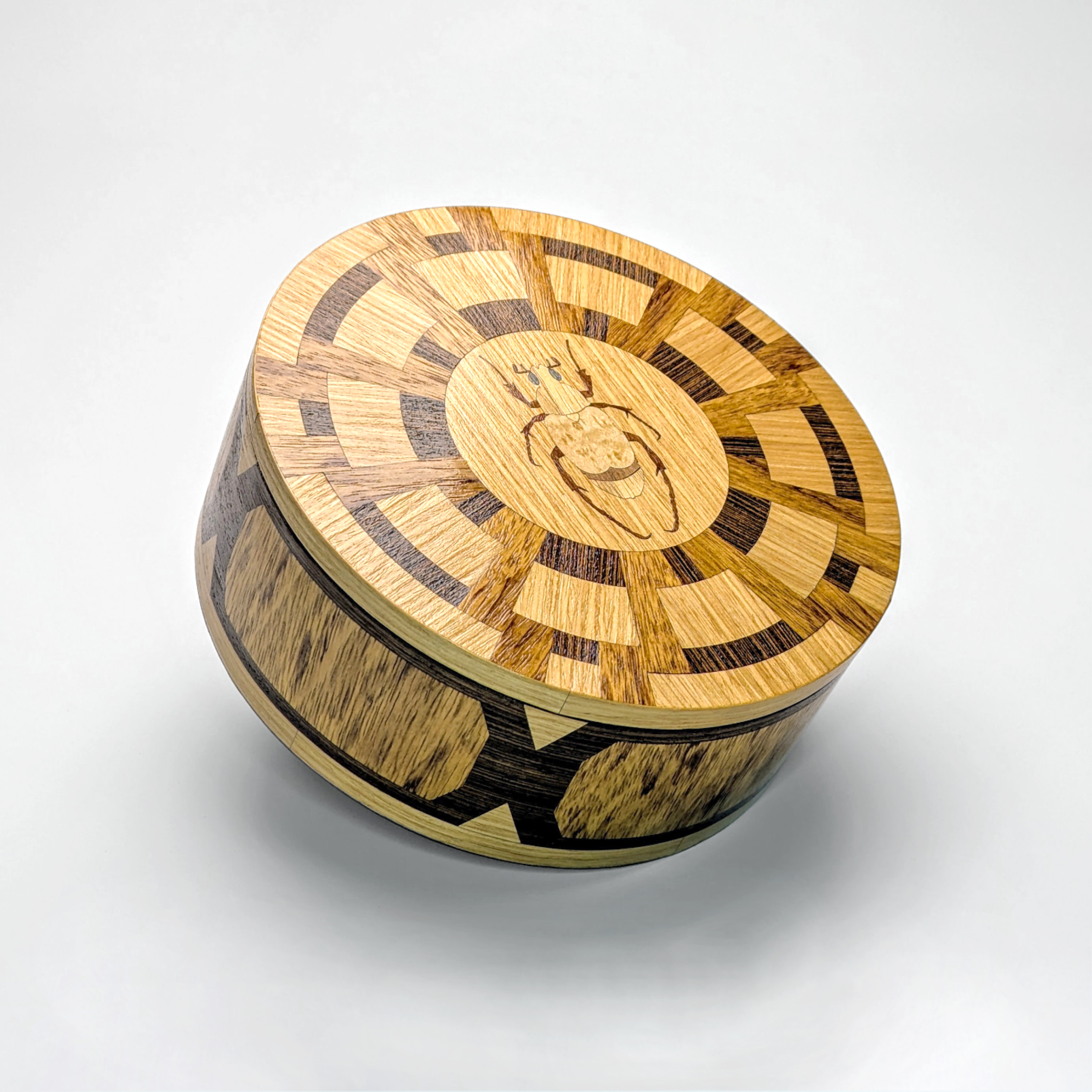 Elevate your collection with a piece that marries ancient geometry with the delicate beauty of the natural world. This exquisite circular box features a meticulous radial marquetry design, reminiscent of an Aztec sunstone, rendered in a sophisticated palette of Wenge, White Oak, Cerejeira and various contrasting hardwoods.