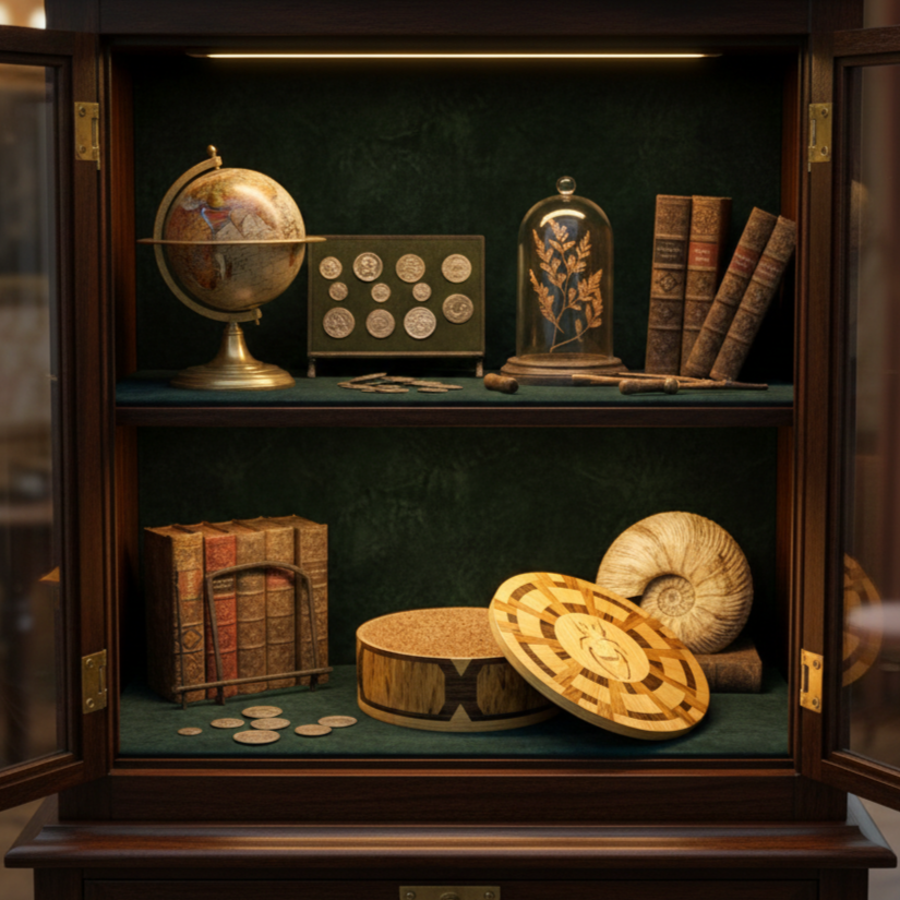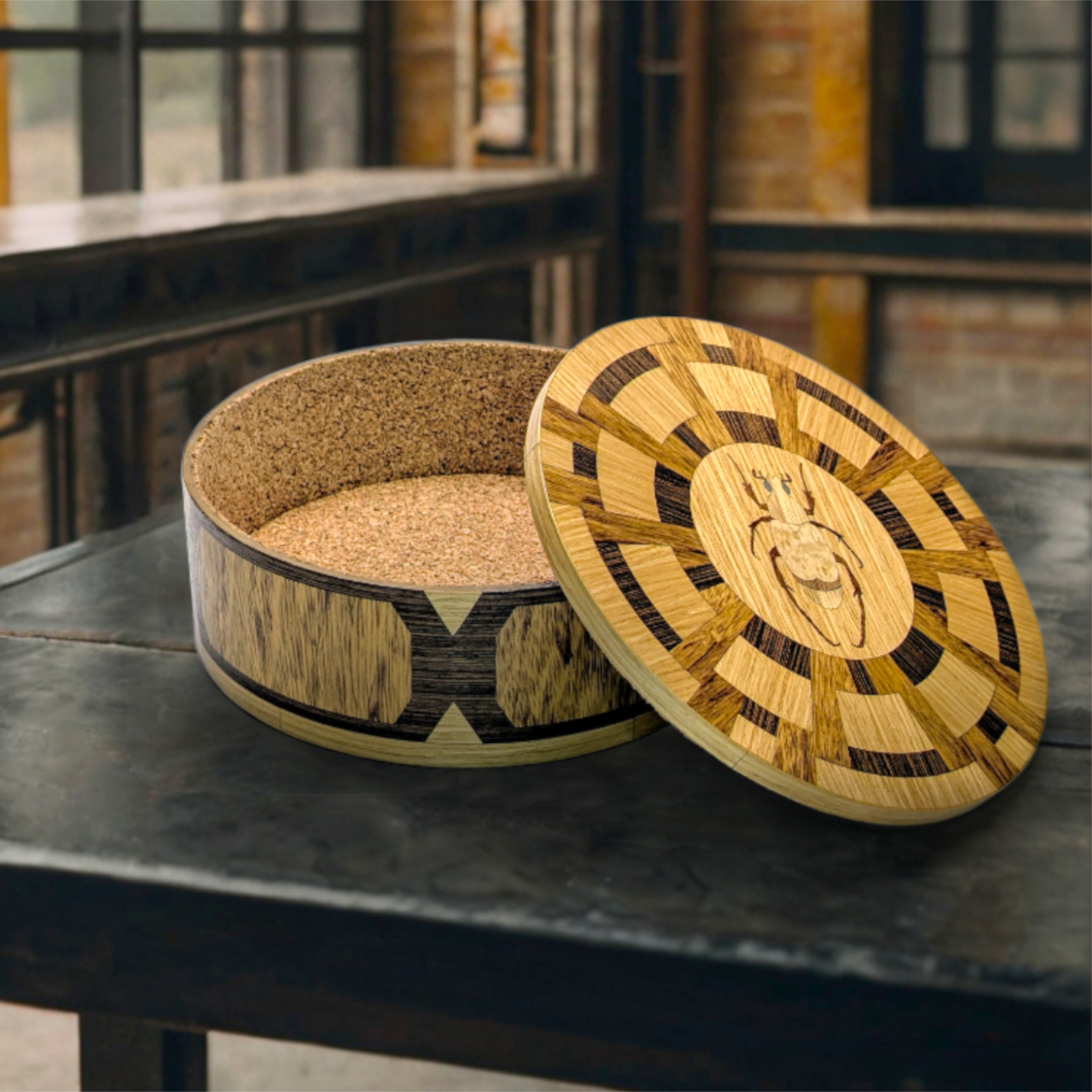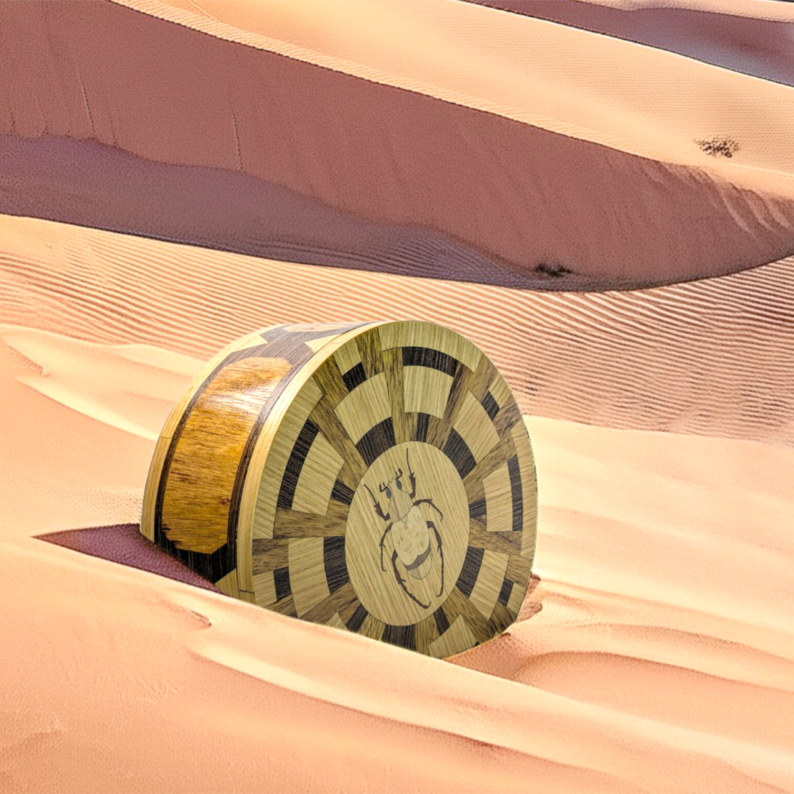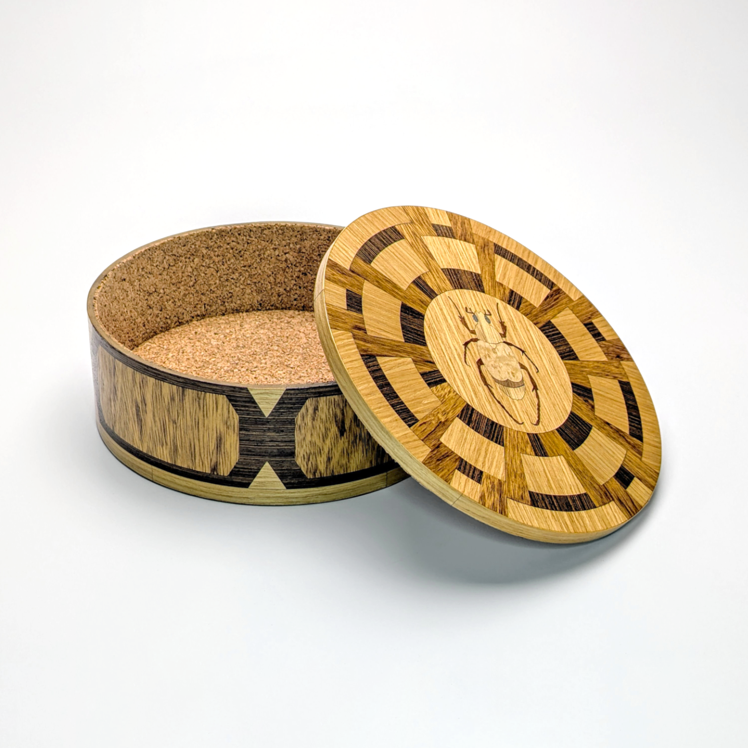 At its heart sits a masterfully inlaid beetle, a symbol of transformation and protection. The interior is lined with premium cork, providing a soft, tactile home for your most cherished jewelry or keepsakes.