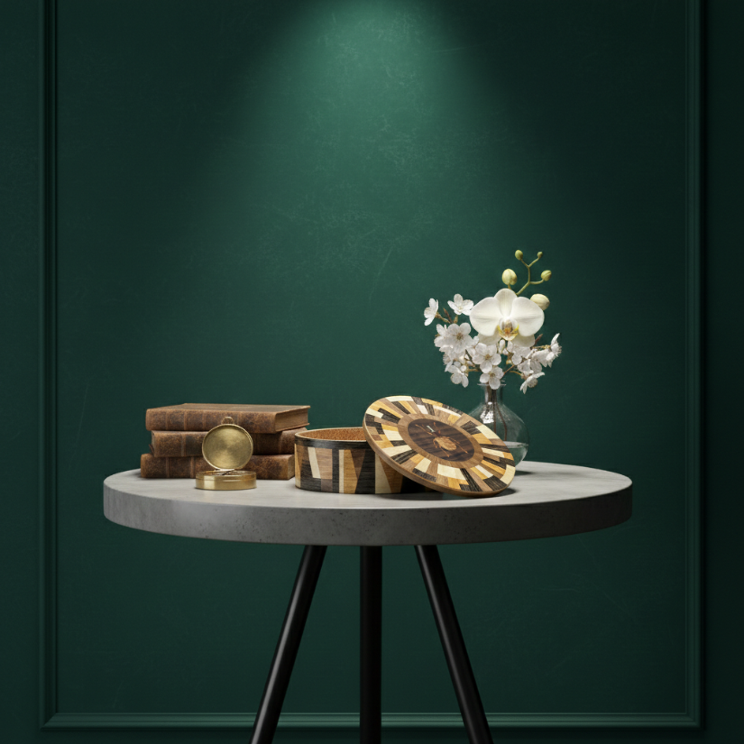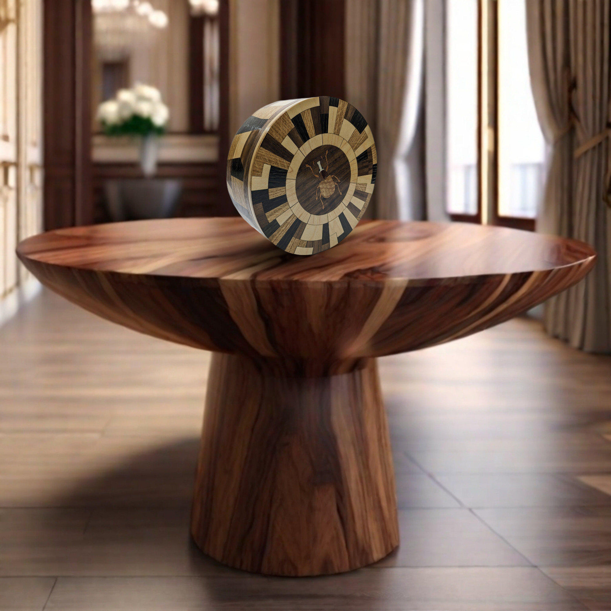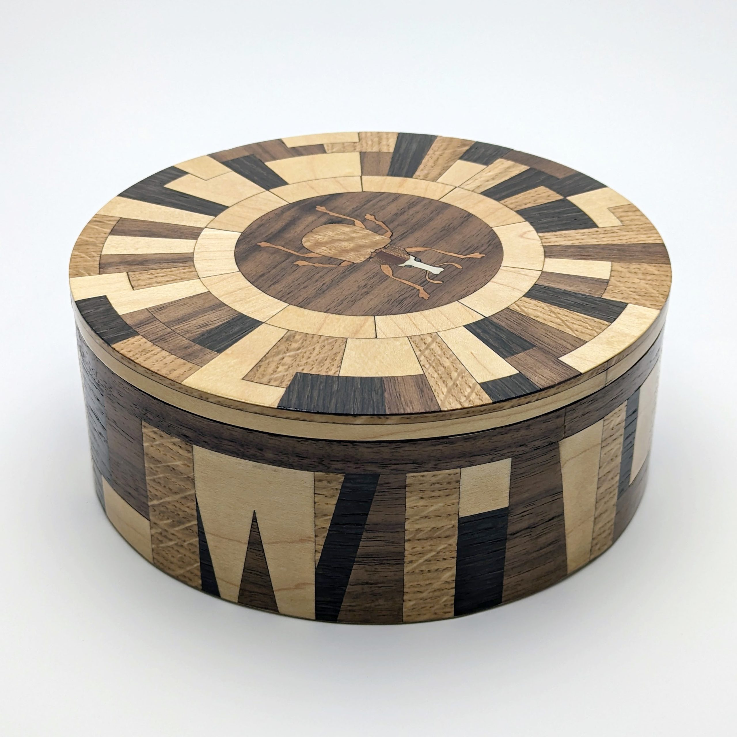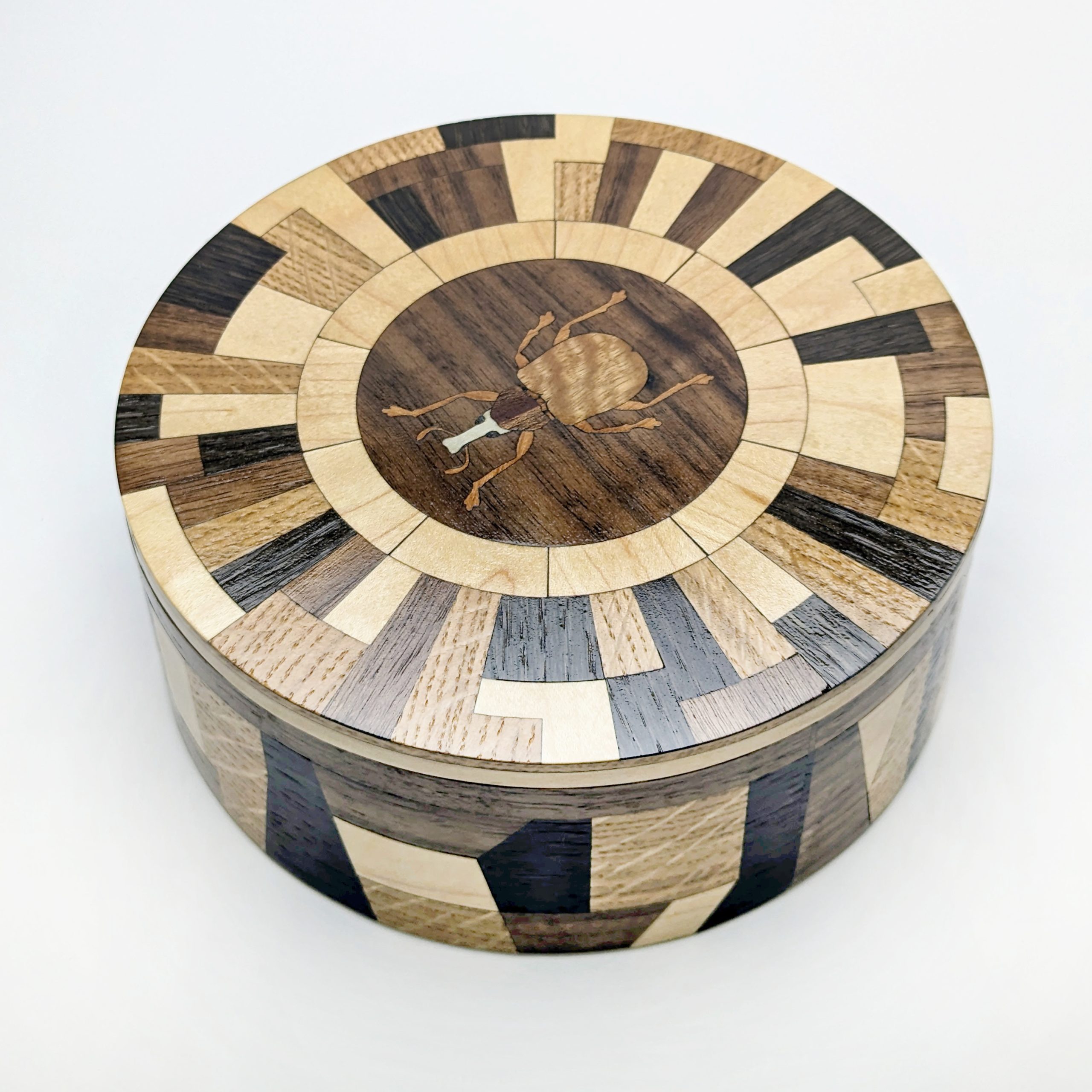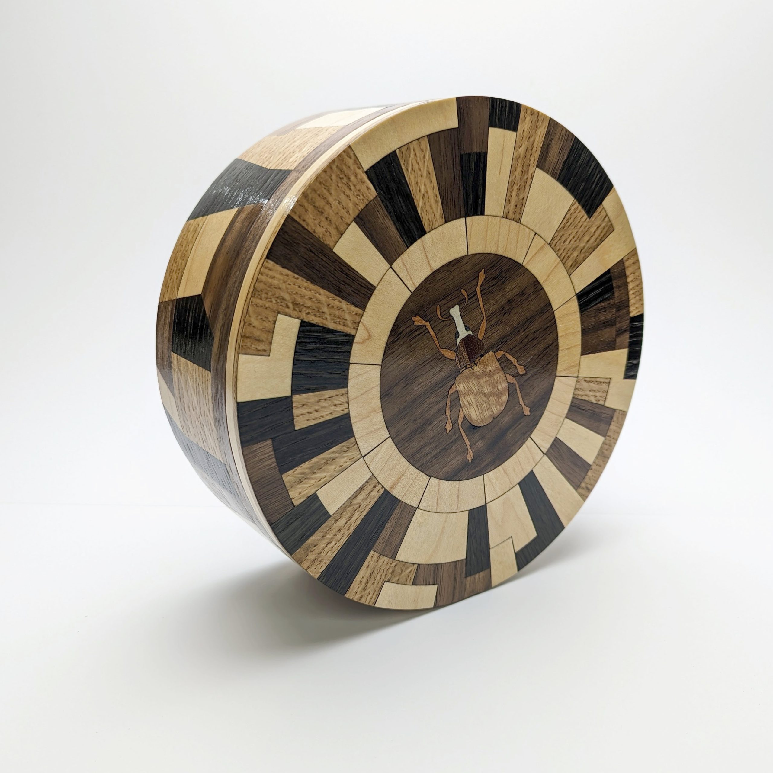 Where natural curiosity meets avant-garde design. The Matrix Beetle collection is a statement that challenges the traditional boundaries of woodwork. Featuring a complex, radial geometric lid and a matching architectural wrap on the side, this vessel creates a rhythmic dance of light and dark tones. At its center sits a finely detailed beetle inlay, a delicate nod to the organic world amidst a sea of striking geometric precision. It is a sophisticated sanctuary for your most treasured objects.