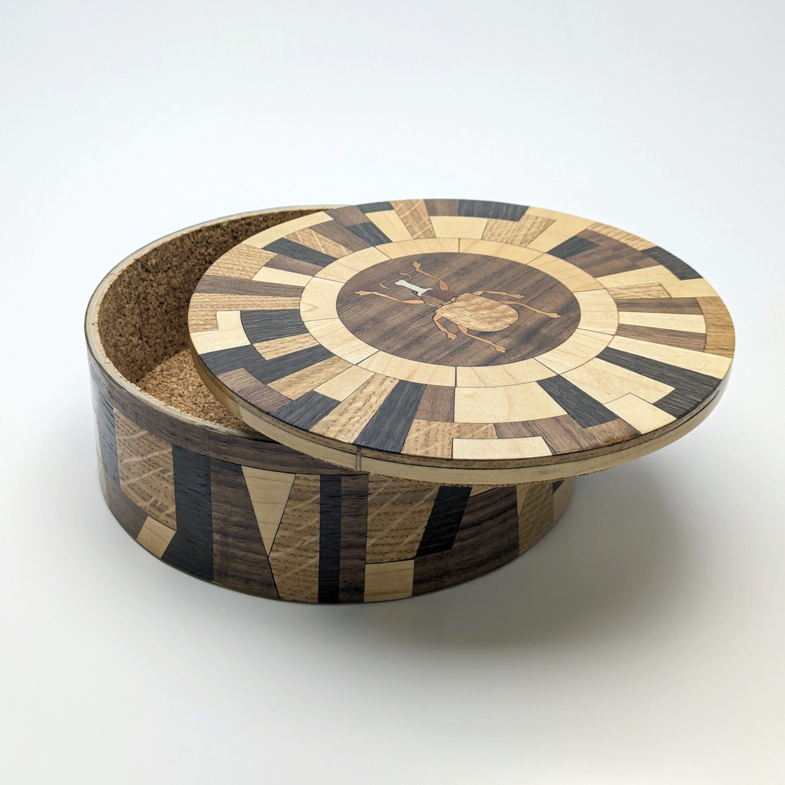 Made from Black oak, Walnut, Bamboo, Maple and various woods for the beetle, this box is hand finished with shellac and beeswax to a deep rich semigloss. The Matrix collection; characterized by high-contrast, interlocking geometric patterns, highlights the stark contrast between the man-made and natural worlds.