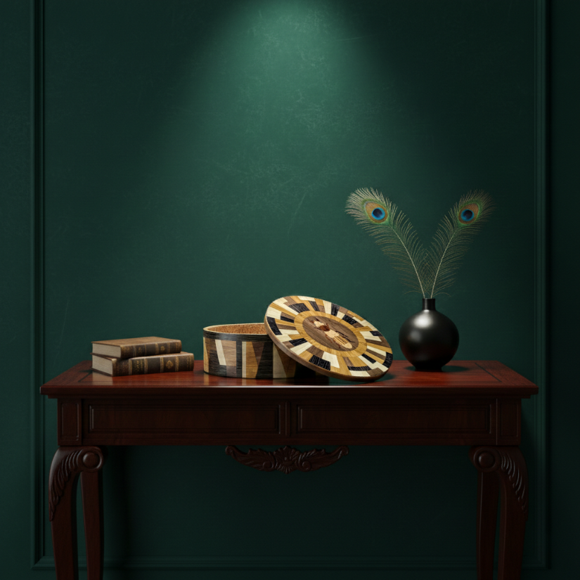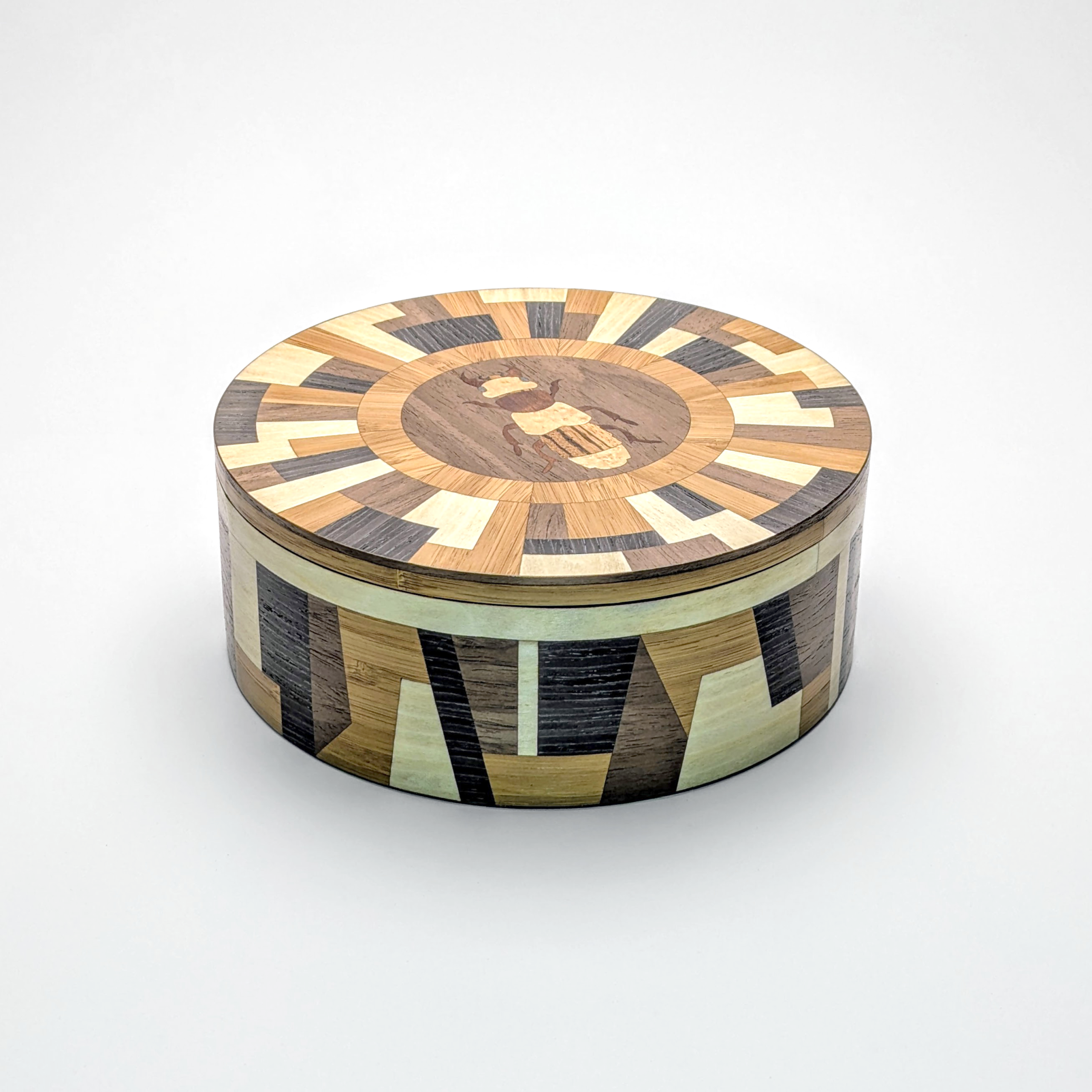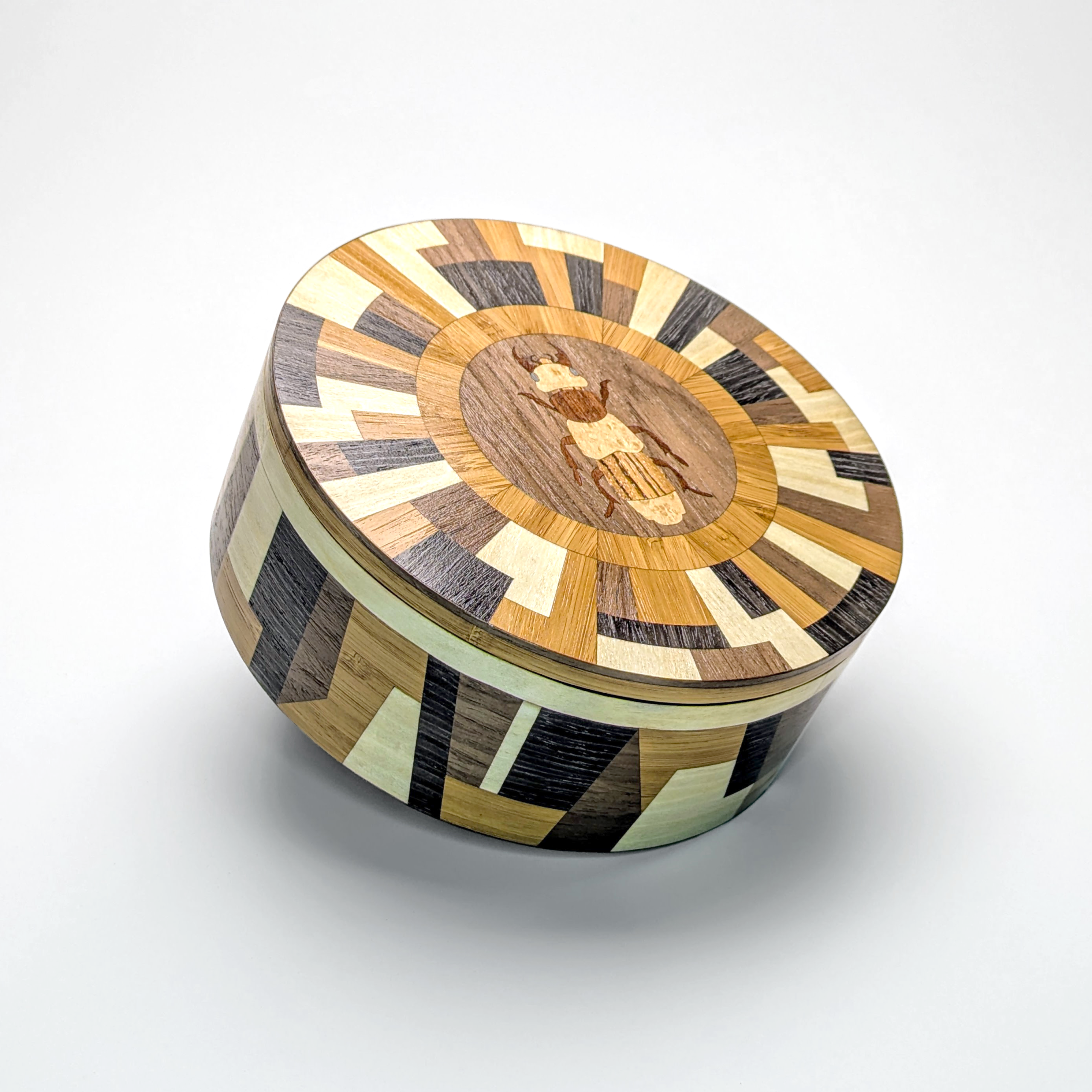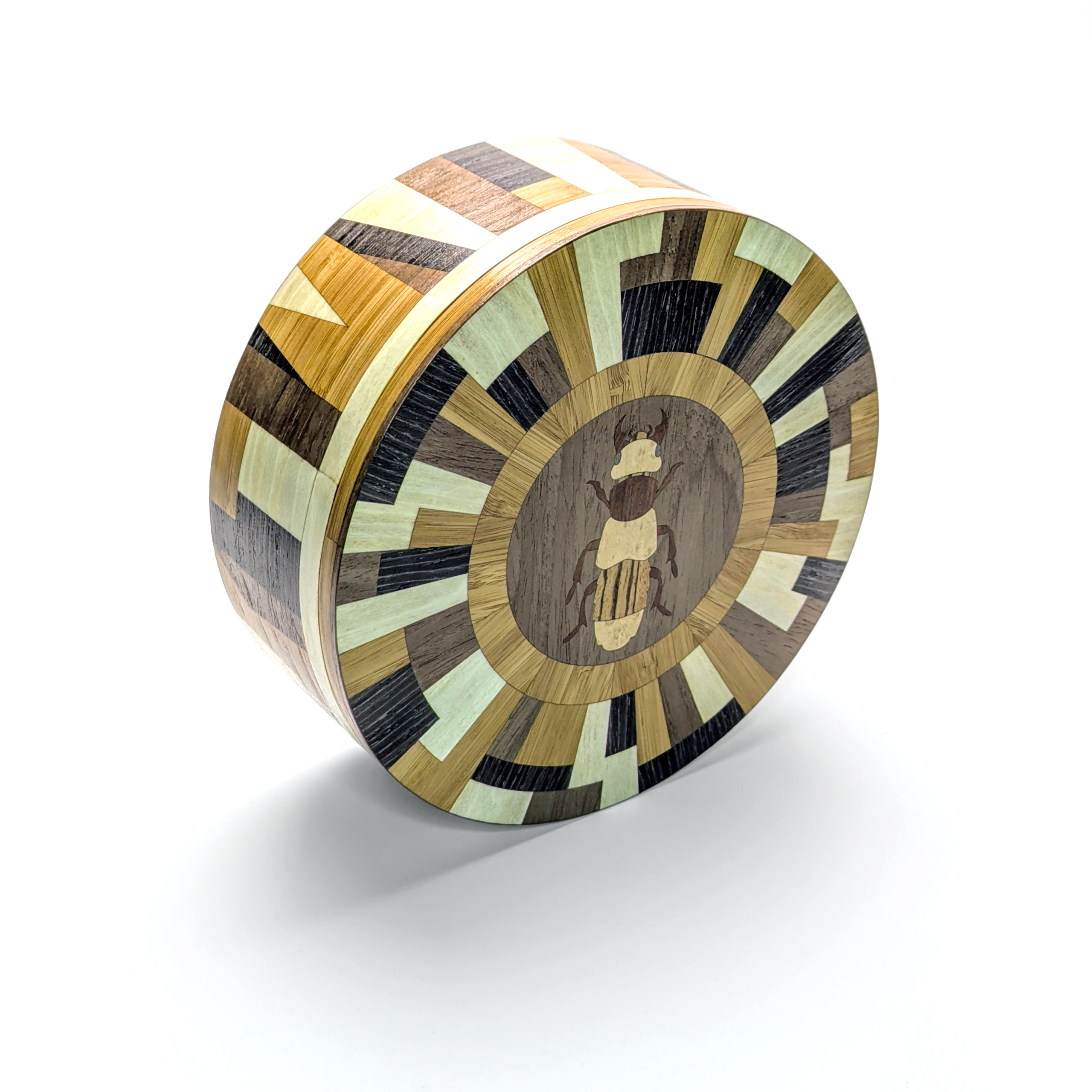 Where natural curiosity meets avant-garde design. The Matrix Beetle collection is a statement that challenges the traditional boundaries of woodwork. Featuring a complex, radial geometric lid and a matching architectural wrap on the side, this vessel creates a rhythmic dance of light and dark tones. At its center sits a finely detailed beetle inlay, a delicate nod to the organic world amidst a sea of striking geometric precision. It is a sophisticated sanctuary for your most treasured objects.