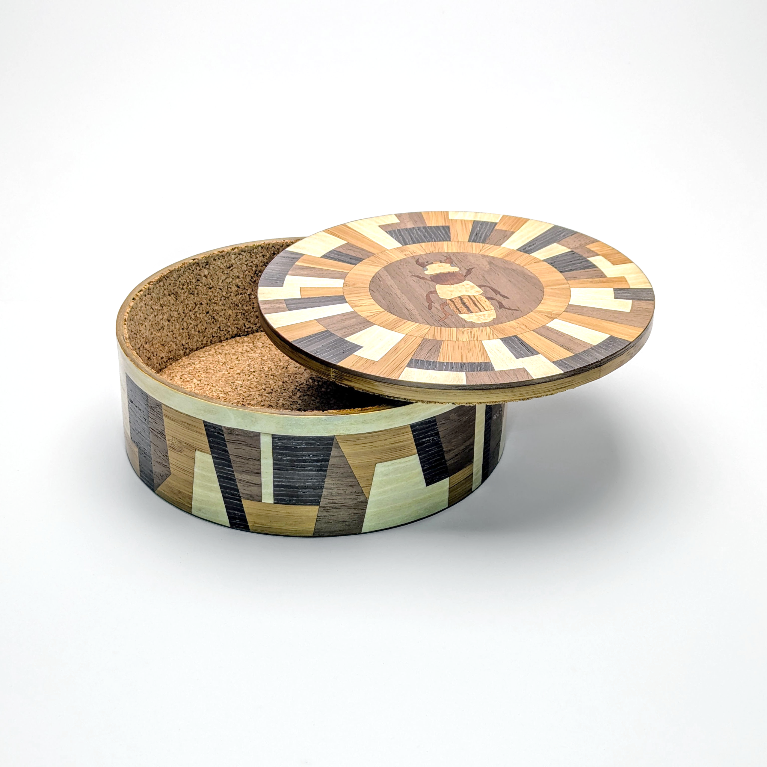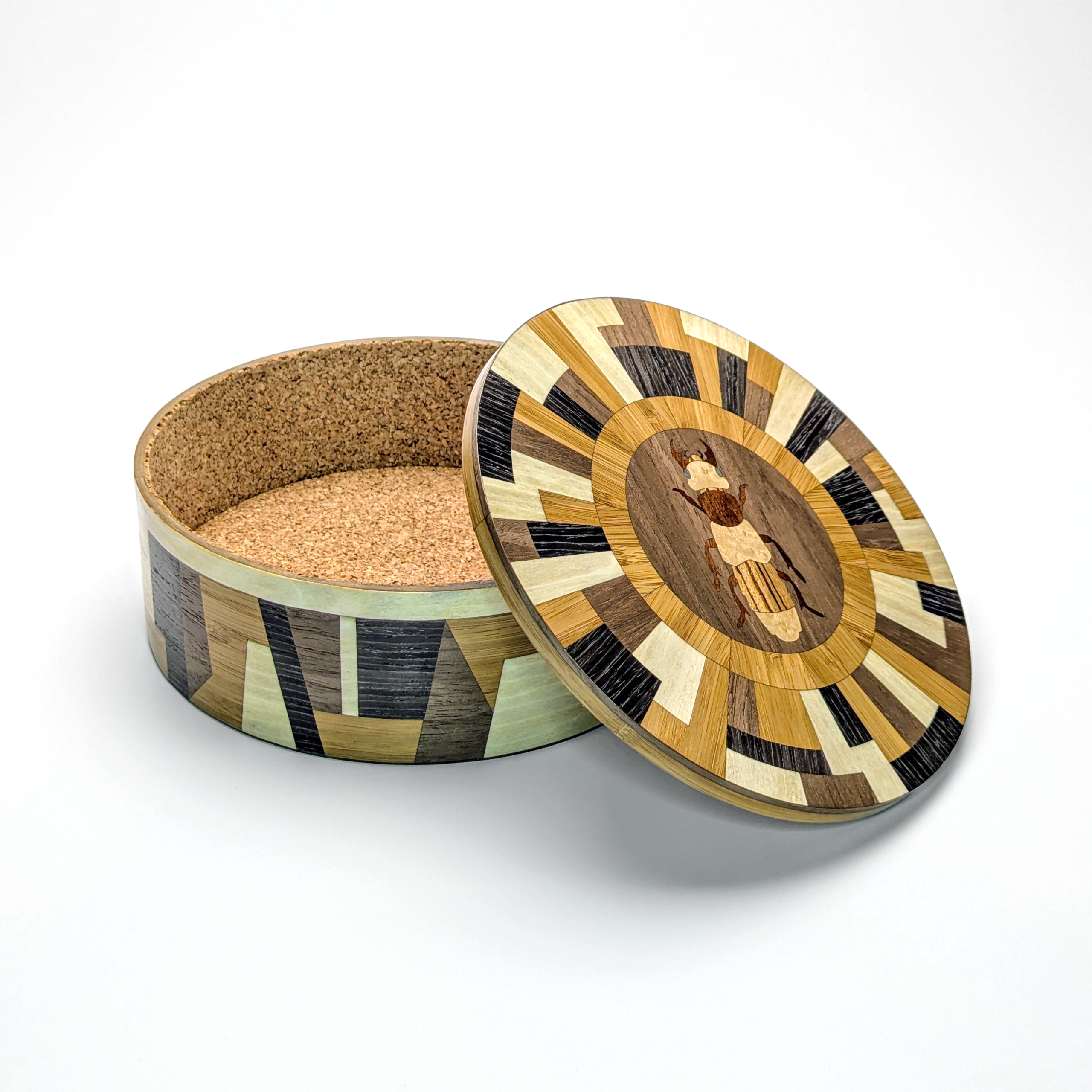 Bold. Geometric. Exceptional. This handmade marquetry box features an intricate Emus Hirtus beetle motif surrounded by a high-contrast wood matrix. With its architectural side detailing and soft cork lining, it’s a contemporary masterpiece for your desktop or dresser.