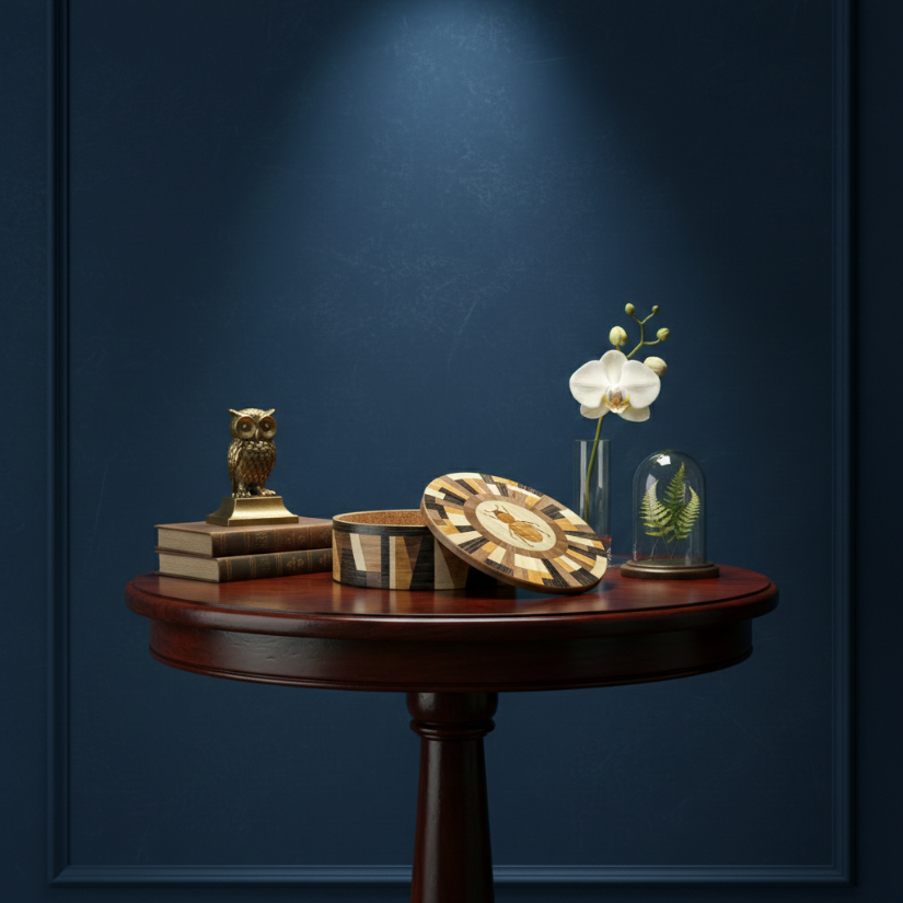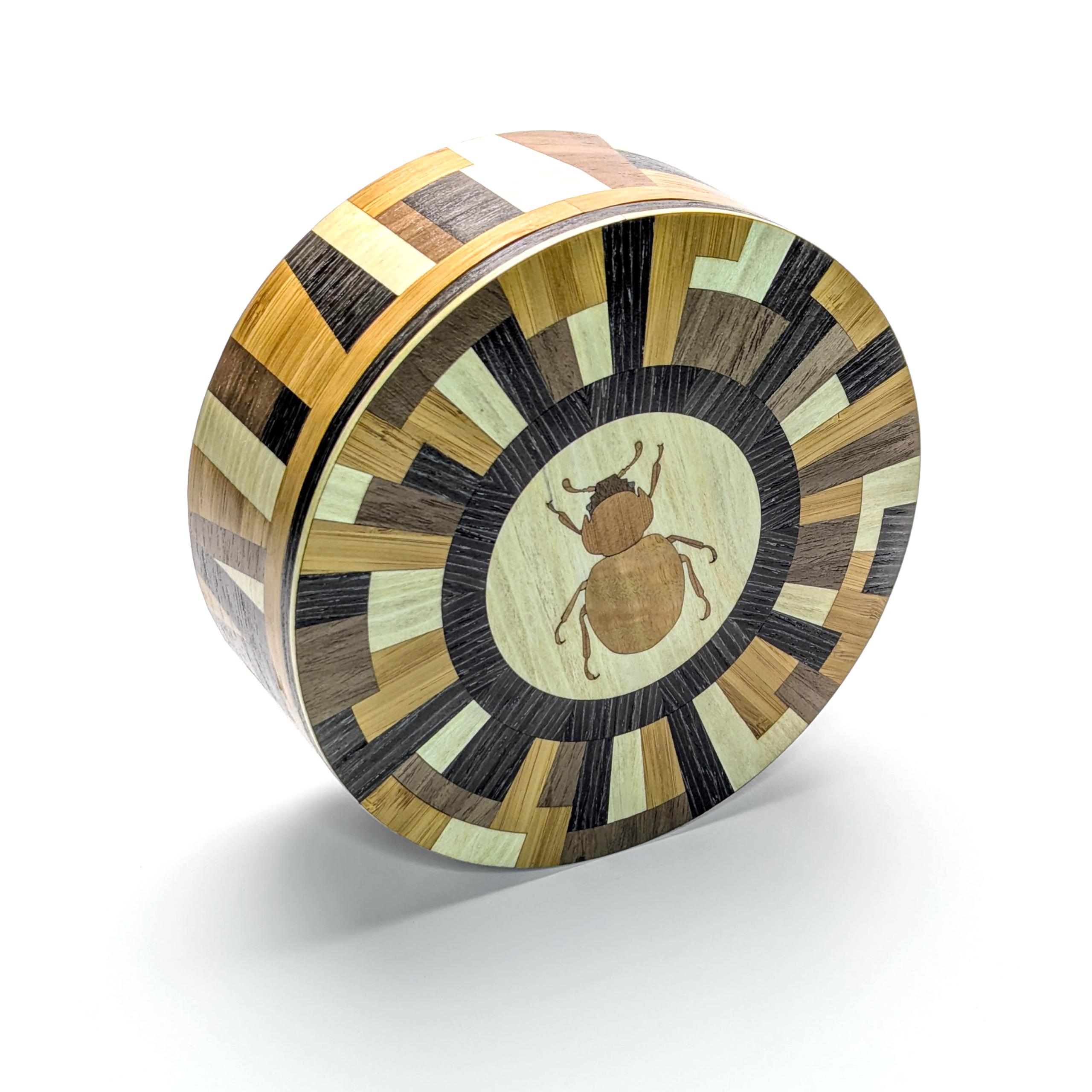 Where natural curiosity meets avant-garde design. The Matrix Beetle collection is a statement that challenges the traditional boundaries of woodwork. Featuring a complex, radial geometric lid and a matching architectural wrap on the side, this vessel creates a rhythmic dance of light and dark tones. At its center sits a finely detailed beetle inlay, a delicate nod to the organic world amidst a sea of striking geometric precision. It is a sophisticated sanctuary for your most treasured objects.