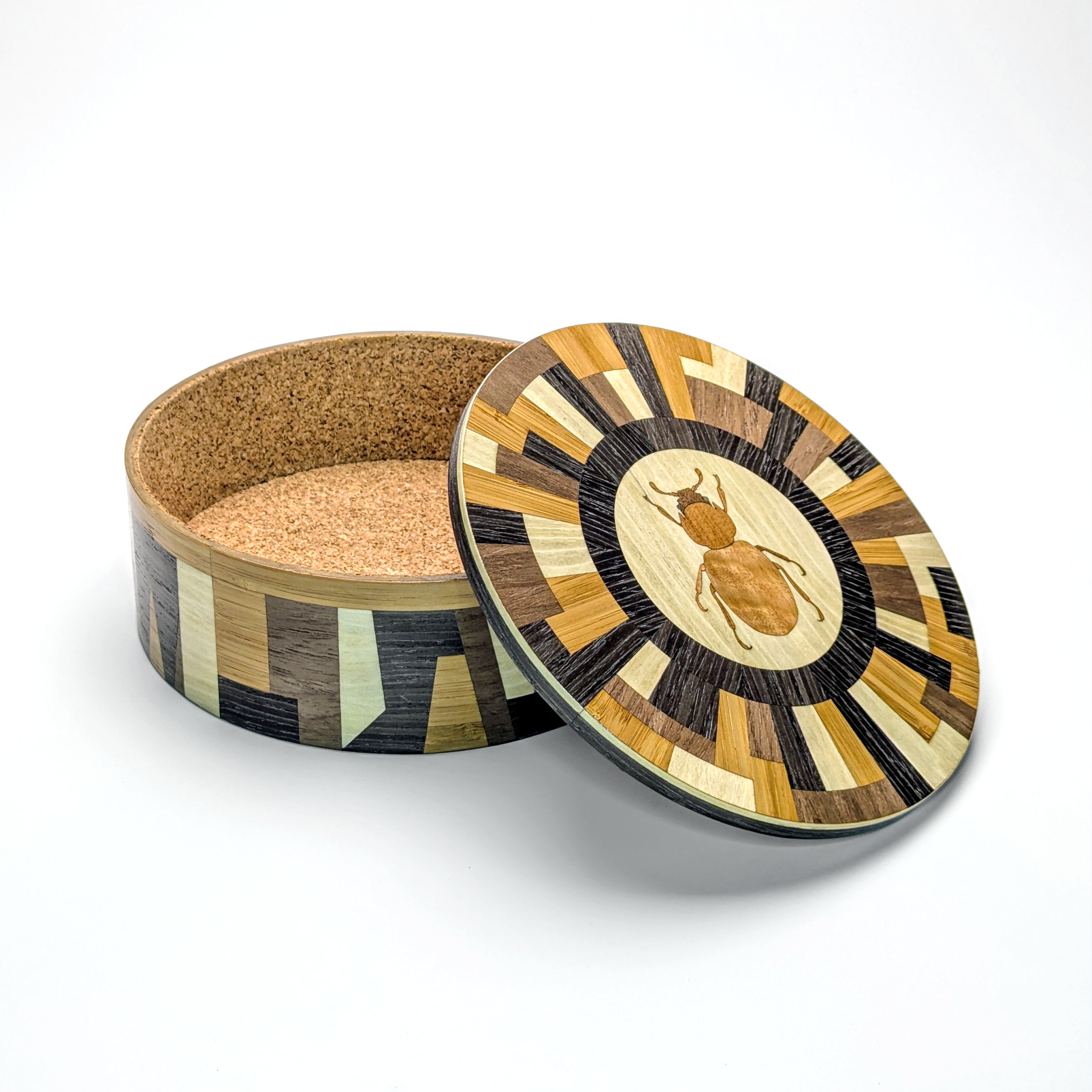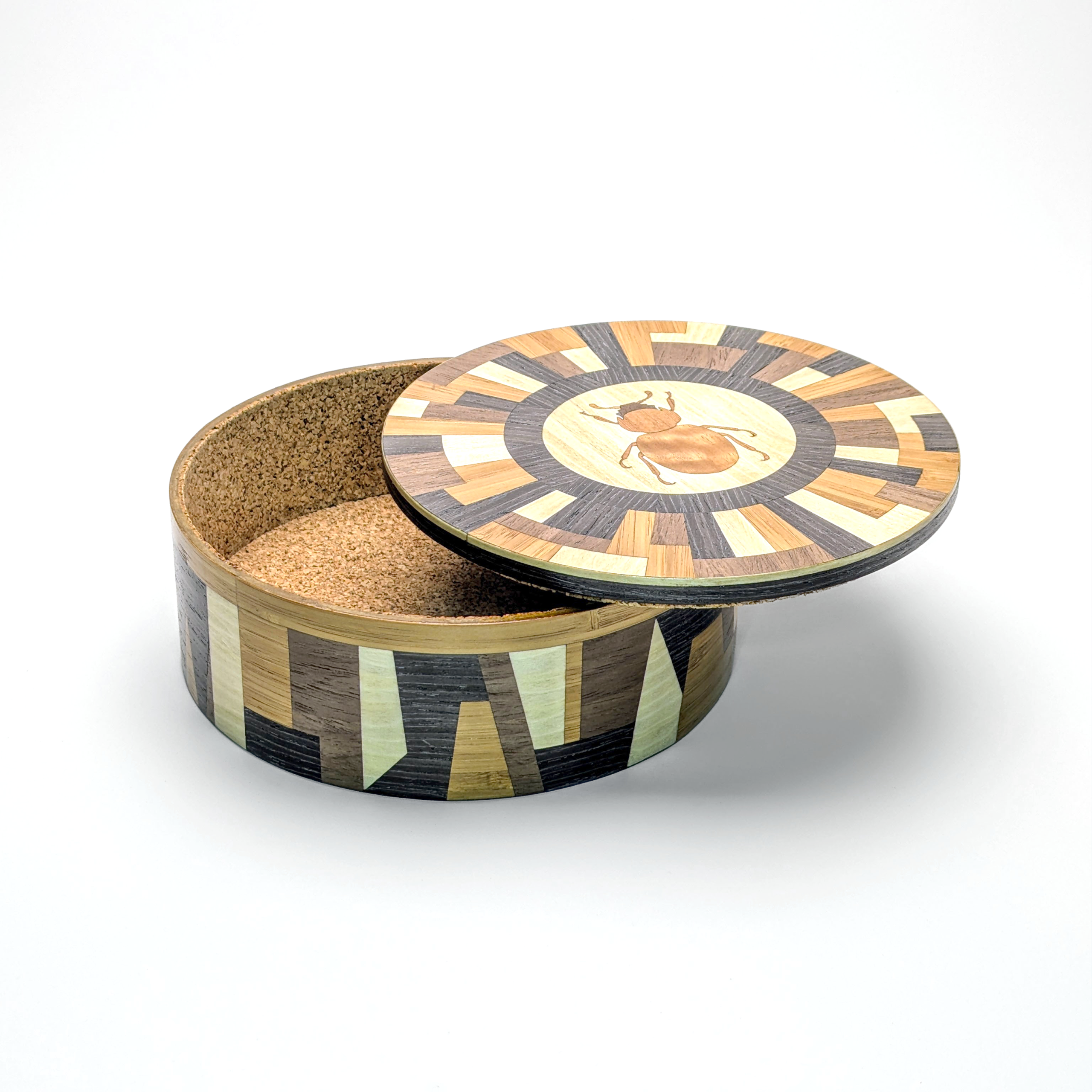 Bold. Geometric. Exceptional. This handmade marquetry box features an intricate Phycosecidae beetle motif surrounded by a high-contrast wood matrix. With its architectural side detailing and soft cork lining, it’s a contemporary masterpiece for your desktop or dresser.