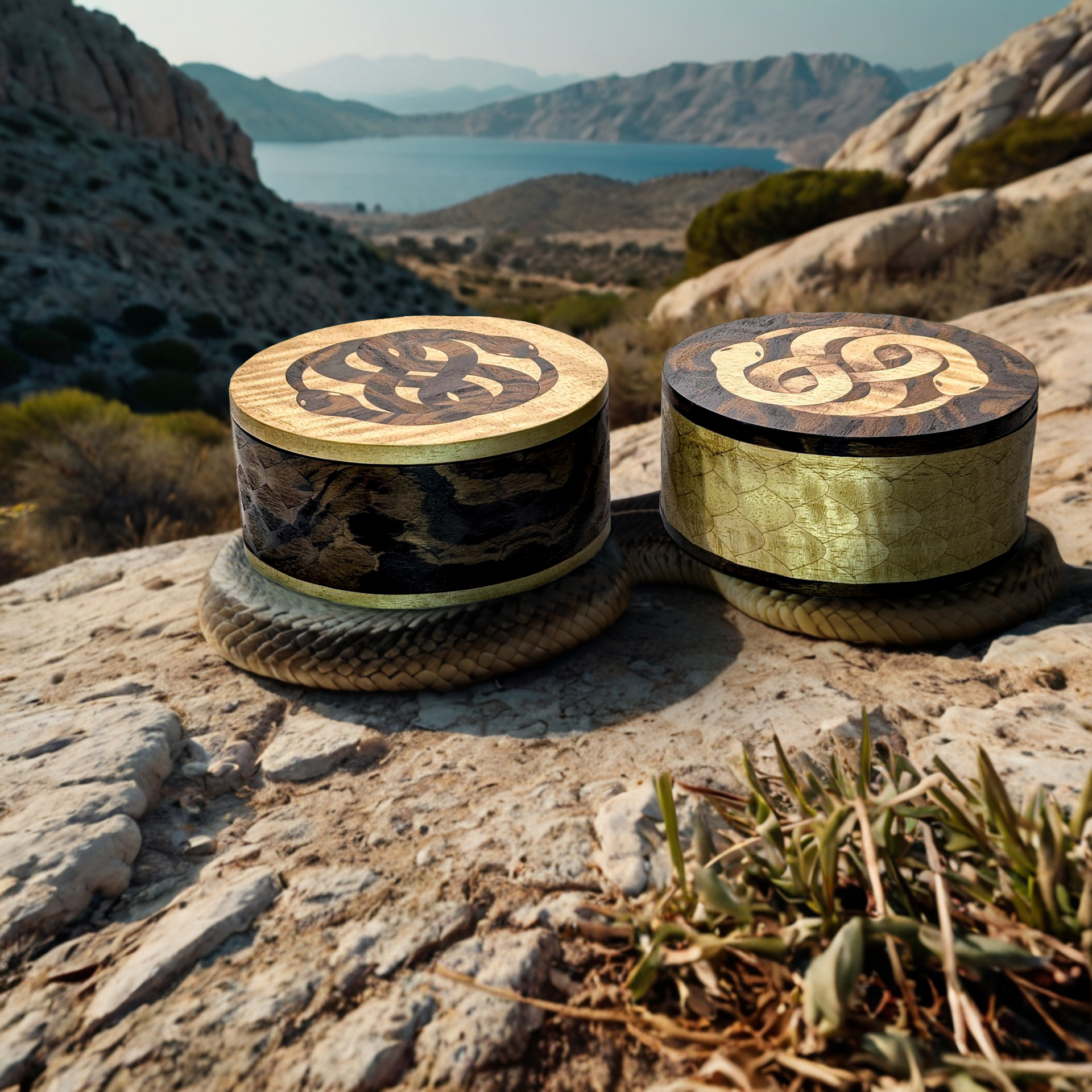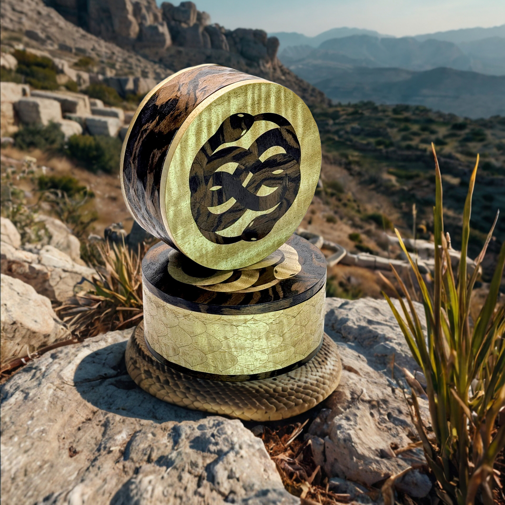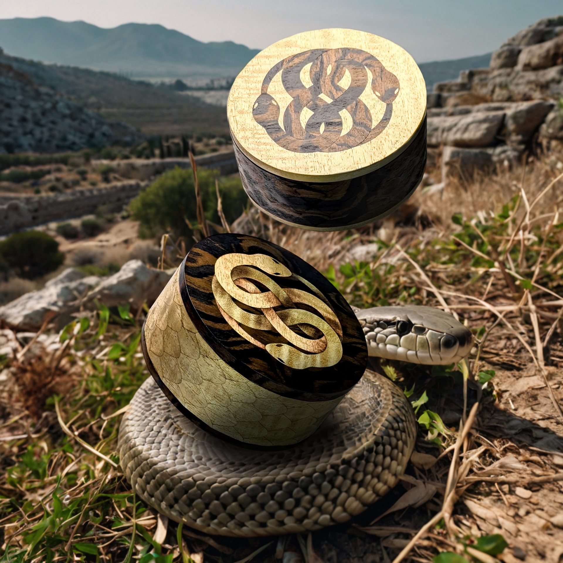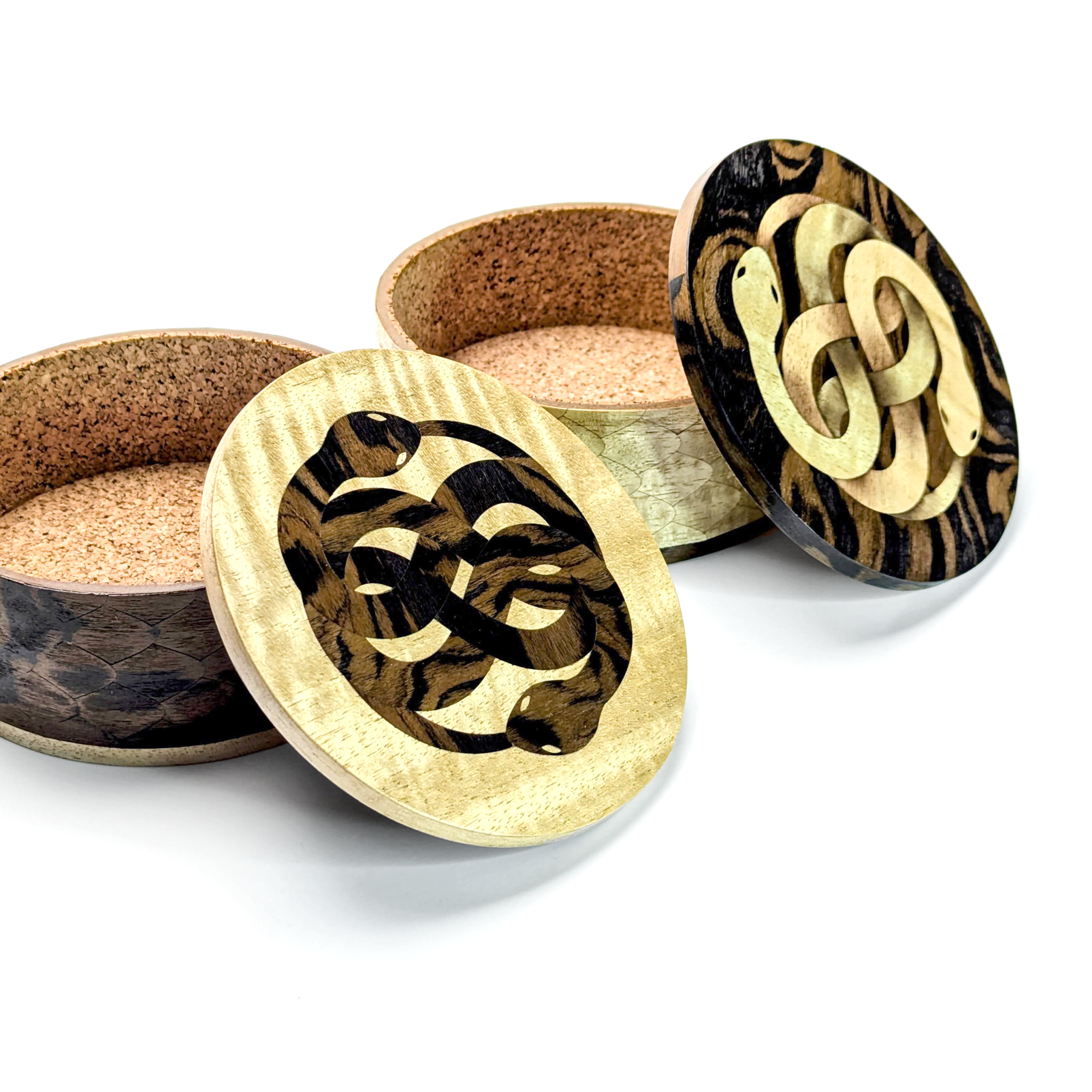 Elevate your desktop or vanity with a piece of functional fine art. These handcrafted circular boxes feature an intricate interlocking snake Oroborus – a symbol of infinity, meticulously inlaid using traditional Boulle marquetry techniques. Constructed using Burl Ebony and Lime wood, the natural chatoyancy of the lime veneer creates the illusion of movement in the snakes when slowly rotated.