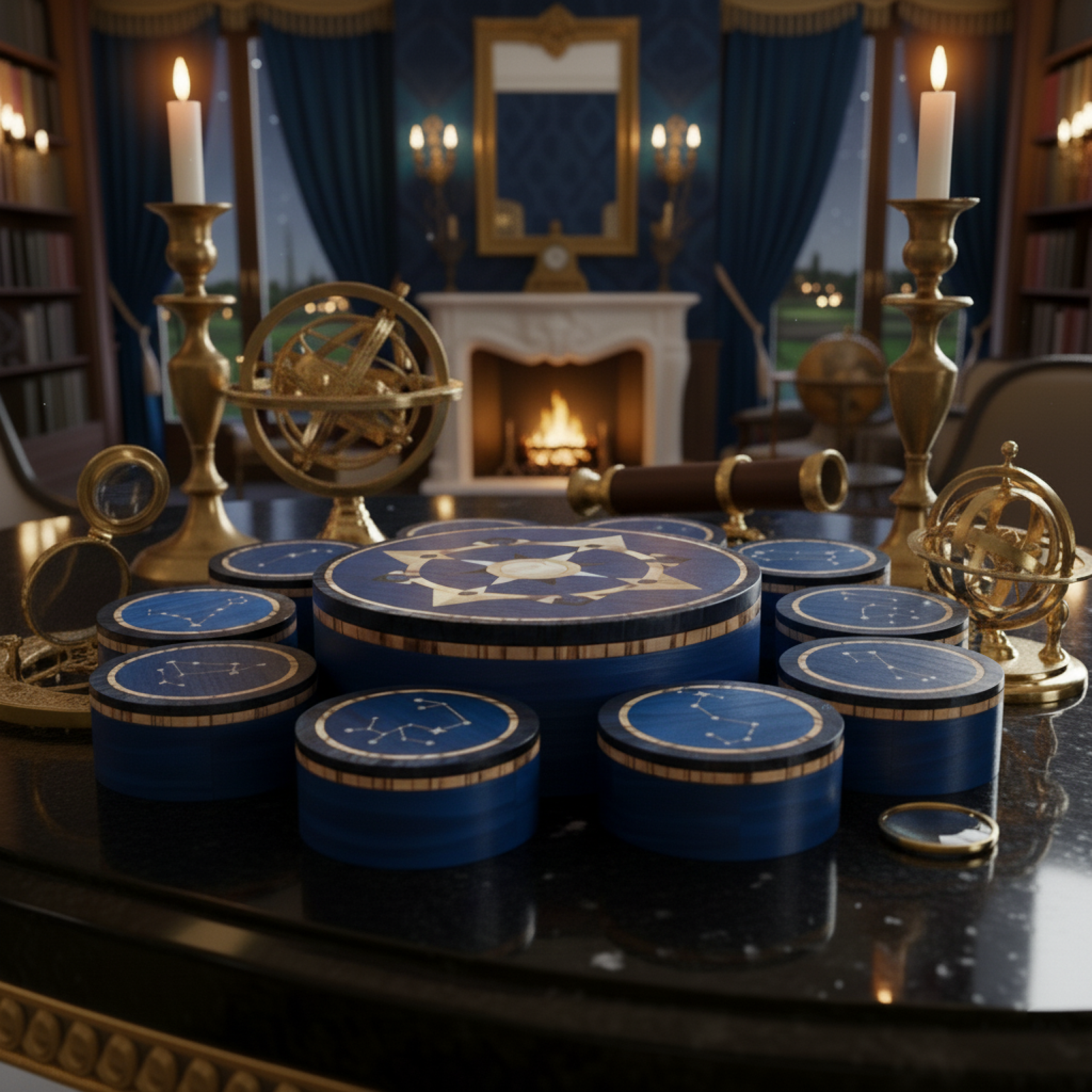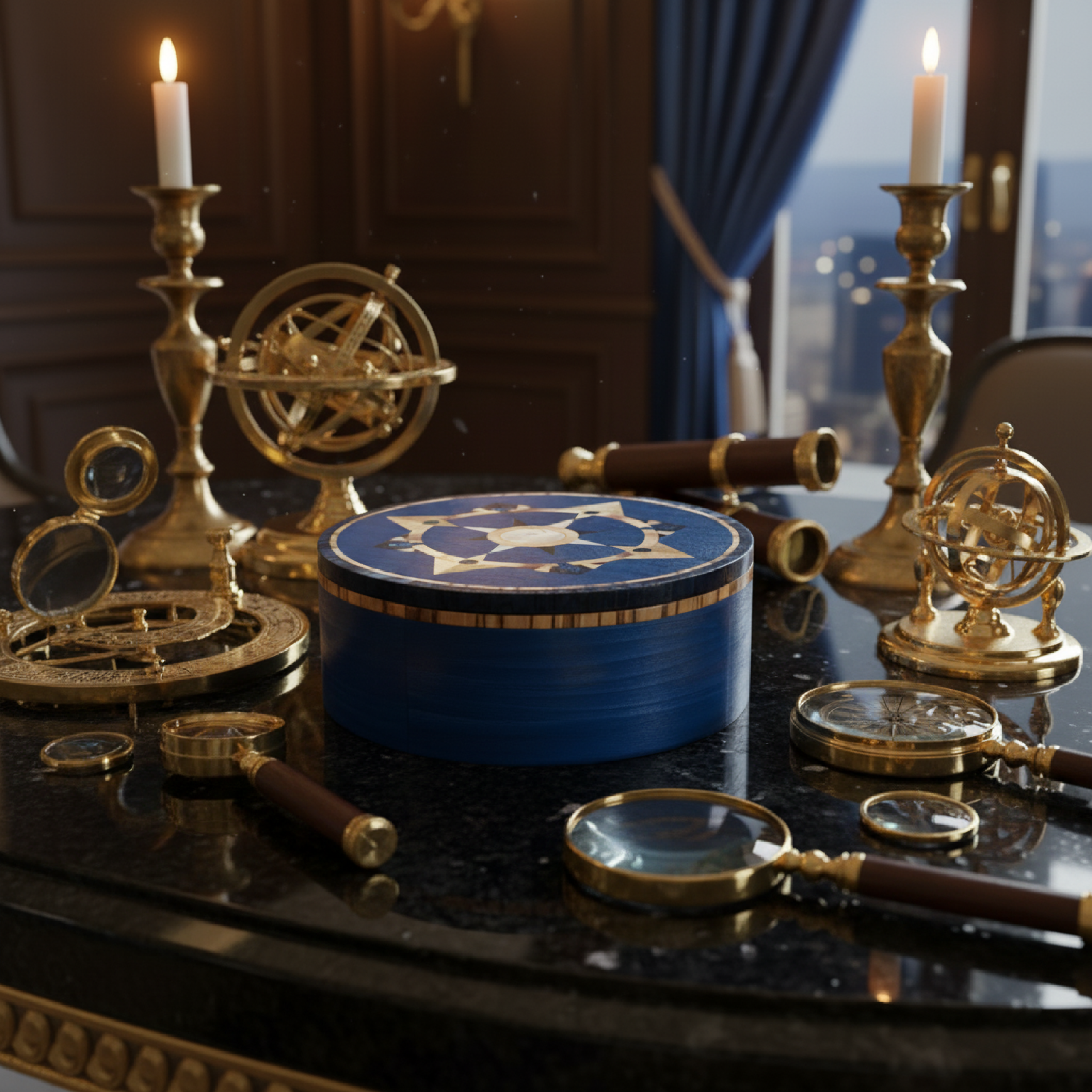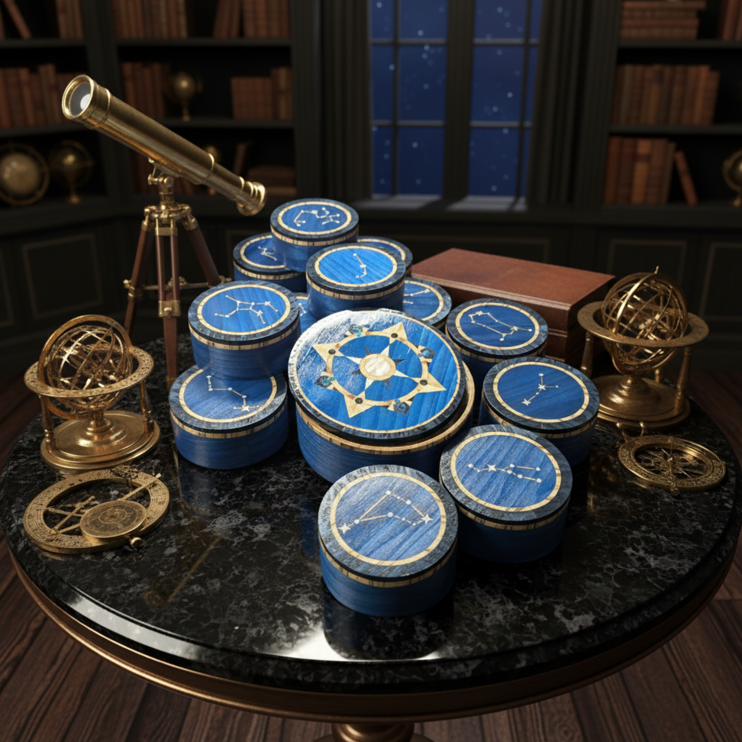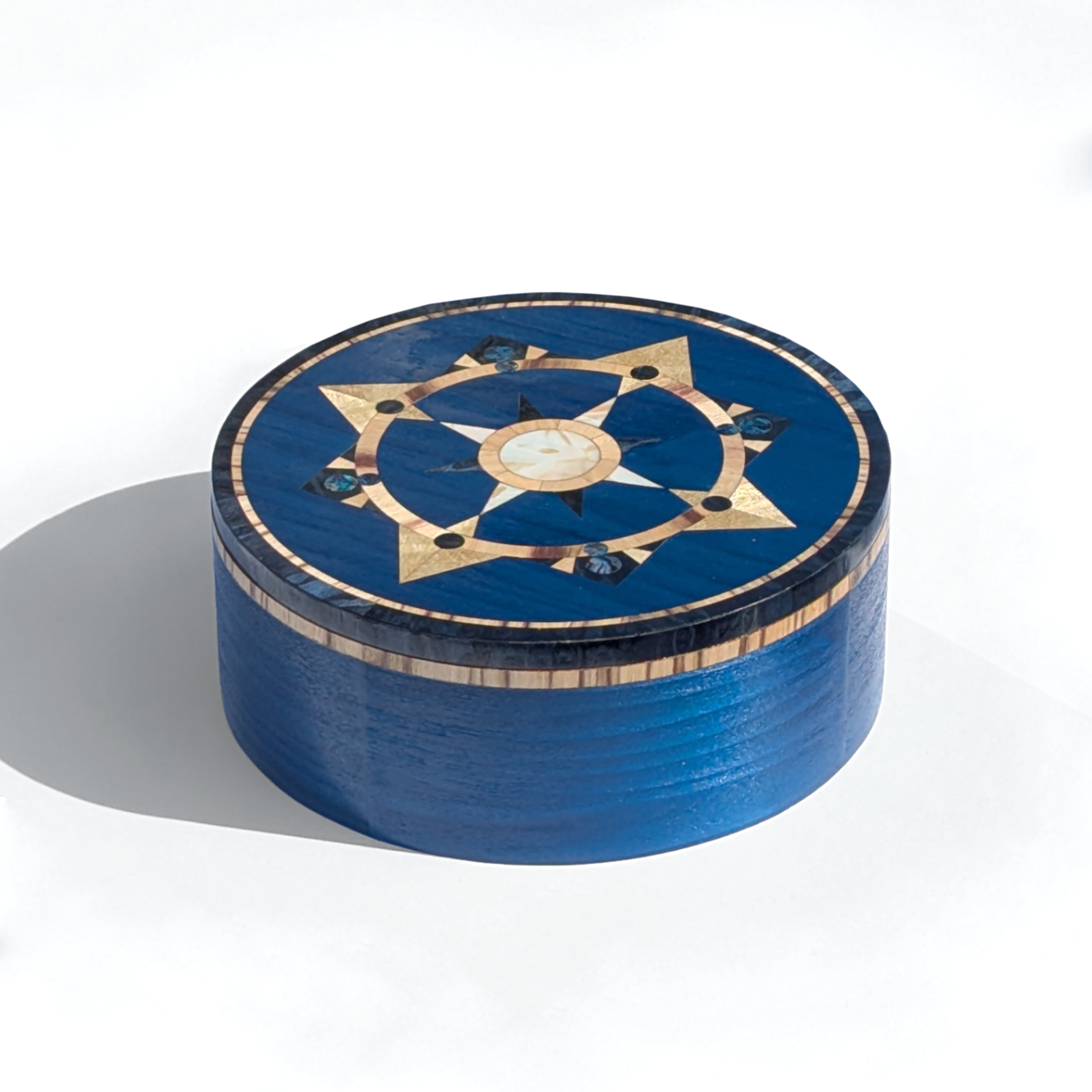 Stow your treasures with the Celestial Compass, a masterpiece of precision marquetry. This striking piece features a compass rose meticulously inlaid using mother of pearl, Lime, Abalone, white Macassar Ebony and man-made blue Birdseye Maple. While the main body uses a shimmering blue Tulipwood veneer that evokes the brilliance of both the ocean below and sky above.