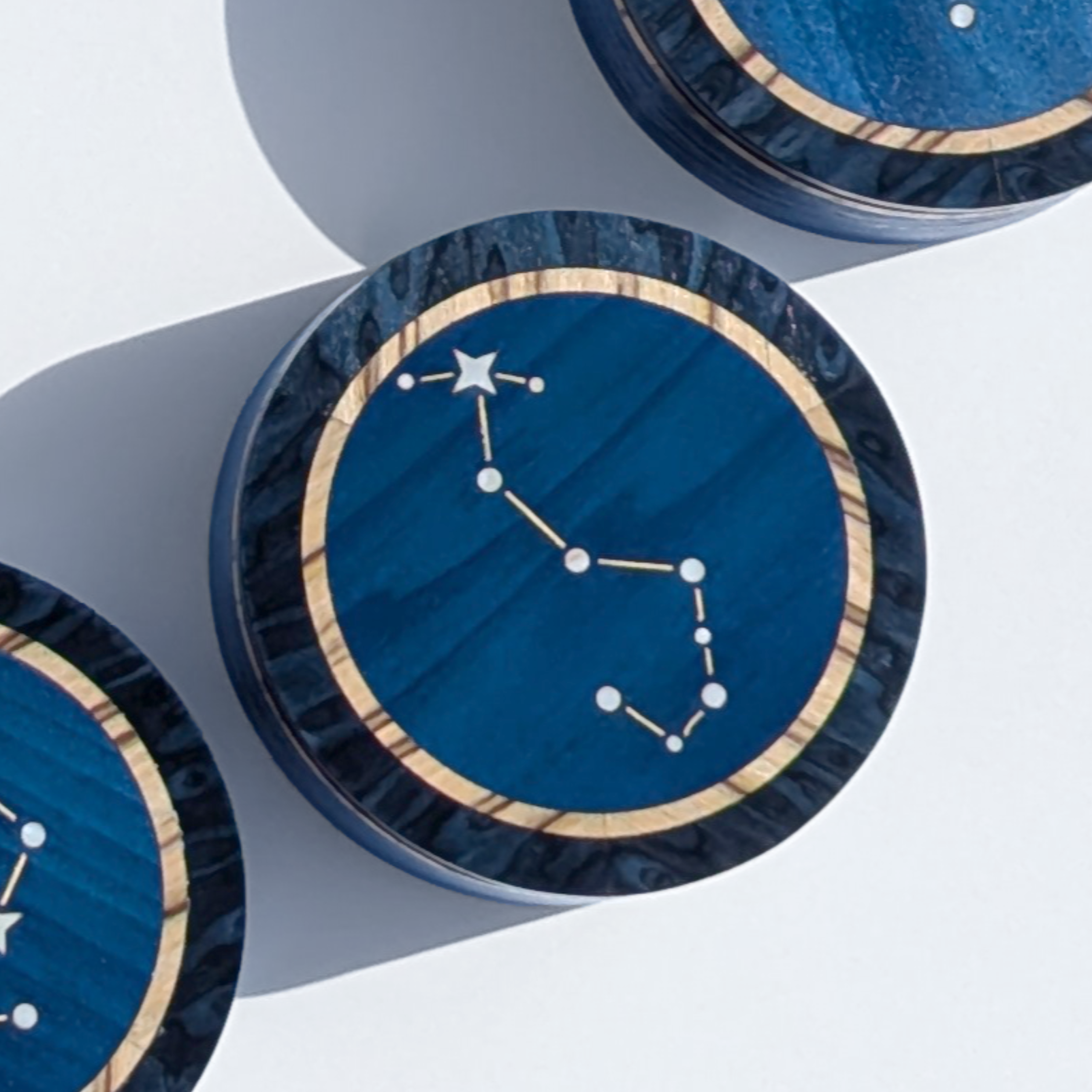 Designed for the discerning collector, this circular keepsake box showcases the precision of artisanal marquetry, featuring blue Tulipwood, white Macassar Ebony and man-made blue Birdseye Maple.